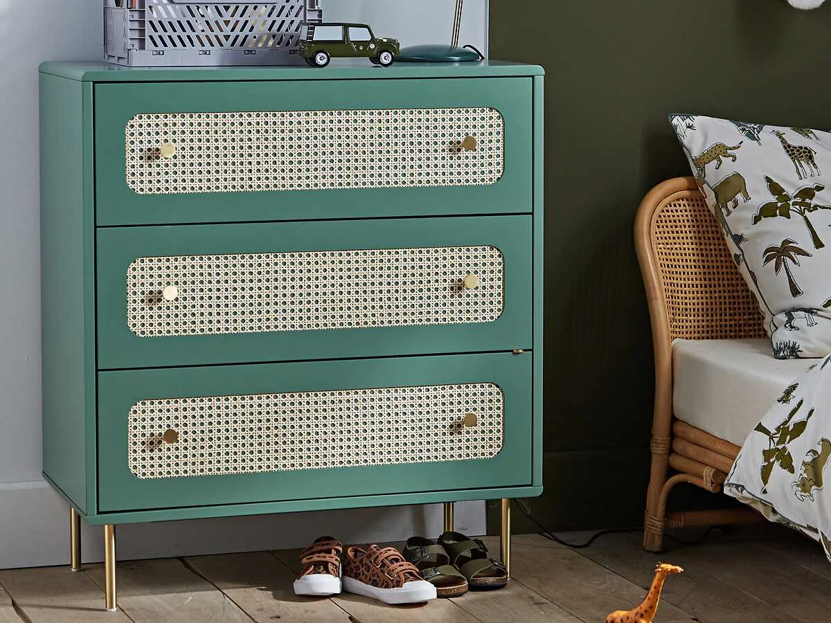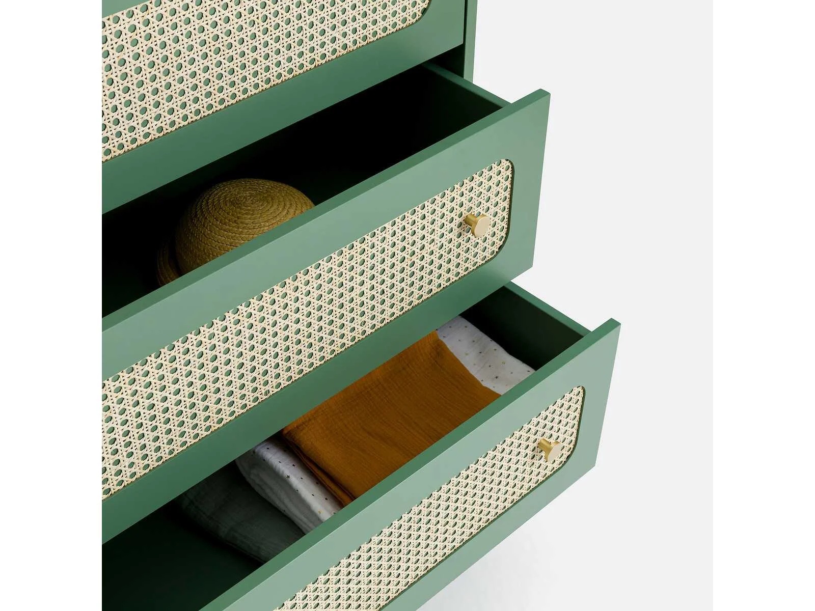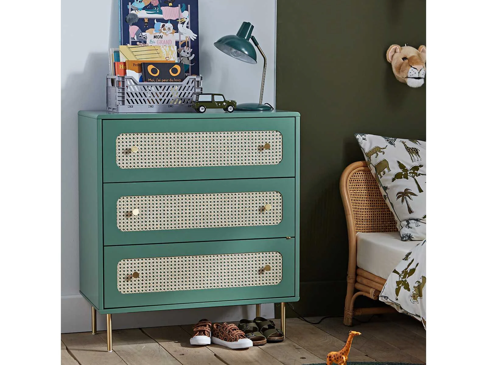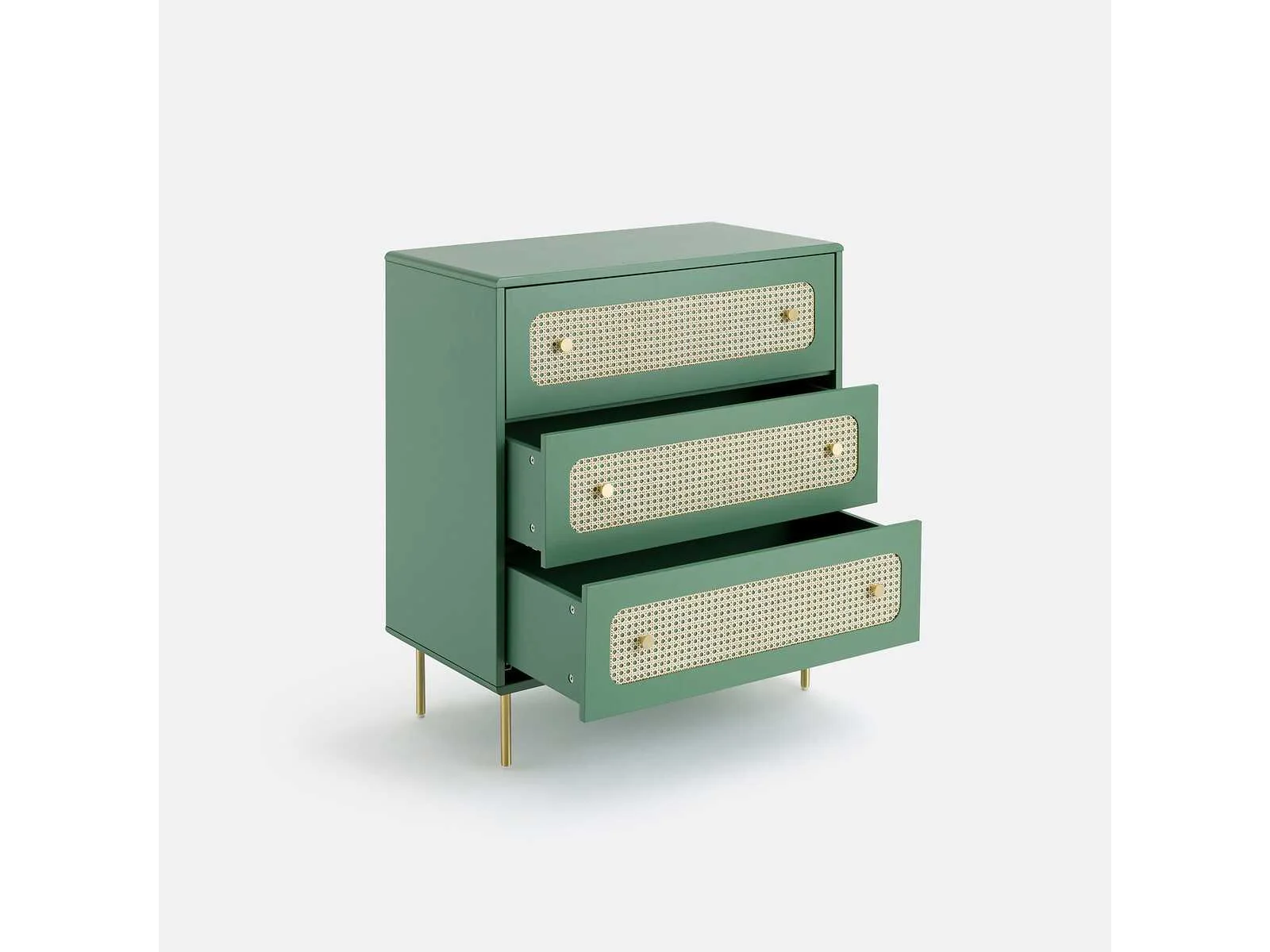 Beschrijving • MDF-structuur met acrylafwerking op waterbasis • Ladefronten met rieten detail • 3 lades • Mat geborsteld metalen onderstel en handgrepen Grootte Totaal • Breedte: 80 cm • Hoogte: 90 cm • Diepte: 42 cm Nuttig • Hoogte lade: 16 cm Non