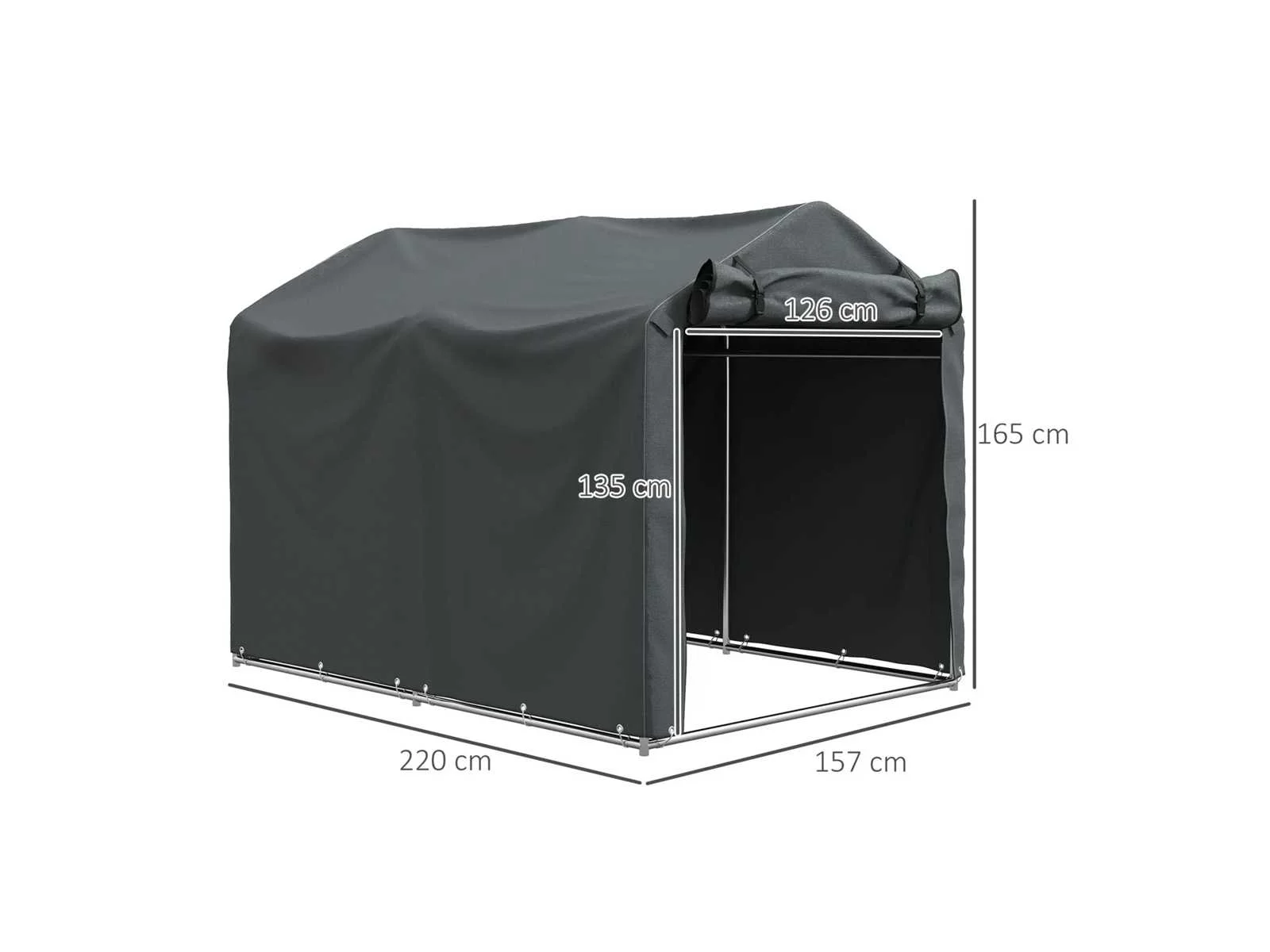 Slaat fietsen, motorfietsen, zwembaduitrusting en meer ruimtelijk op - PE-doek van de tuinopslagtent beschermt tegen water- en UV-schade - De gegalvaniseerde structuur van de motorstalling bestrijdt scheuren, roest en corrosie - Geslepen spijkers en scheerlijnen verbeteren de structurele stabiliteit - Verwijderbare deur met ritssluiting zorgt voor gemakkelijke toegang en goede ventilatie - Montage vereist Specificaties: - Kleur: donkergrijs - Materialen: gegalvaniseerd metaal, PE-stof - Totale afmetingen: 220W x 157D x 165H cm - Hoogte dakrand: 131 cm - Afstand tussen de kolommen: 240 cm - Afmetingen deur: 126b x 135H cm Non