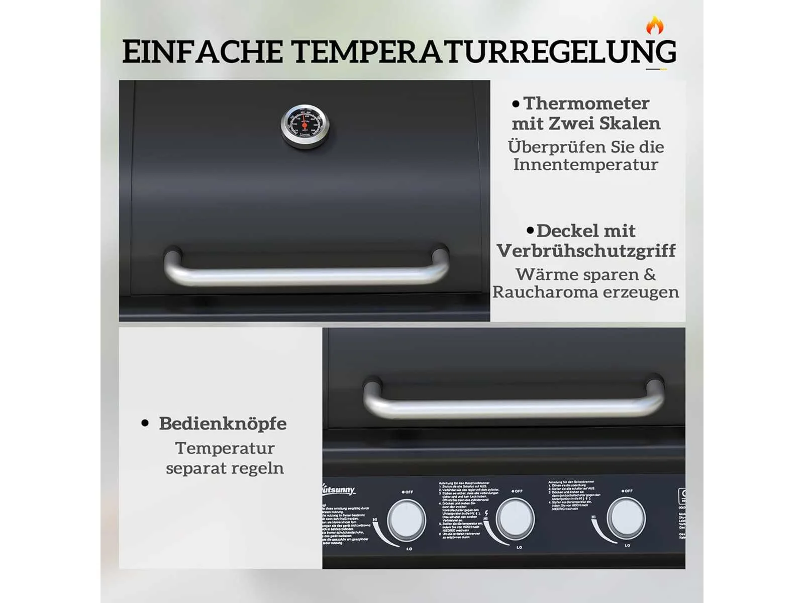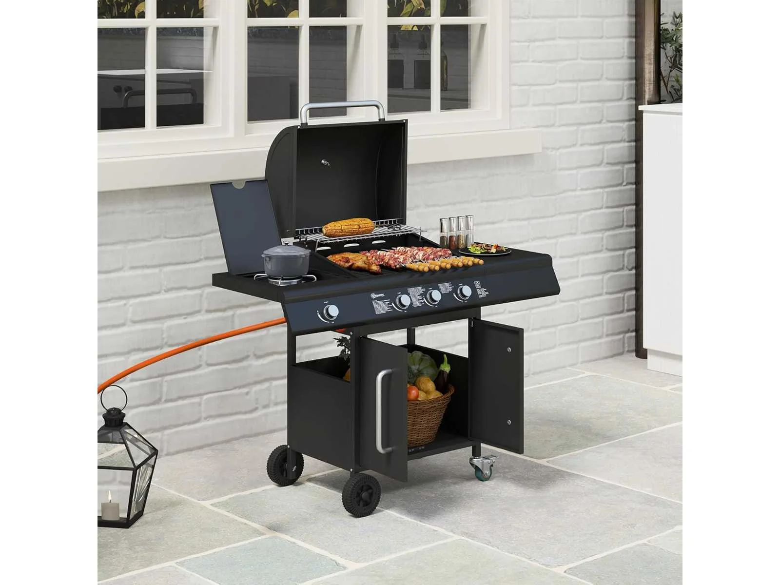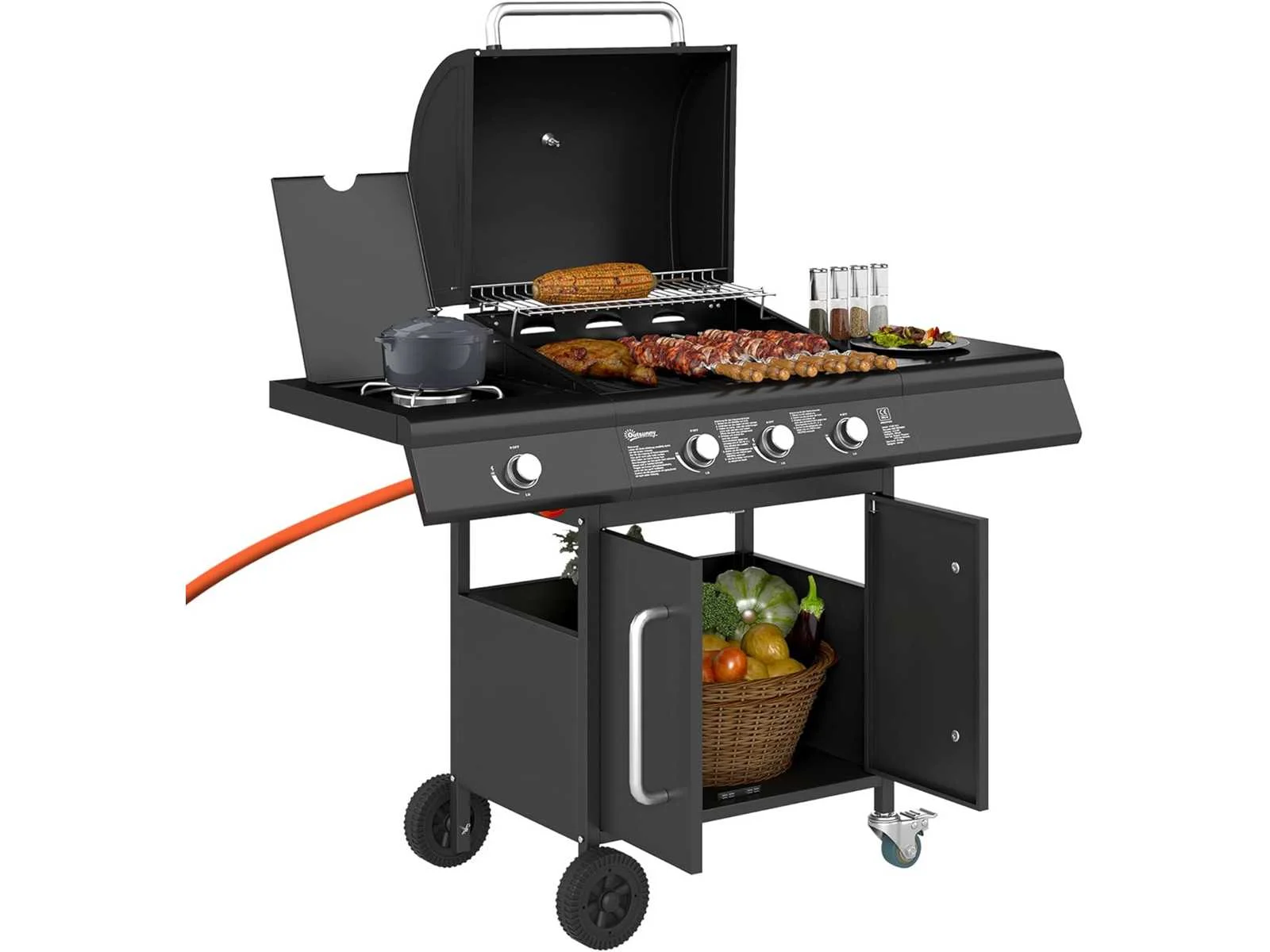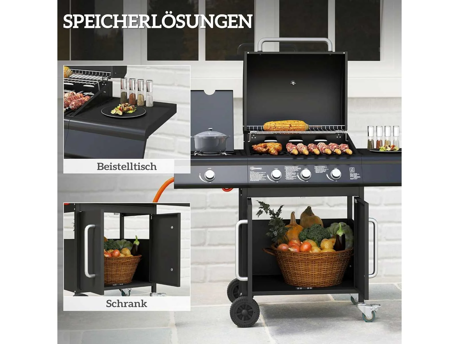 Met de zijbrander van de gasgrill kun je tegelijkertijd koken 1900 cm² kookoppervlak met warmhoudrooster, dat plaats biedt aan 4 tot 8 personen Individuele piëzo-ontsteking en regeling voor elke brander Veelzijdige opbergruimtes, waaronder een kast en bijzettafel Deksel met handvat voor een rokerige smaak, ingebouwde thermometer voor temperatuurregeling De uitneembare vetopvangbak van de gasgrill maakt het schoonmaken eenvoudig Vier wielen van de gasgrill maken het gemakkelijk om hem te verplaatsen, inclusief twee stuurwielen voor een stabiele positie Montage vereist. Regelaar en slang inbegrepen. Kleur: Zwart Materiaal: staal, roestvrij staal, kunststof Brandstoftype Propaan, Butaan Elektrische hoofdbrander 3 kW Vermogen zijbrander 3,2 kW Algemene afmetingen: 118,5 L x 56 B x 110 H cm Afmetingen kookrooster: Individueel 25 B x 38 D cm Afmetingen verwarmingsrek: 47 B x 14 D cm Binnenafmetingen van de kast: 60 B x 40 D x 46 H cm Afmetingen bijzettafel: 32 B x 39 D cm Afmetingen vetopvangbak: 53,5 B x 34 D cm Lengte slang 100 cm Draagvermogen: 10 kg kookrooster, 6 kg bijzettafel Non