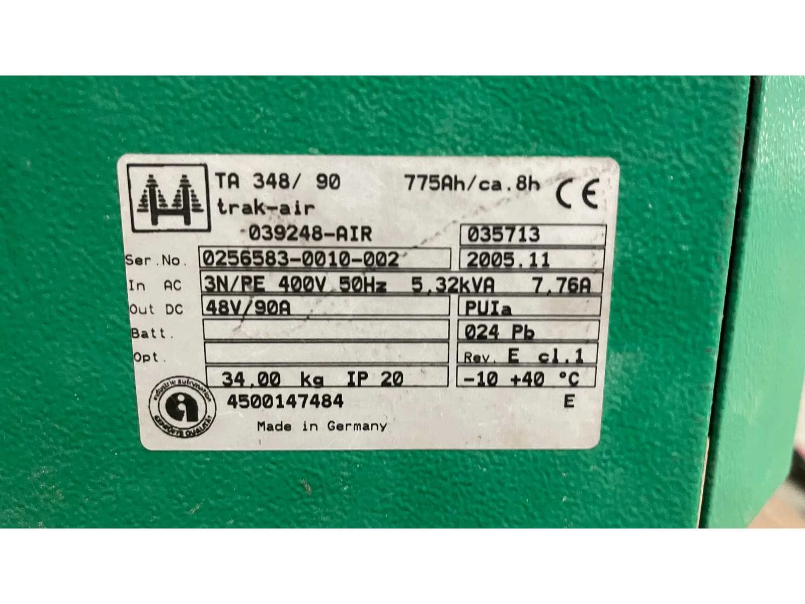 Niet in werkende staat 5,32kVA Output DC 48V/90A No Merk: Hoppecke Type: TRAK-AIR TA 348/90 Spanning: 400V Totale afmeting L: 530mm Totale afmeting Breedte: 380mm Totale afmeting Hoogte: 600mm