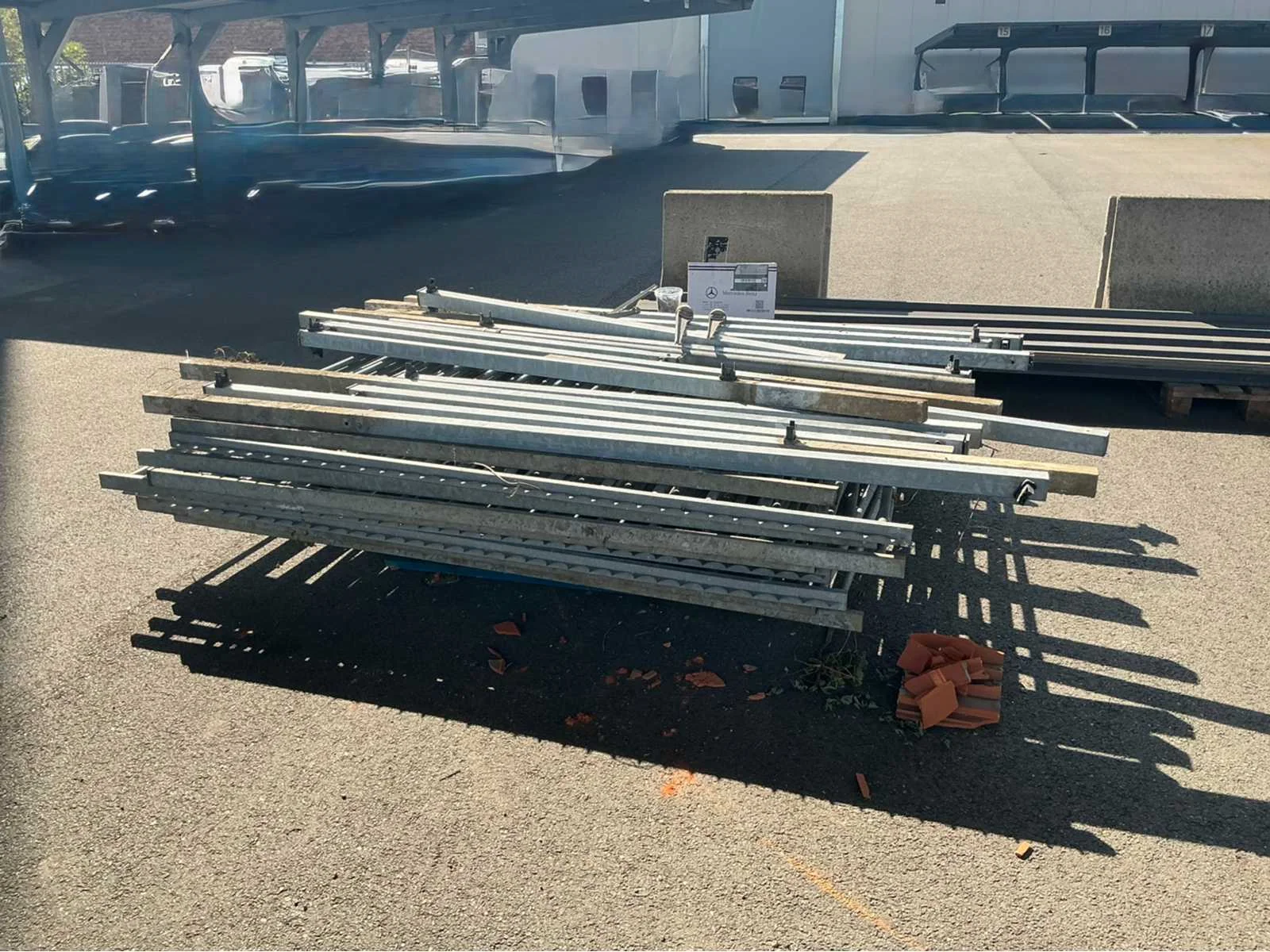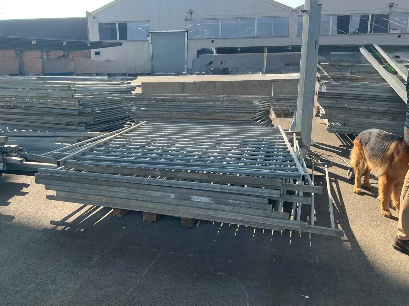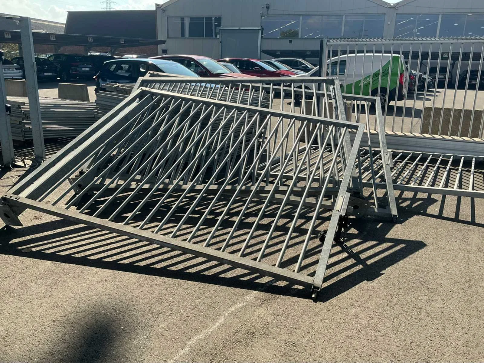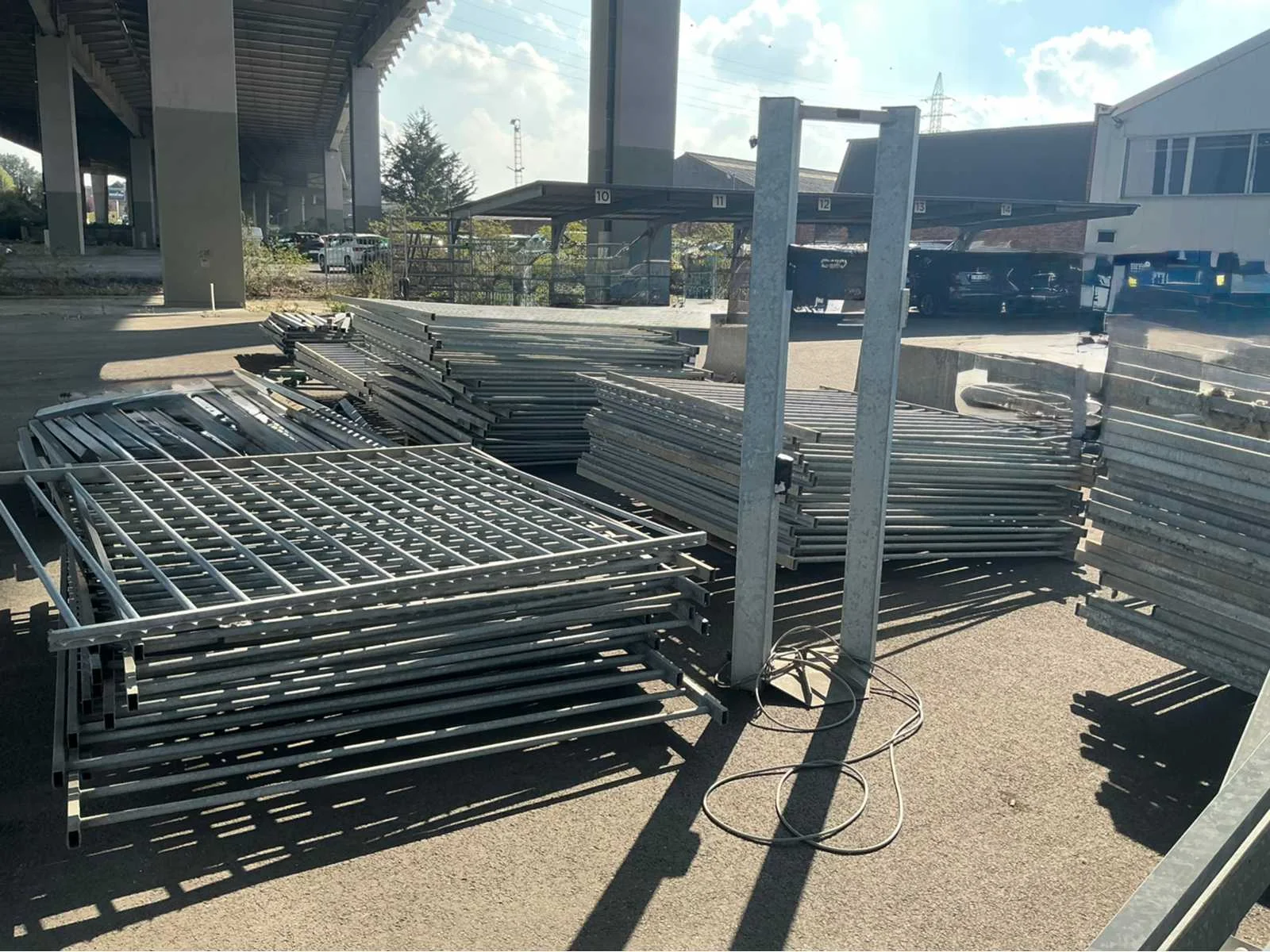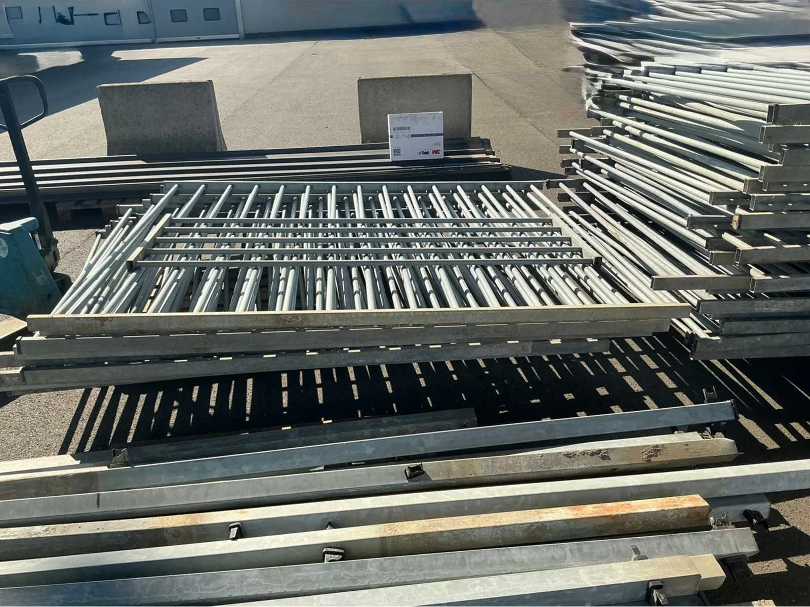 Reeds gedemonteerd. +- 100m in totaal met hekken van 2.50 m per stuk, 1 elektrische poort van 2x 6.7 m met code systeem en 2 x manuele poorten van 2.4 x 3.5 m. En 4 x 2.95 m. Eveneens bevestigingen inbegrepen waarbij slechts enkelen wat scheef zijn doordat ze in de beton gegoten waren. No Merk: B&G Product type: Bircher Breedte: 190 Hoogte: 225 Materiaal: IJzer