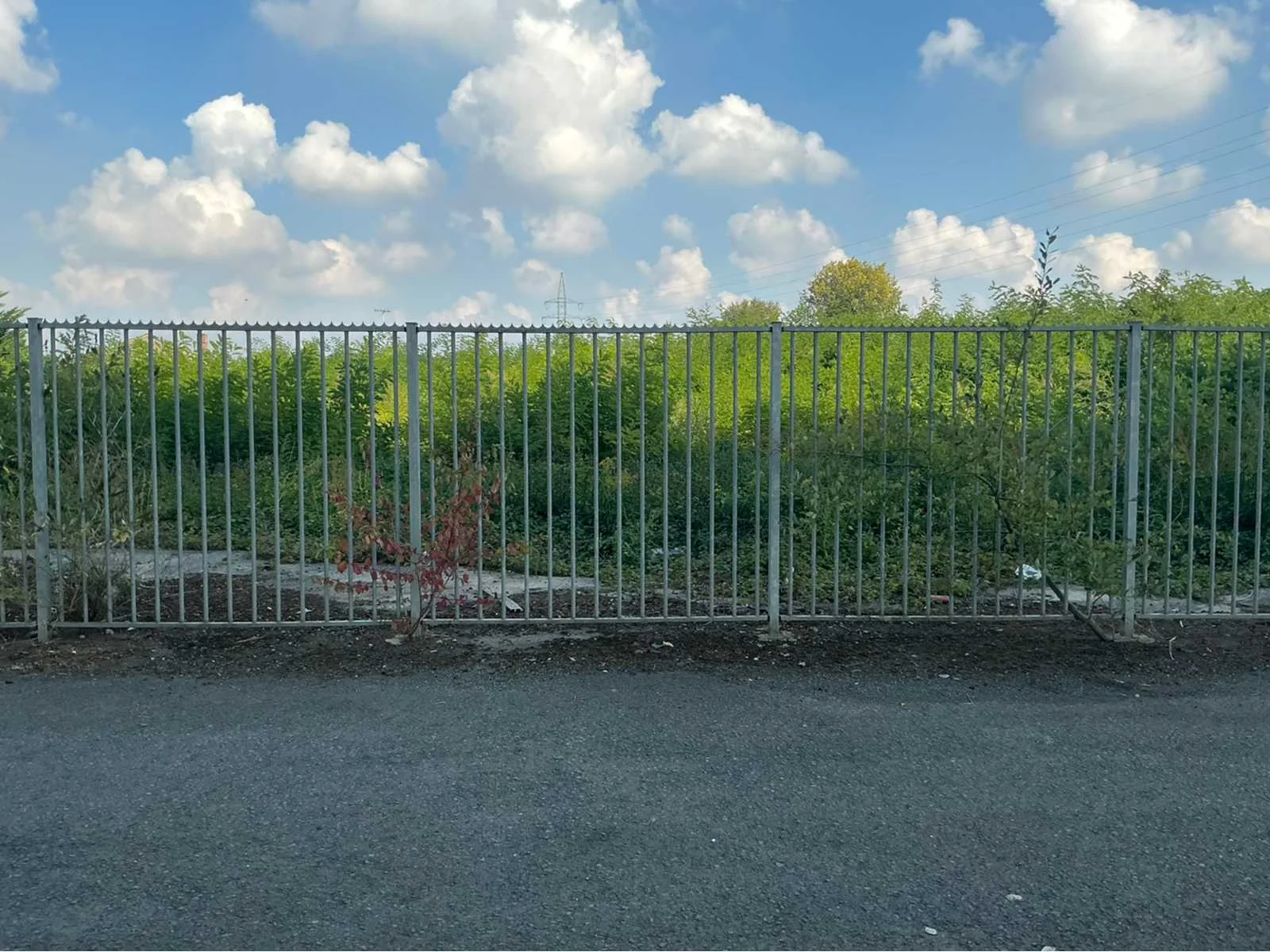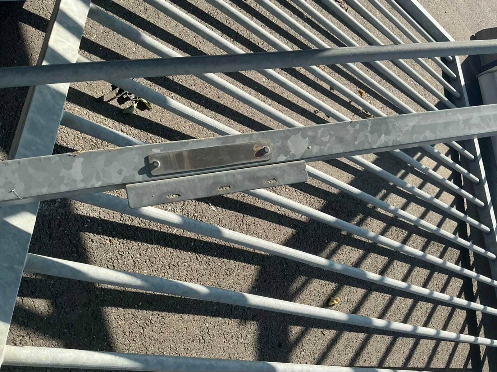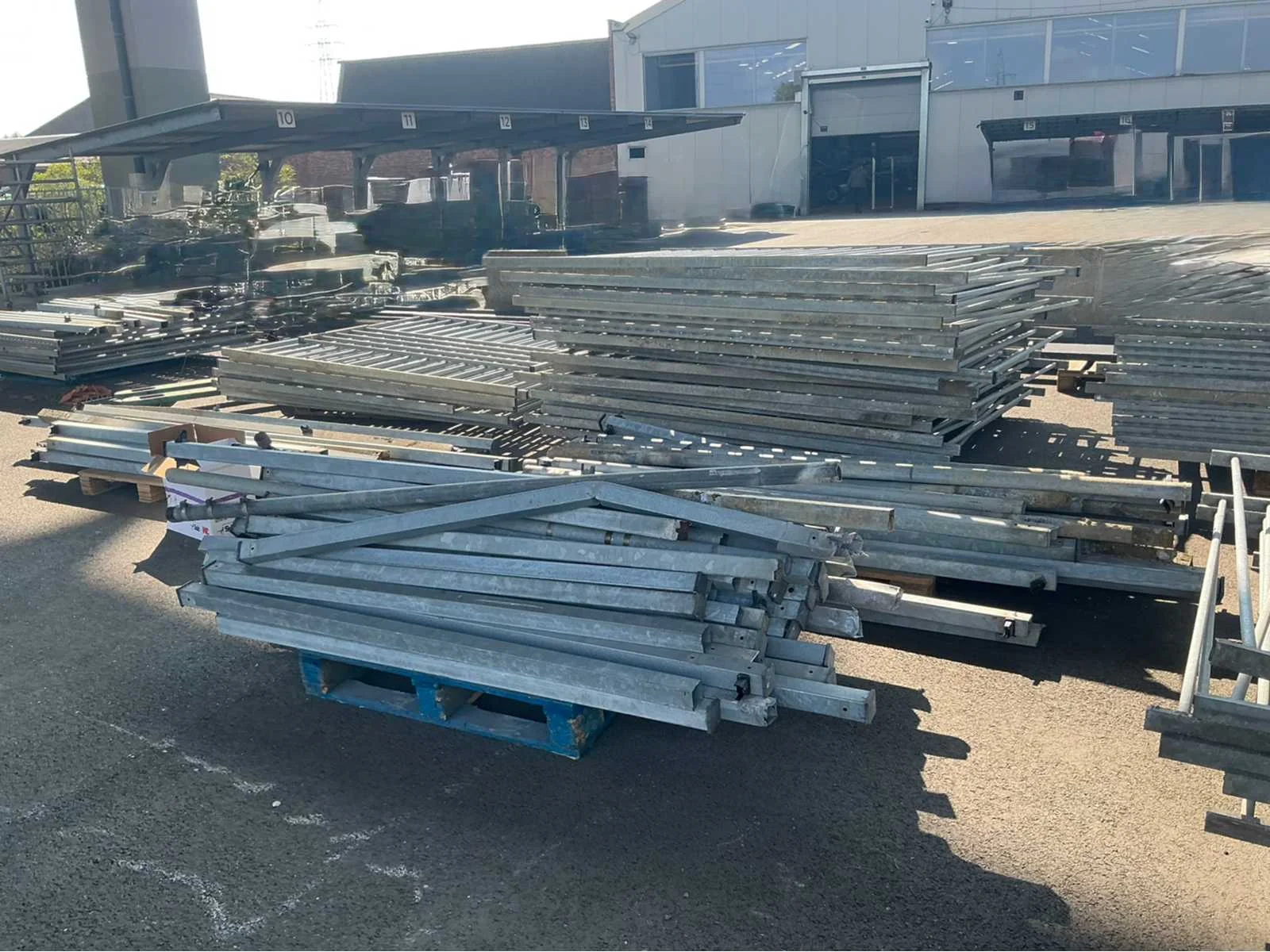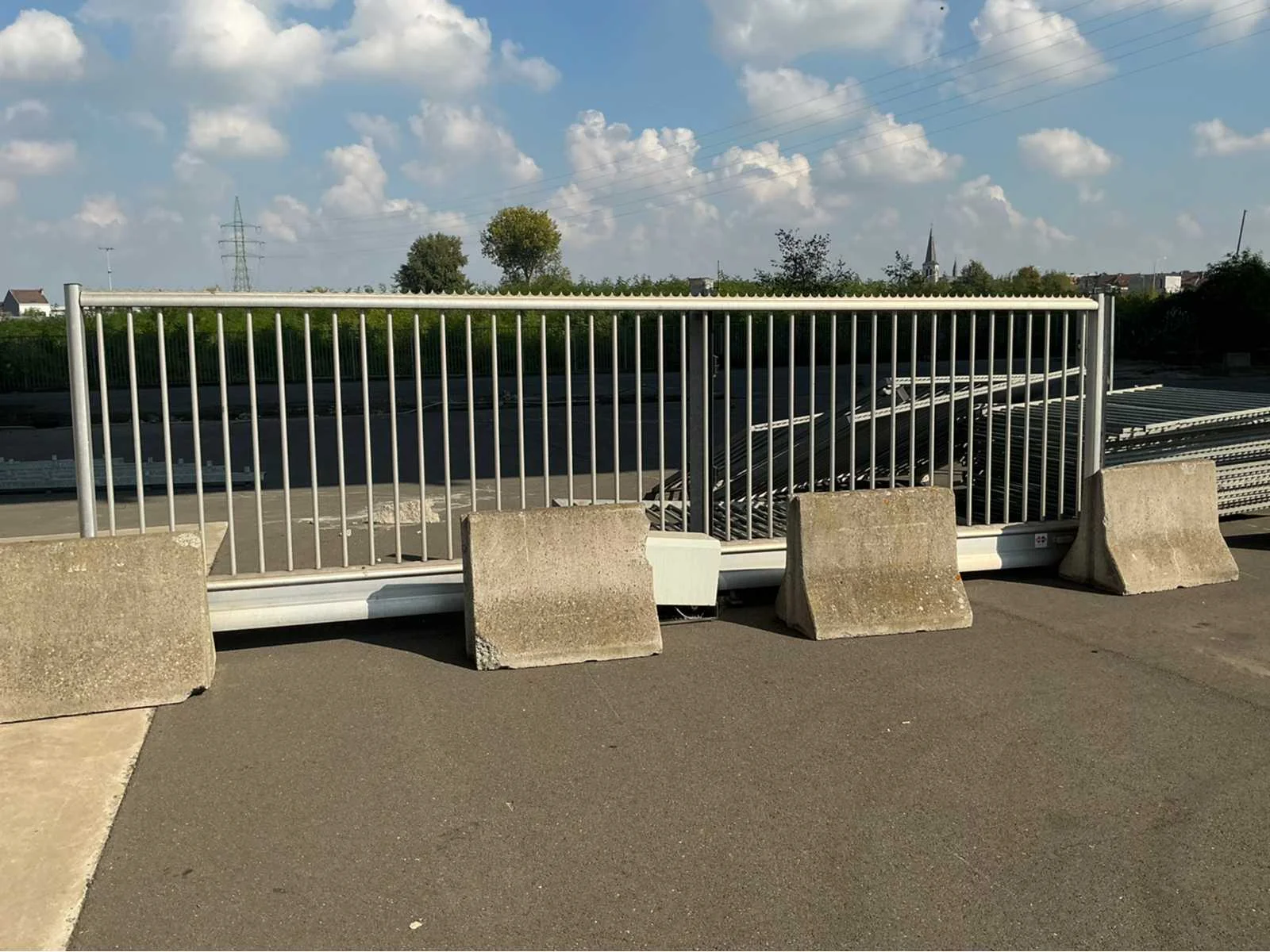 Reeds gedemonteerd. +- 100m in totaal met hekken van 2.50 m per stuk, 1 elektrische poort van 2x 6.7 m met code systeem en 2 x manuele poorten van 2.4 x 3.5 m. En 4 x 2.95 m. Eveneens bevestigingen inbegrepen waarbij slechts enkelen wat scheef zijn doordat ze in de beton gegoten waren. No Merk: B&G Product type: Bircher Breedte: 190 Hoogte: 225 Materiaal: IJzer