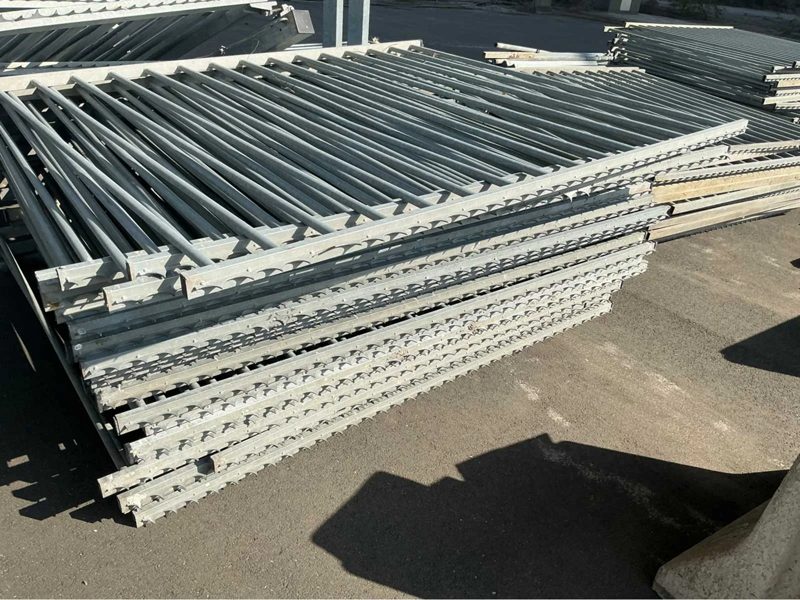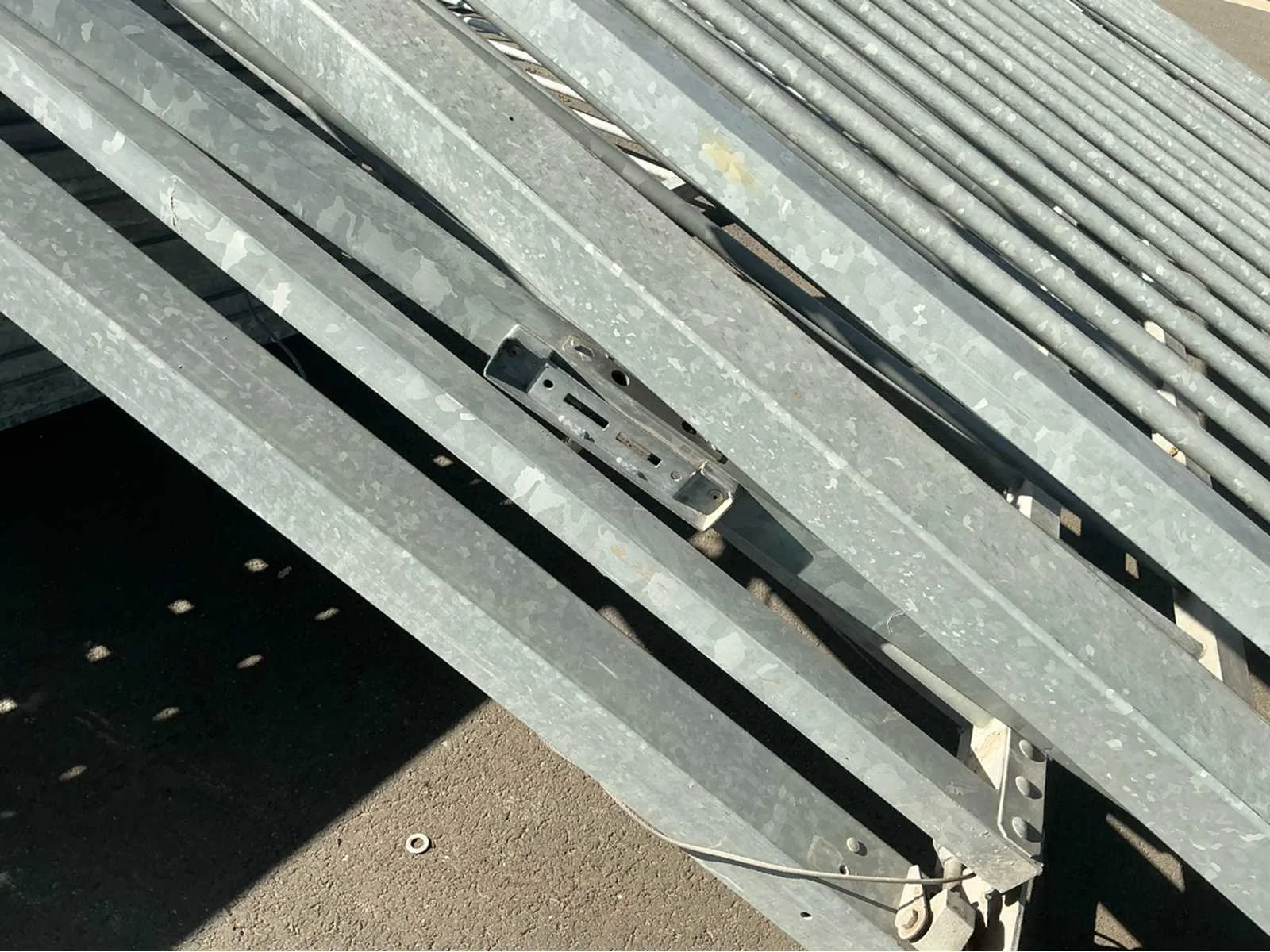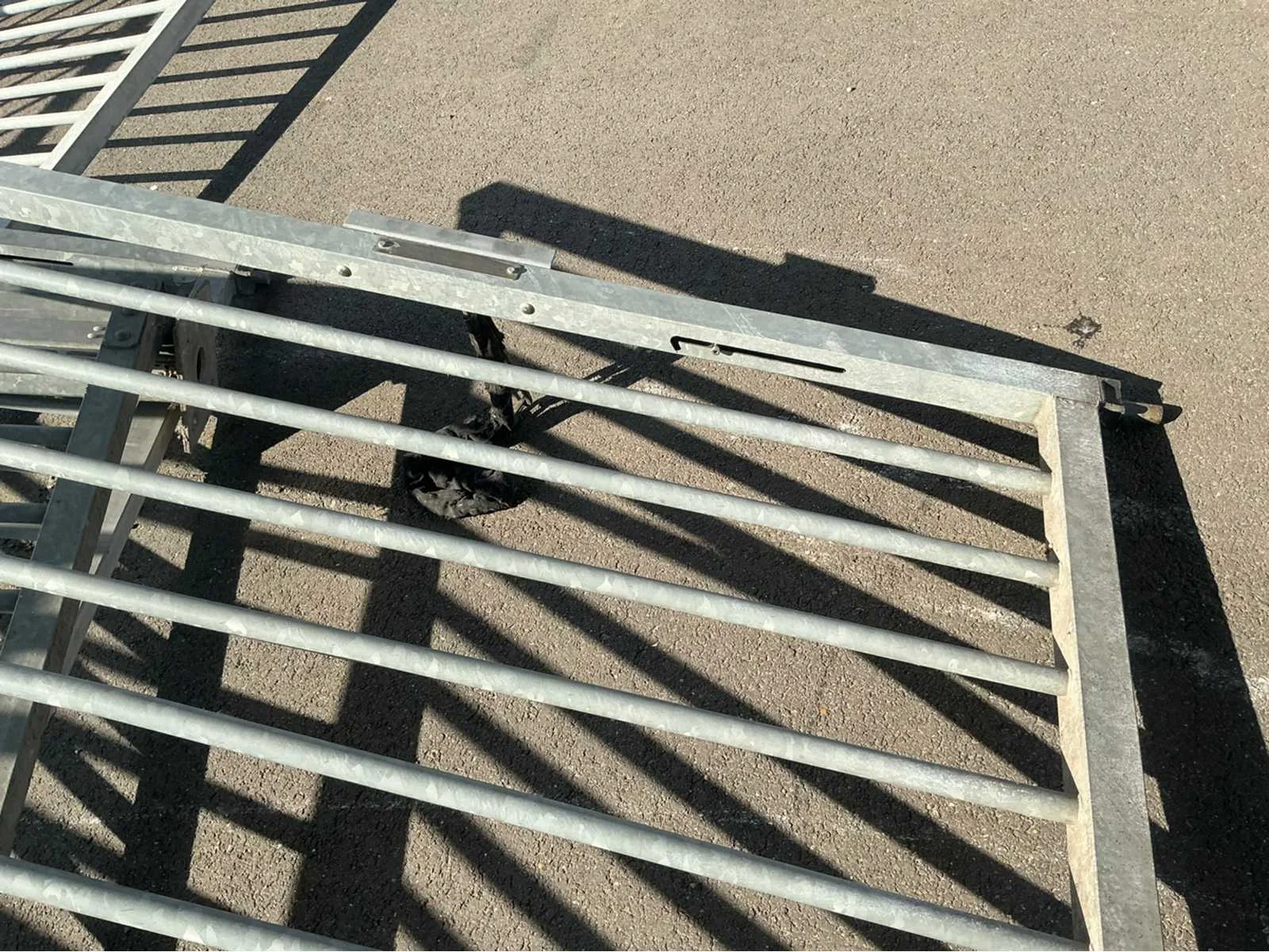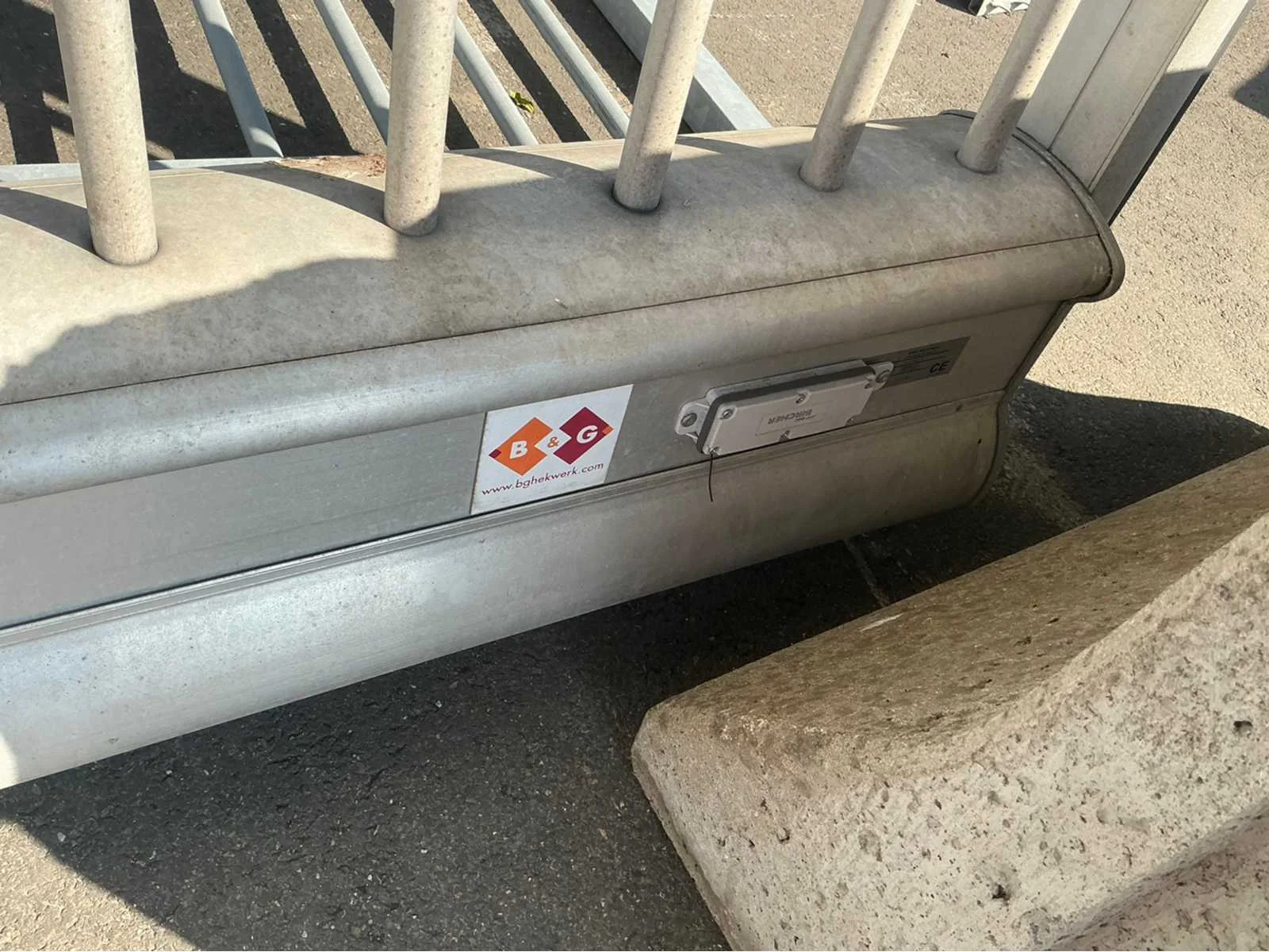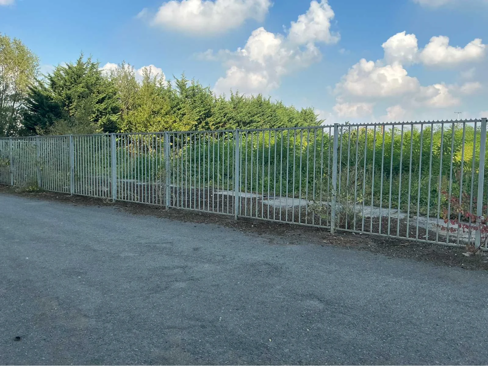 Reeds gedemonteerd. +- 100m in totaal met hekken van 2.50 m per stuk, 1 elektrische poort van 2x 6.7 m met code systeem en 2 x manuele poorten van 2.4 x 3.5 m. En 4 x 2.95 m. Eveneens bevestigingen inbegrepen waarbij slechts enkelen wat scheef zijn doordat ze in de beton gegoten waren. No Merk: B&G Product type: Bircher Breedte: 190 Hoogte: 225 Materiaal: IJzer