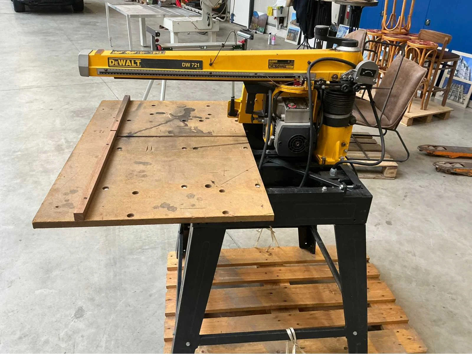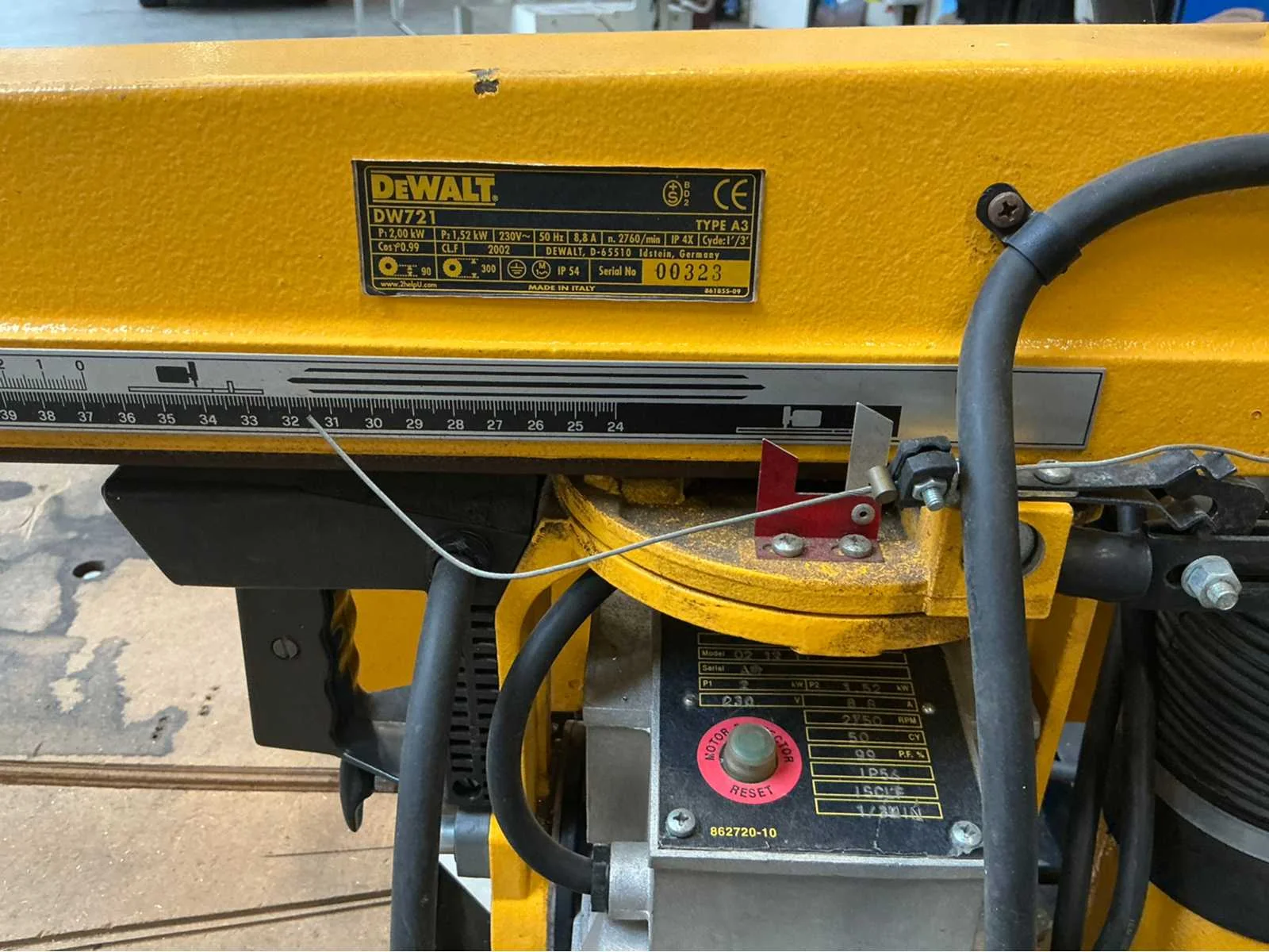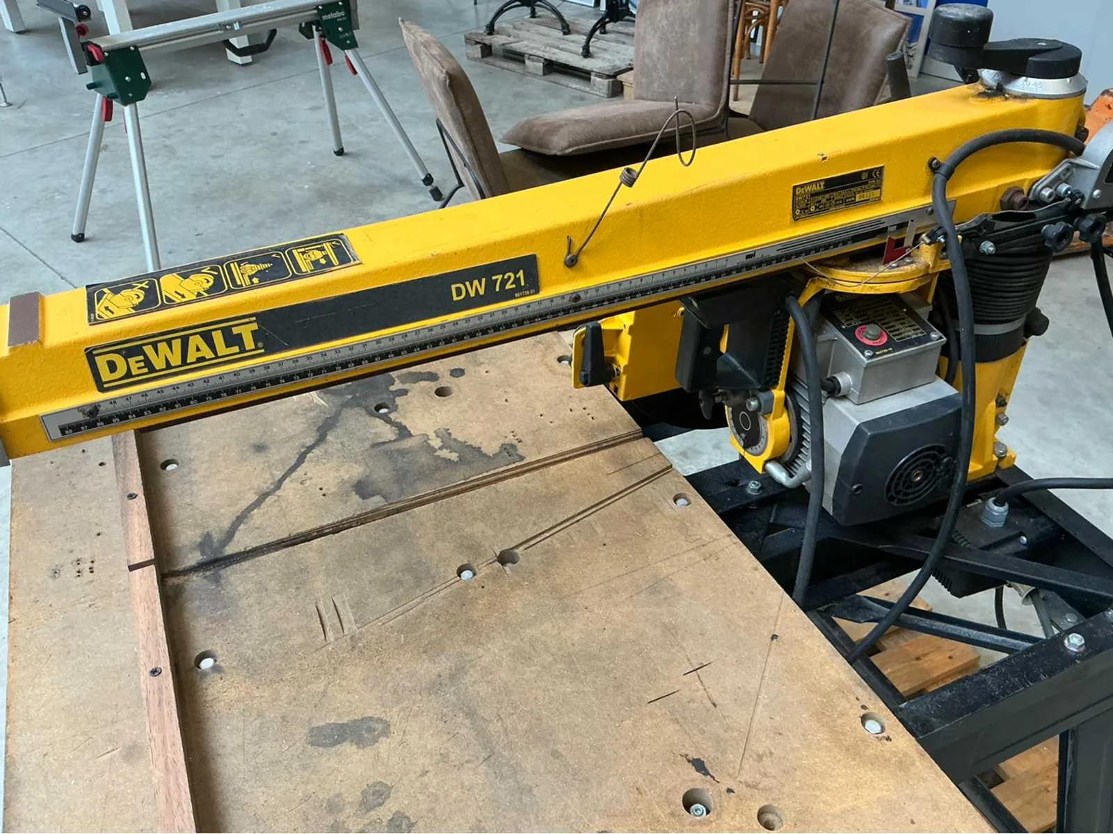 DeWalt DW721 Radiaalzaag (Radial Arm Saw), een klassiek en professioneel model dat vaak in meubelmakerijen en timmerwerkplaatsen gebruikt wordt. Nee Merk: DeWalt Type: DW 721 Serienummer: 00323 Spanning: 230 Vermogen: 2000W Leveringsvoorwaarden: Heftruck aanwezig