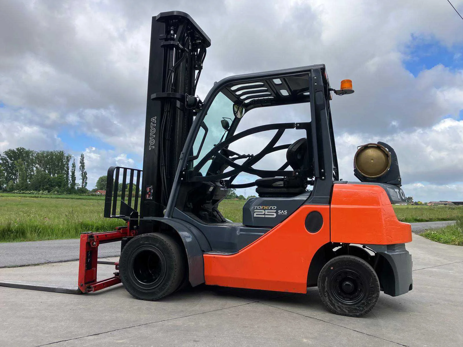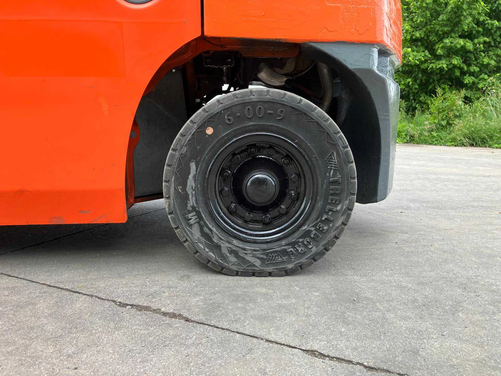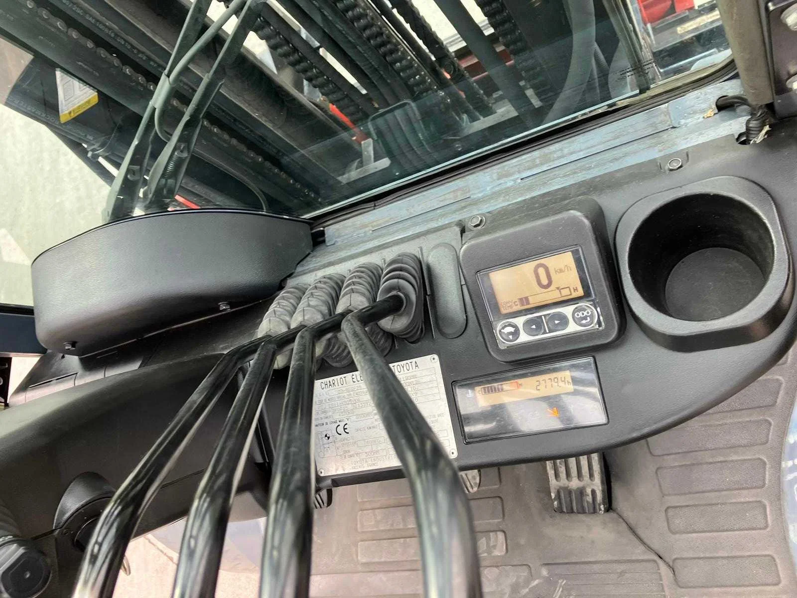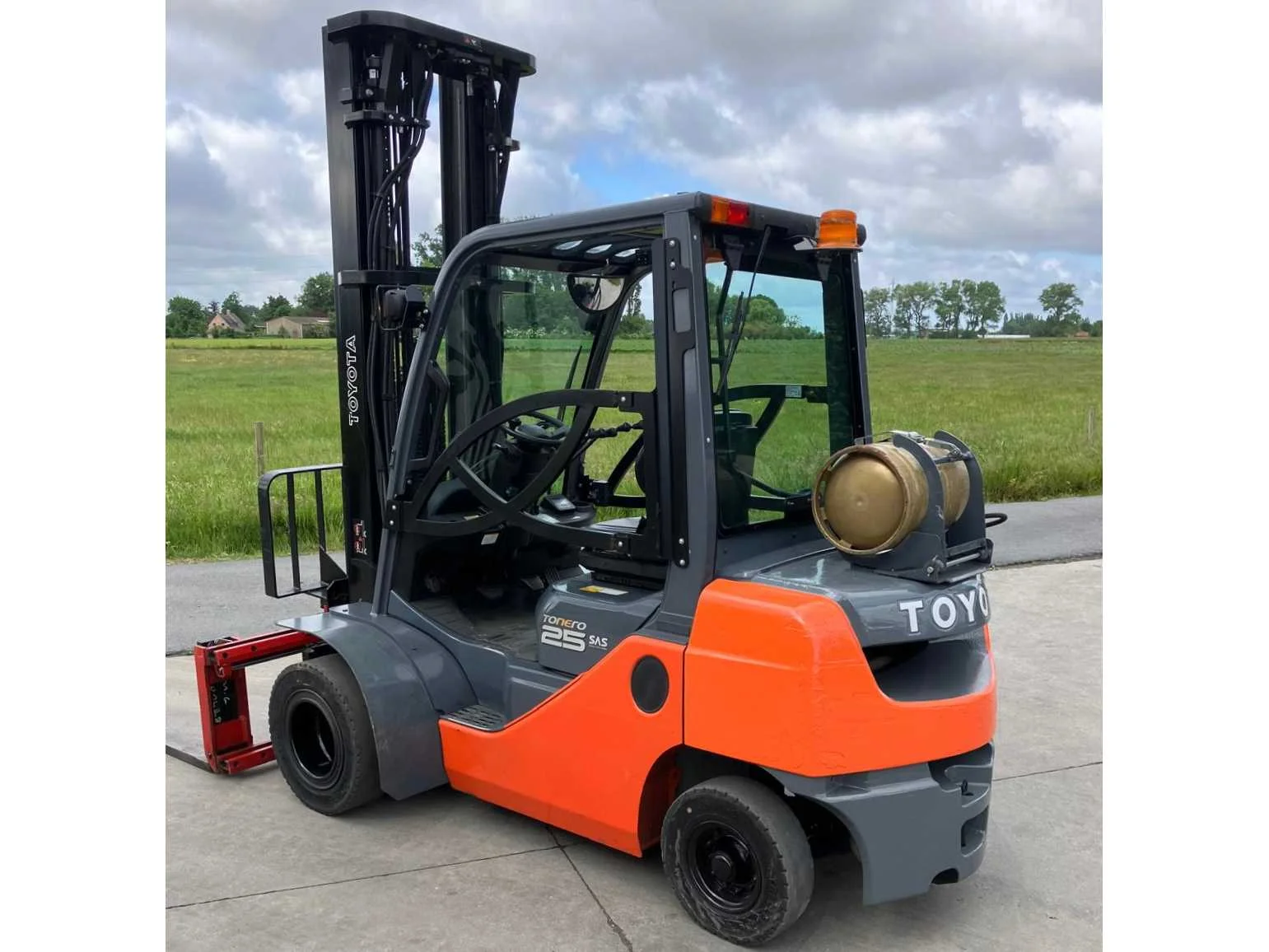 Vermogen: 41 kW , Bolzoni vorkversteller No Merk: Toyota Type: 02-8FGF25 Bouwjaar: 2010 Serienummer: 13392 Brandstof: LPG Mast: triplex Soort band: Volrubber banden Aantal wielen: 4 Afgelezen urenstand: 2779 Side-shift: true Hydraulisch verstelbare lepels: true Triple mast: true Eigen gewicht: 4570kg Hefvermogen: 2500kg Lepellengte: 1200mm Min. hefhoogte: 0mm Max. hefhoogte: 6500mm Hefhoogte: 6500mm Vol rubber banden: true Minimale doorrijhoogte: 0mm Totale afmeting L: 2800mm Totale afmeting Breedte: 1100mm Totale afmeting Hoogte: 3000mm LPG: true