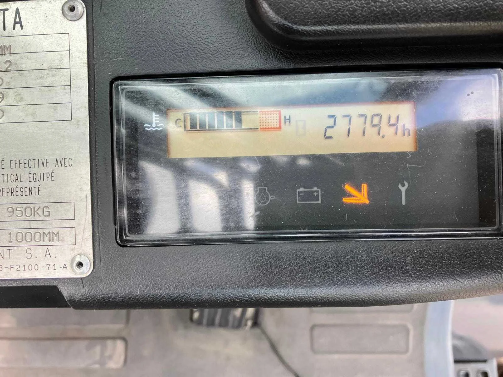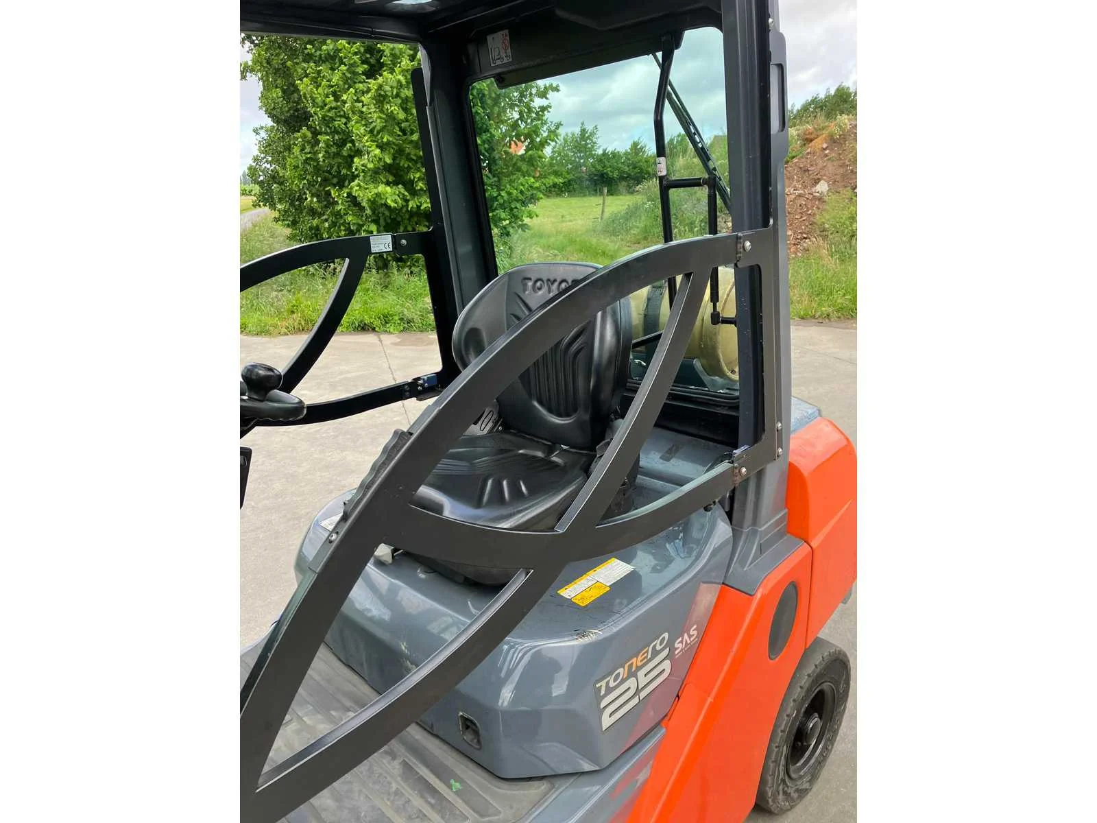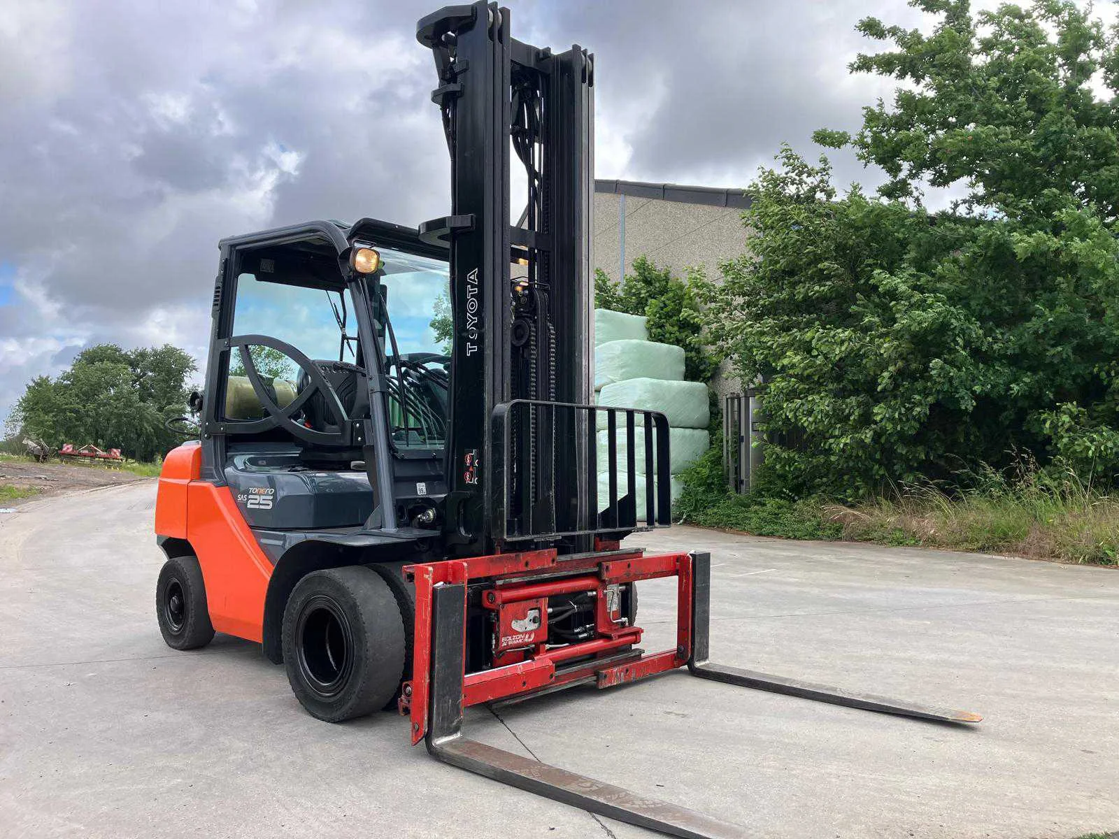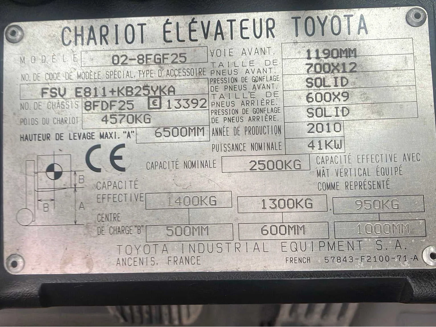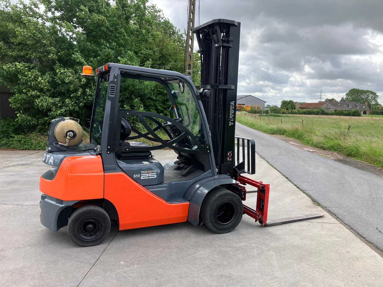Vermogen: 41 kW , Bolzoni vorkversteller No Merk: Toyota Type: 02-8FGF25 Bouwjaar: 2010 Serienummer: 13392 Brandstof: LPG Mast: triplex Soort band: Volrubber banden Aantal wielen: 4 Afgelezen urenstand: 2779 Side-shift: true Hydraulisch verstelbare lepels: true Triple mast: true Eigen gewicht: 4570kg Hefvermogen: 2500kg Lepellengte: 1200mm Min. hefhoogte: 0mm Max. hefhoogte: 6500mm Hefhoogte: 6500mm Vol rubber banden: true Minimale doorrijhoogte: 0mm Totale afmeting L: 2800mm Totale afmeting Breedte: 1100mm Totale afmeting Hoogte: 3000mm LPG: true