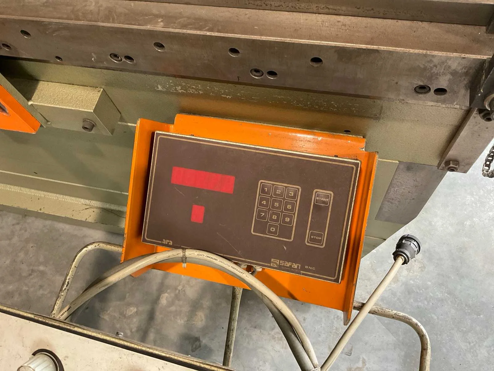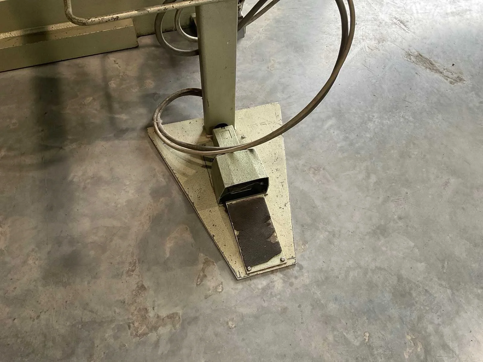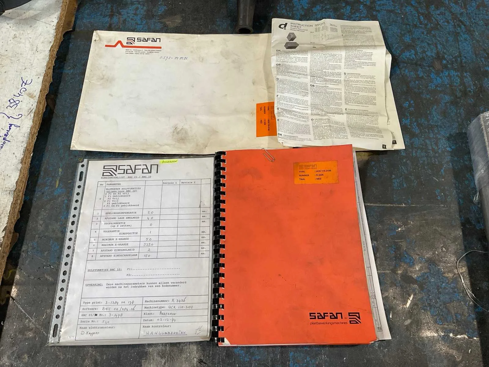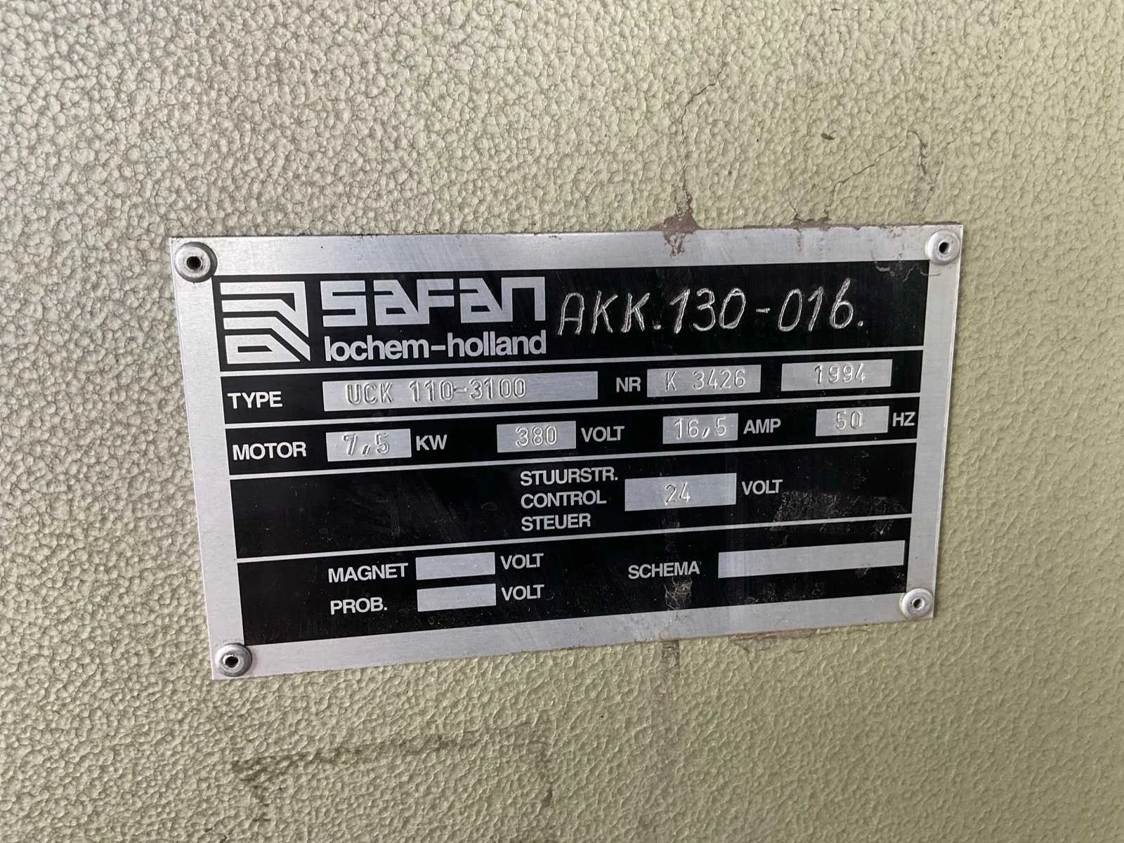 Plooibank , tot lengtes 3100mm dikte plooien 6mm. Werkende staat. Digitale uitlezing en elektrische achteraanslag : incl rechte messenset gemonteerd. Nee Merk: Safan Type: UCK110-3100 Bouwjaar: 1994 Capaciteit.: 110t Elektrisch aangedreven: true Motorvermogen (kW): 7.5kW Aansluiting: 330V Machinegewicht: 8kg Afmeting l: 1700mm Afmeting b: 3300mm Afmeting h: 2550mm Leveringsvoorwaarden: Transport zelf te voorzien , vrachtwagen met kraan .