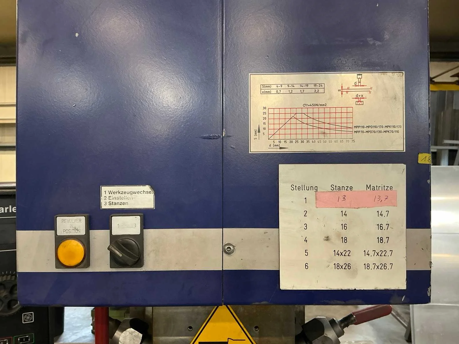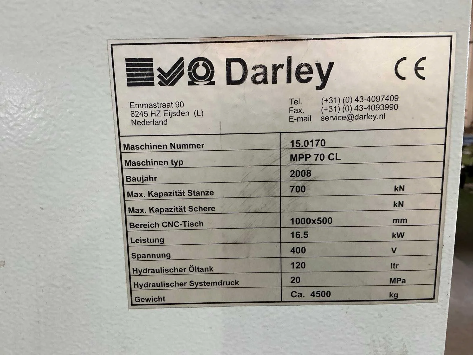 Nee Merk: Darley Type: MPP70CL Bouwjaar: 2008 Capaciteit.: 70t Max. plaat afm. l: 1000mm Max. plaat afm. b: 500mm Max. plaatdikte: 8mm Max. plaatgewicht: 100kg Voetbediening: true Digitale uitlezing: true Motorvermogen (kW): 16.5kW Aansluiting: 400V Machinegewicht: 4500kg