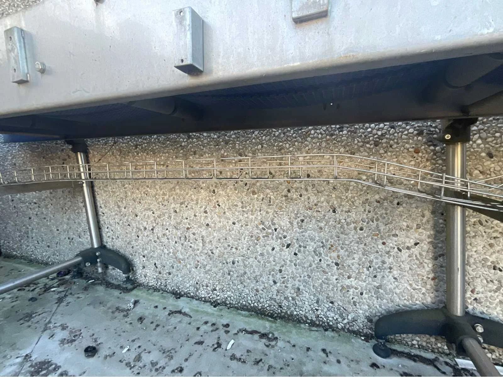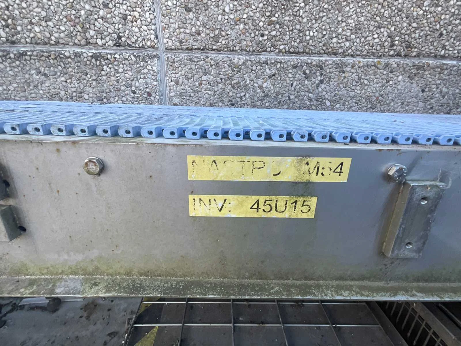 Industriële RVS transportband, merk Coman Group, voorzien van een blauwe kunststof modulaire transportband. Lengte ca. 6 m, bruikbare breedte ca. 40-50 cm, motorisering geïntegreerd in roestvrijstalen kast, verstelbare poten. Robuuste transportband, ideaal voor de voedingsindustrie, verpakking of logistiek. Non Merk: Coman Group Type: MASTP M54 Afmeting l: 6000mm Afmeting b: 400mm