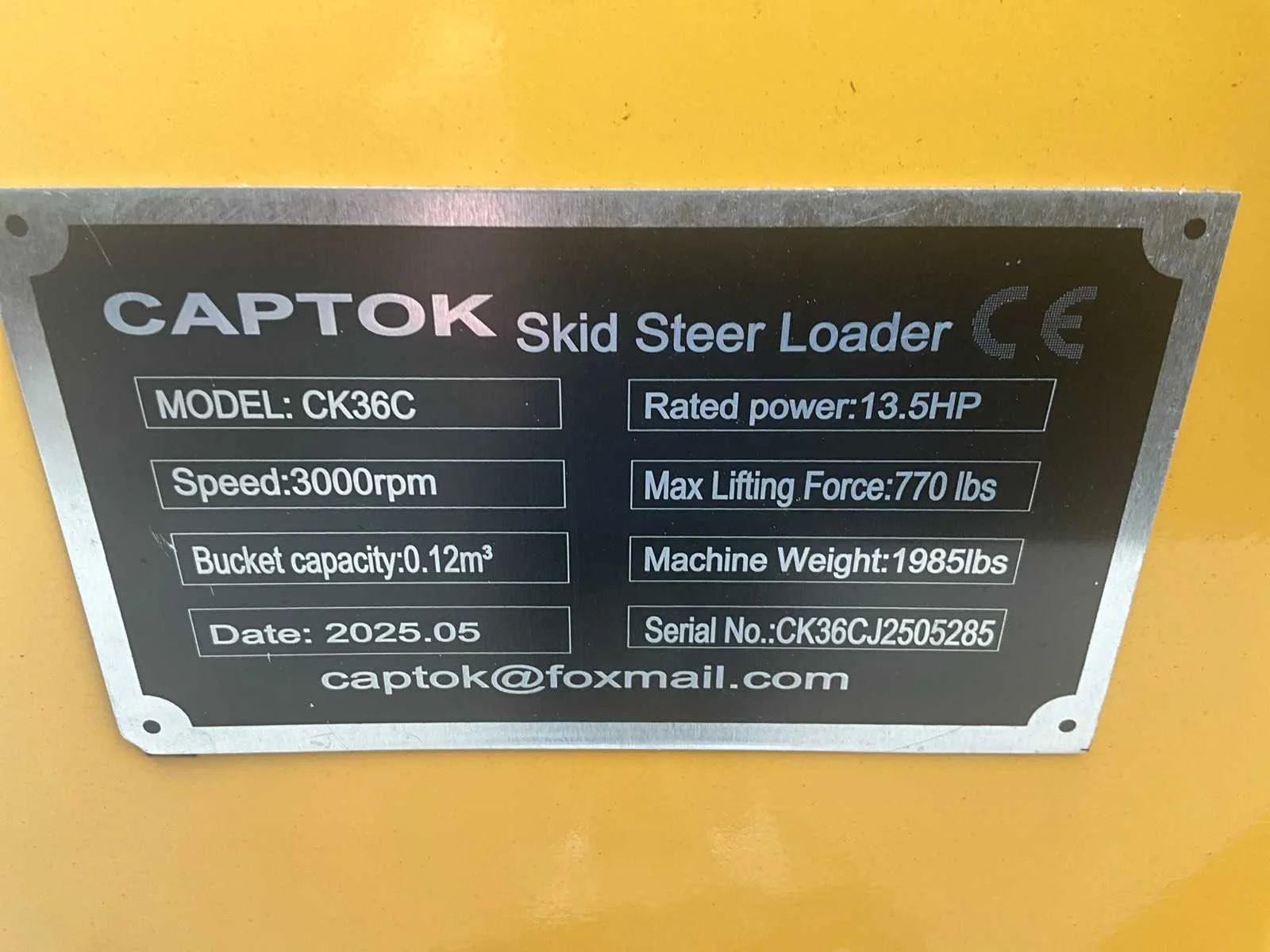 CAPTOK CK36C mini skidsteer op rupsen, bouwdatum 05/2025 - Machine is bijna nieuw met slechts 0,2 draai-uren en wordt geleverd met gladde GP-bak - Dankzij de aux-hydrauliek met snelkoppelingen kun je direct wisselen naar borstel, grondboor, hamer, palletvorken, enz. - Ideaal voor hovenier, aannemer, stratenmaker, boer of verbouwer waar smalle doorgangen en gevoelige ondergrond het verschil maken - Bakinhoud: 0,12 m³ (± 120 liter) – GP-bak inbegrepen - Max. hefkracht: 770 lb (± 350 kg) - verkoper kan laden Nee Merk: Captok Type: CK36C Bouwjaar: 2025 Motorvermogen (kW): 10kW Brandstof: benzine Afgelezen urenstand: 0.2 Eigen gewicht: 900kg
