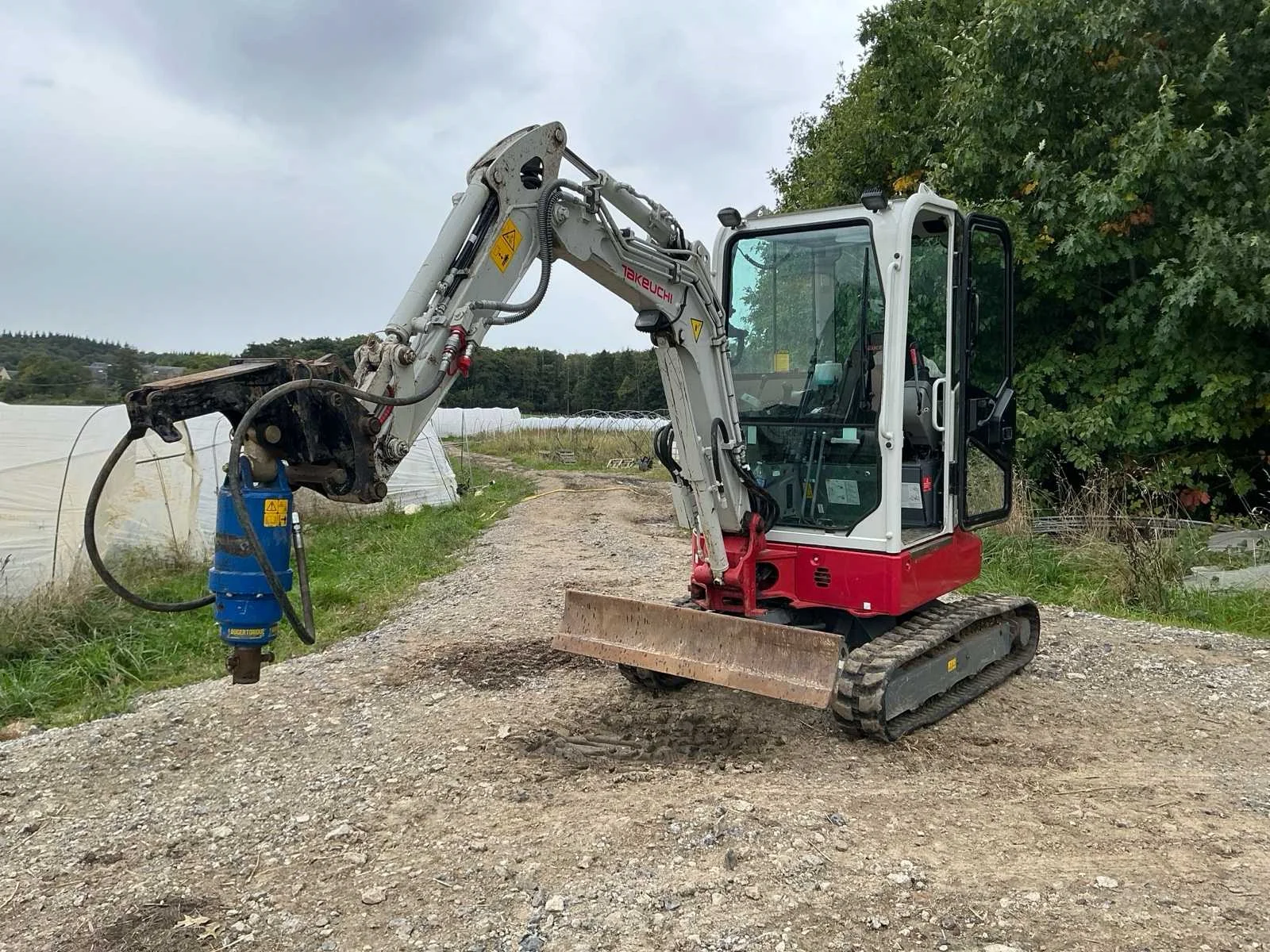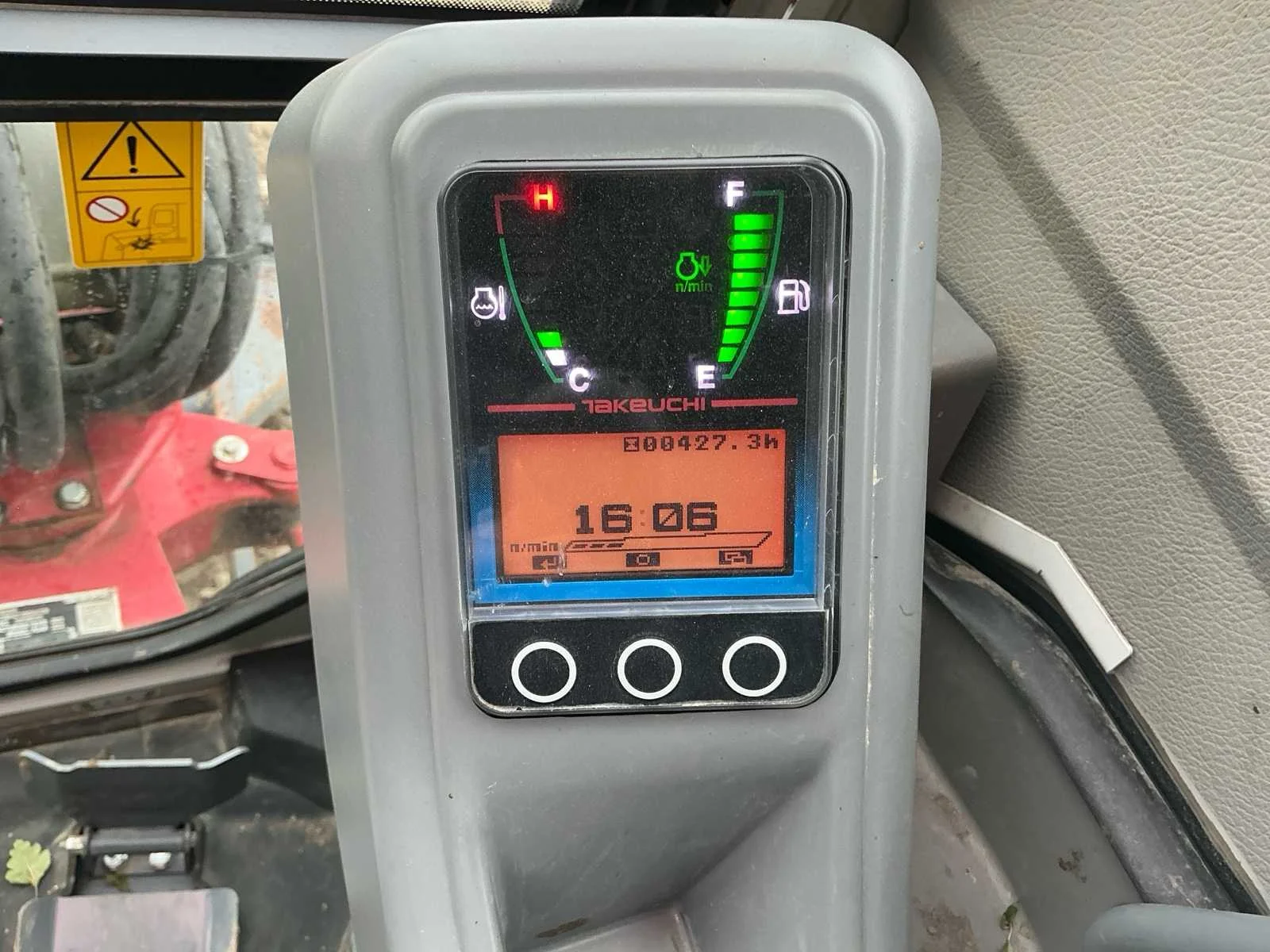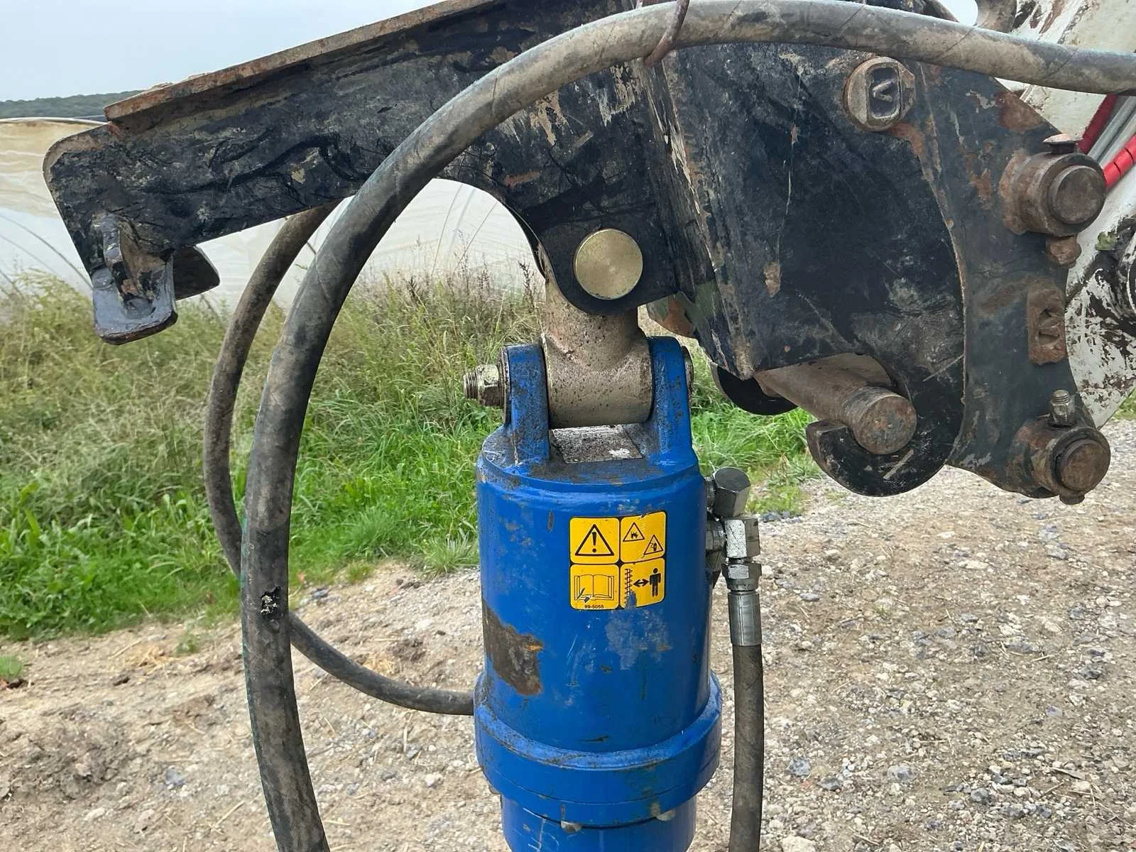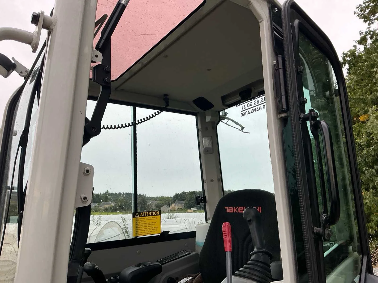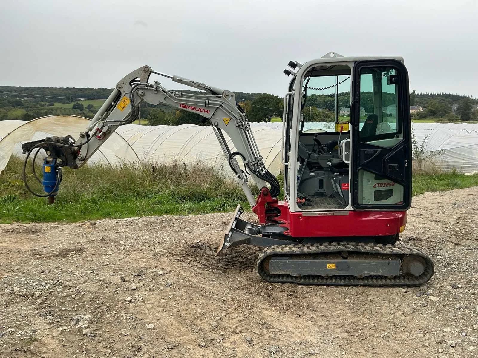 Takeuchi TB325R minigraver, bouwjaar 2022. Uitvoering met binnendraaier-ontwerp voor werken in beperkte ruimtes. Voorzien van: • Proportionele extra hydrauliek (meerdere circuits) • Slangbreukbeveiliging op hef- en armcilinder • Kantelbare voorruit met uitneembaar onderraam • Comfortabele cabine met verstelbare stoel en 3,5” display • Wrap-around contragewicht voor extra stabiliteit • Automatische brandstofontluchting en automatische motordeceleratie Het lot bevat ook de hydraulische boormotor (Auger drive) alsook meerdere graafbakken (Zie foto’s). No Merk: Takeuchi Type: TB325R Bouwjaar: 2022 Serienummer: 123100720 Merk motor: Yanmar 3TNV82A Motorvermogen (kW): 16kW Brandstof: Diesel Bedrijfsgewicht: 2440kg Gieklengte: 4475mm Max. graafdiepte: 2540mm Met graafbak: true Rups breedte: 250mm Cabine: true Afgelezen urenstand: 427 Eigen gewicht: 2440kg Totale afmeting L: 4020mm Totale afmeting Breedte: 1500mm Totale afmeting Hoogte: 2490mm
