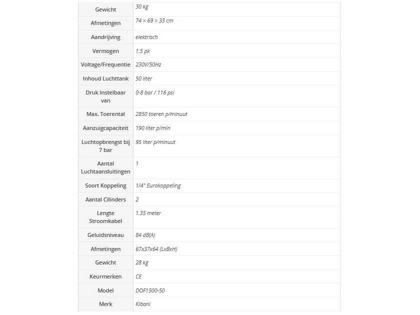 Nee Merk: Kibani Bouwjaar: 2025 Mobiel: true Luchtstroom: 190l/min Buffertank inhoud: 50l Afgelezen urenstand: 0hr Aansluiting: 230V Eigen gewicht: 28kg Totale afmeting L: 740mm Totale afmeting Breedte: 690mm Totale afmeting Hoogte: 330mm