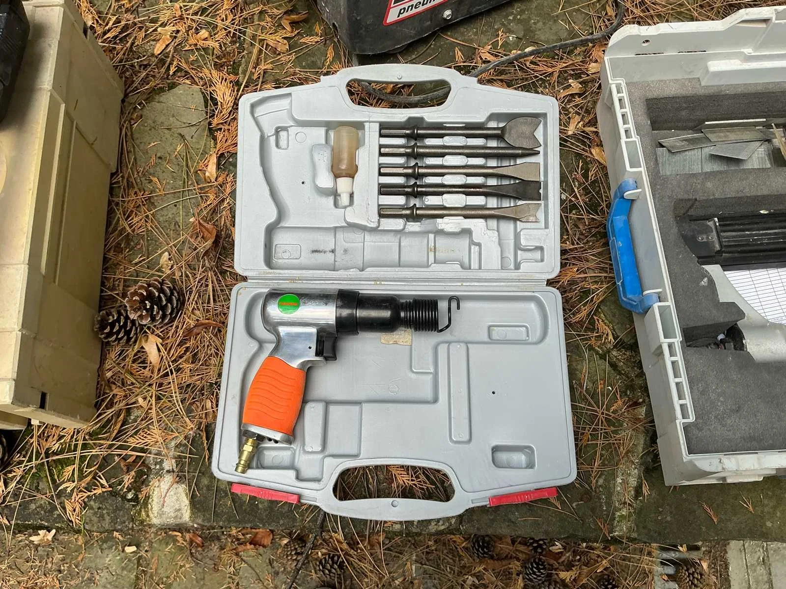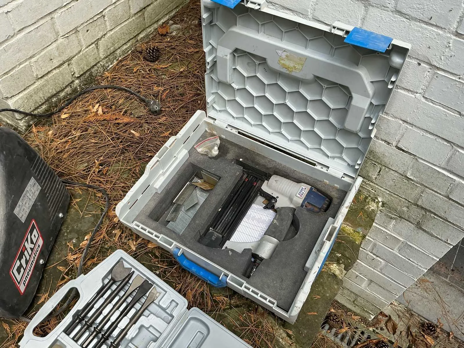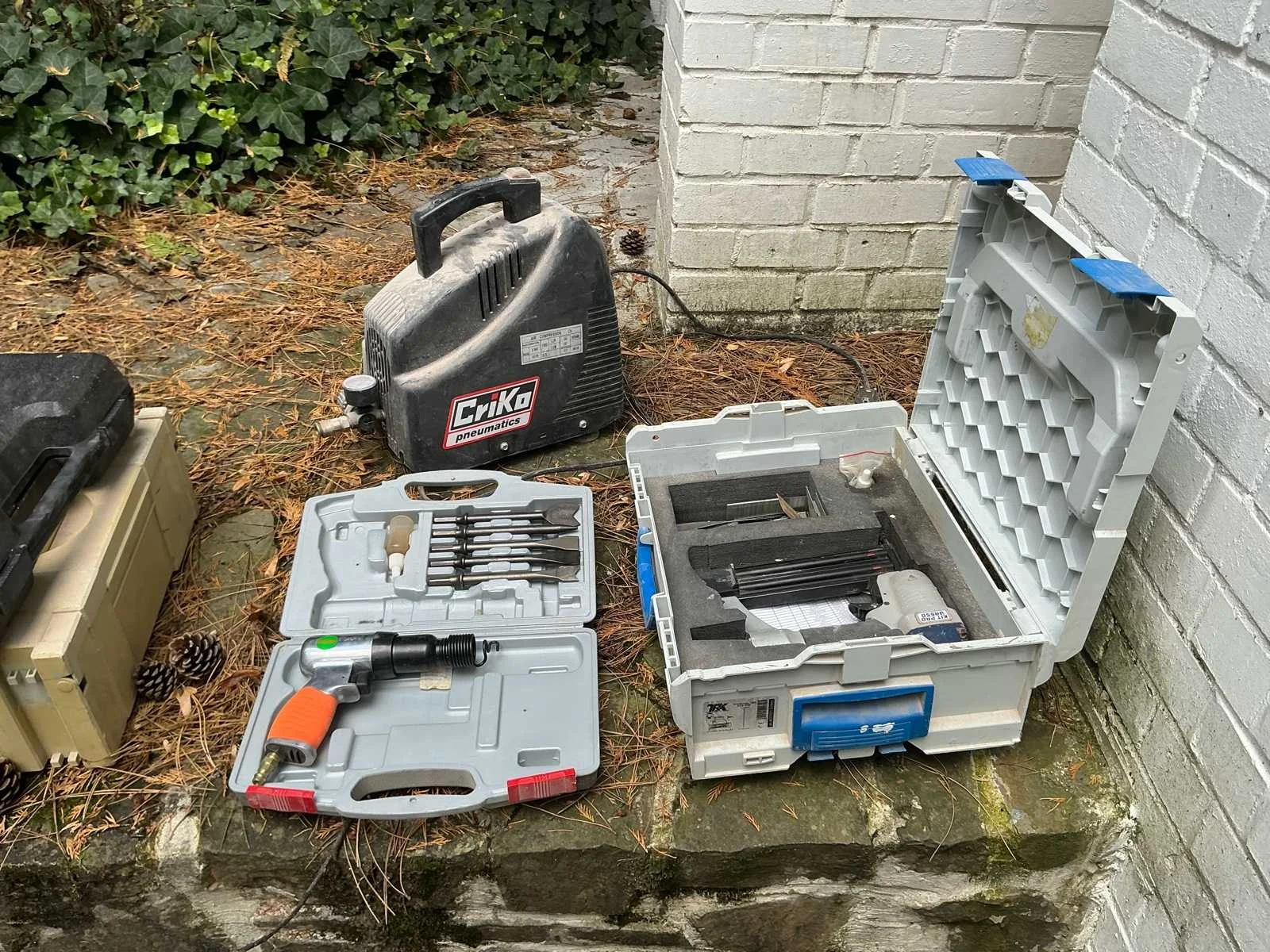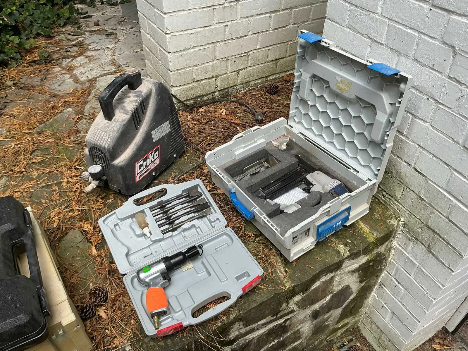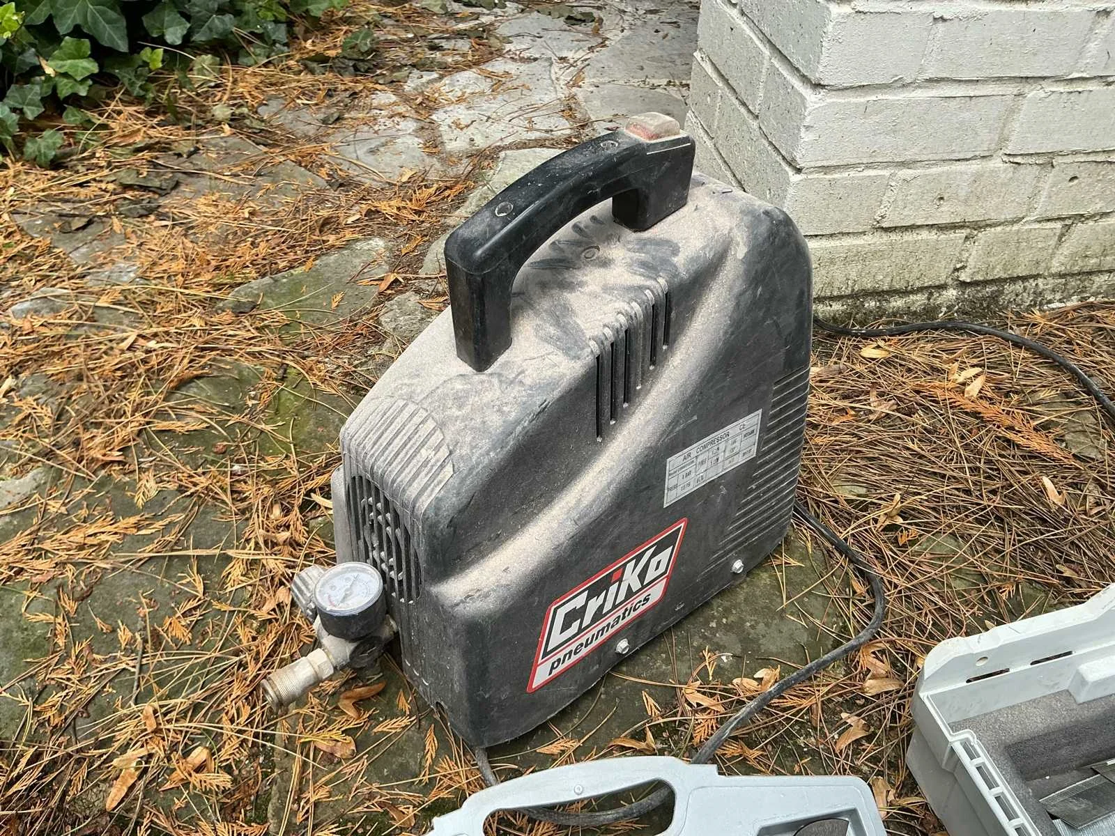 Het lot bevat een compressor en twee handgereedschappen. Werking te controleren. No Merk: Criko Type: C00003123BL Bouwjaar: 2017 Capaciteit.: 8bar Vermogen: 1kW Aansluiting: 220V