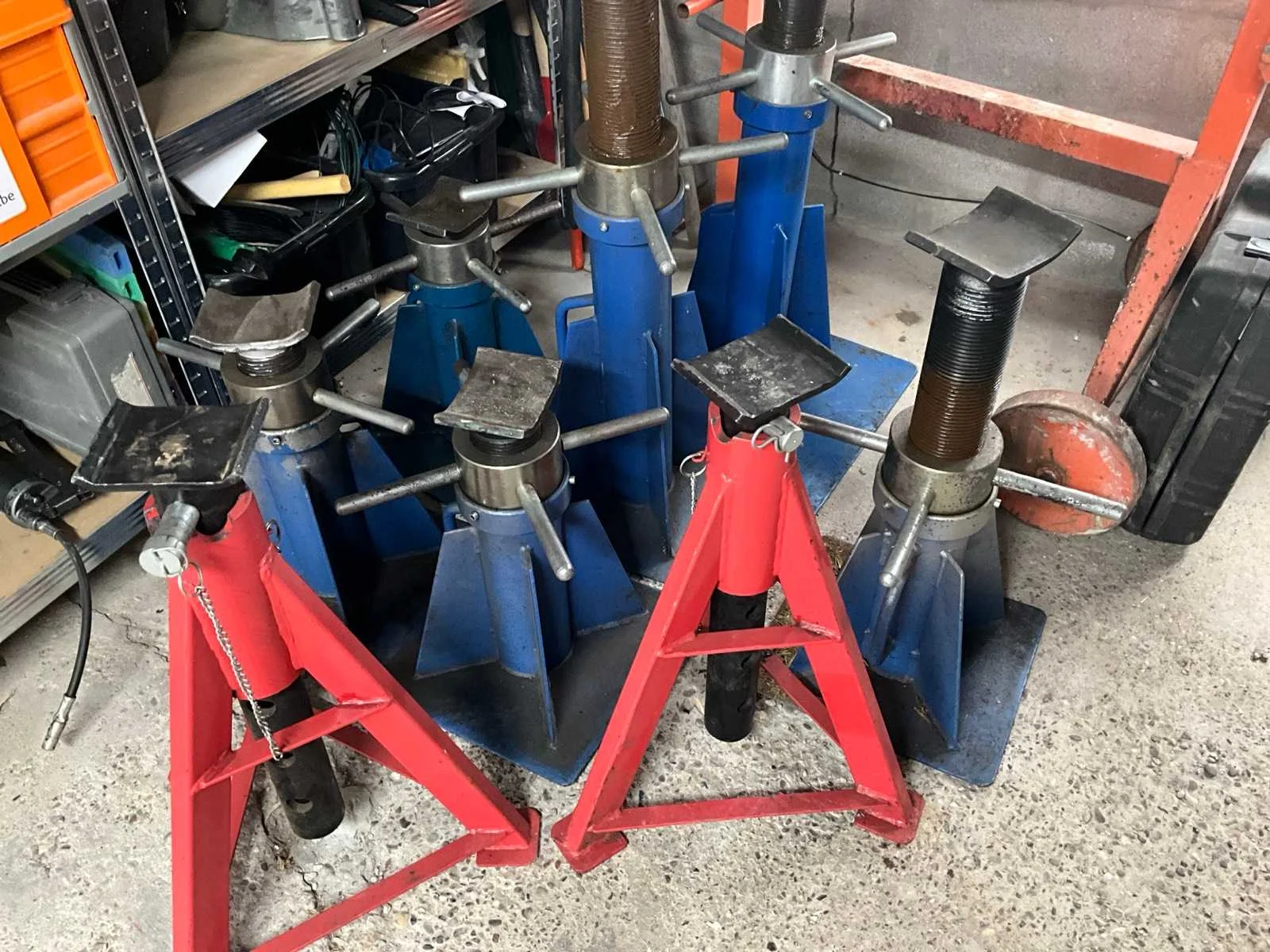 Set kriksteunen/hefpoten 4 kleine 2 grote blauwe modellen ca. 30 ton 2 rode modellen ca. 8 ton Non