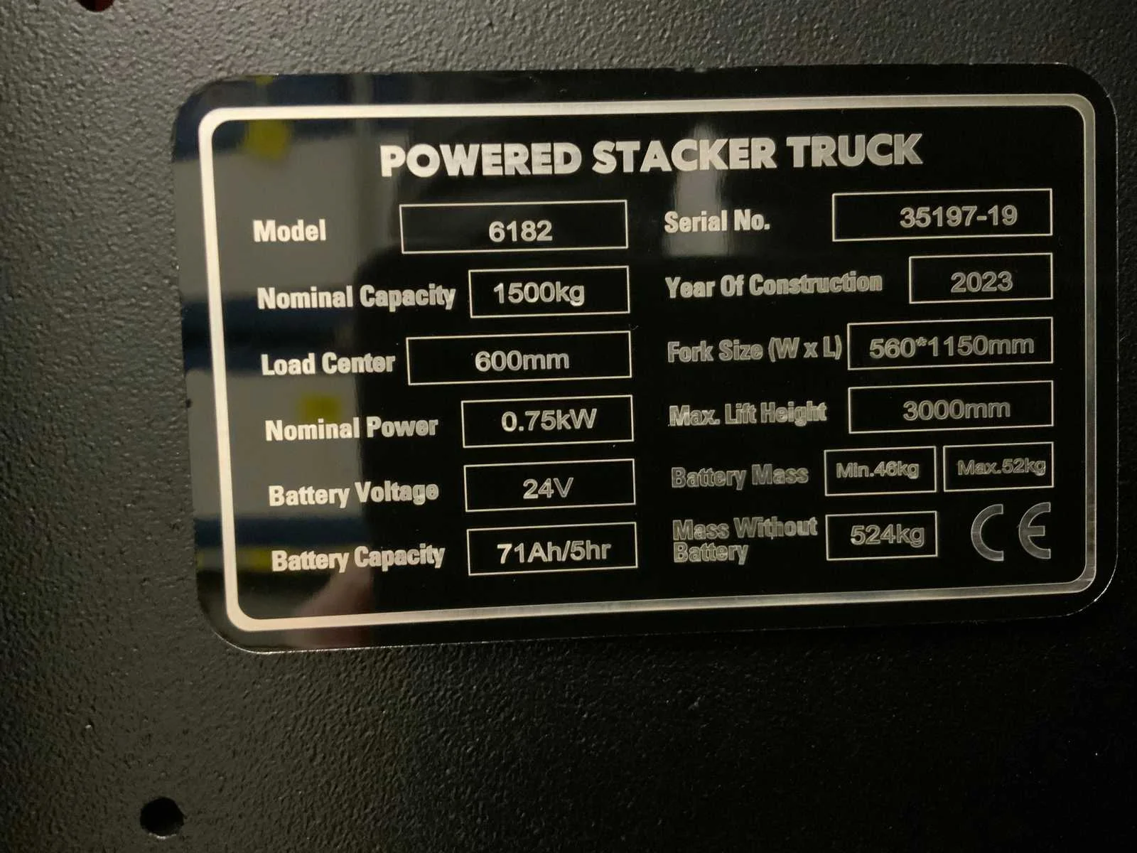 Fork size; 560x1150mm; loadcenter 600mm; power 0.75KW; battery voltage 24V; battery 71Ah-5hr; 230V; interne lader; lifted masthoogte 3435mm; turning radius 1490mm; noodstop; batterij percentage; dubbele ketting; noodknop; 6182 Nee Merk: RTE Type: 6182 Bouwjaar: 2024 Hefvermogen: 1500kg Hefhoogte: 3000mm Lepellengte: 1150mm Eigen gewicht: 570kg Totale afmeting L: 1710mm Totale afmeting Breedte: 820mm Totale afmeting Hoogte: 1980mm