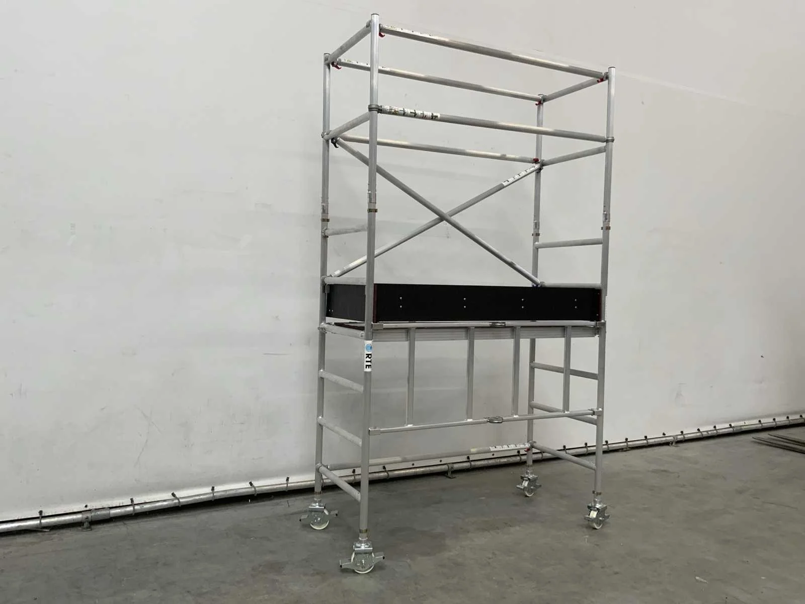 Class 2; maximale werkhoogte 4.8M; zwenkwielen met rem; EN1004; totale hoogte steiger 2850mm; 6507 Nee Merk: RTE Bouwjaar: 2024 Afmeting l: 1630mm Afmeting b: 725mm Afmeting h: 2850mm Aantal opbouwdelen: 2 Aantal platforms: 1 Aantal diagonaalschoren: 2 Aantal horizontaalschoren: 5 Aantal wielen: 4 Aantal stabilisatoren: 0 Aantal leuningen: 0