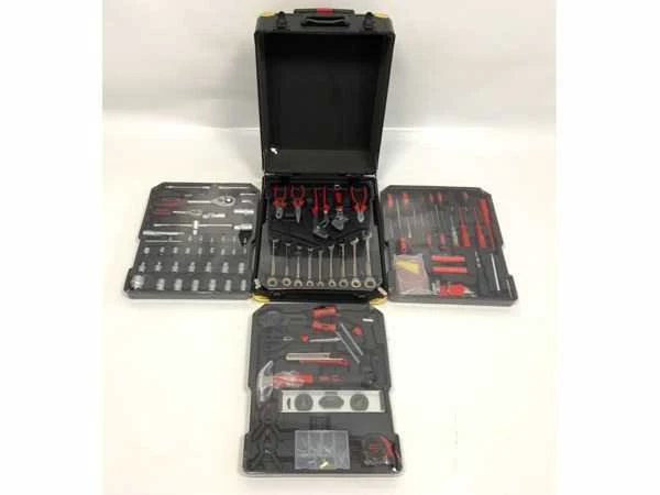 W.o. steek- ringsleutel met ratel; diverse tangen; doppenset met ratel; diverse schroevendraaiers; precisieschroevendraaiers; inbussleutel; diverse bits; klauwhamer; krimptang; schaar; rolmaat; waterpas; hetelijmpistool; kunststof klemmen; tapijtmes; 2161; Nee Type: 186 delig Kunststof: false Aluminium: true Canvas: false Met inhoud: true Afmeting l: 210mm Afmeting b: 370mm Afmeting h: 520mm