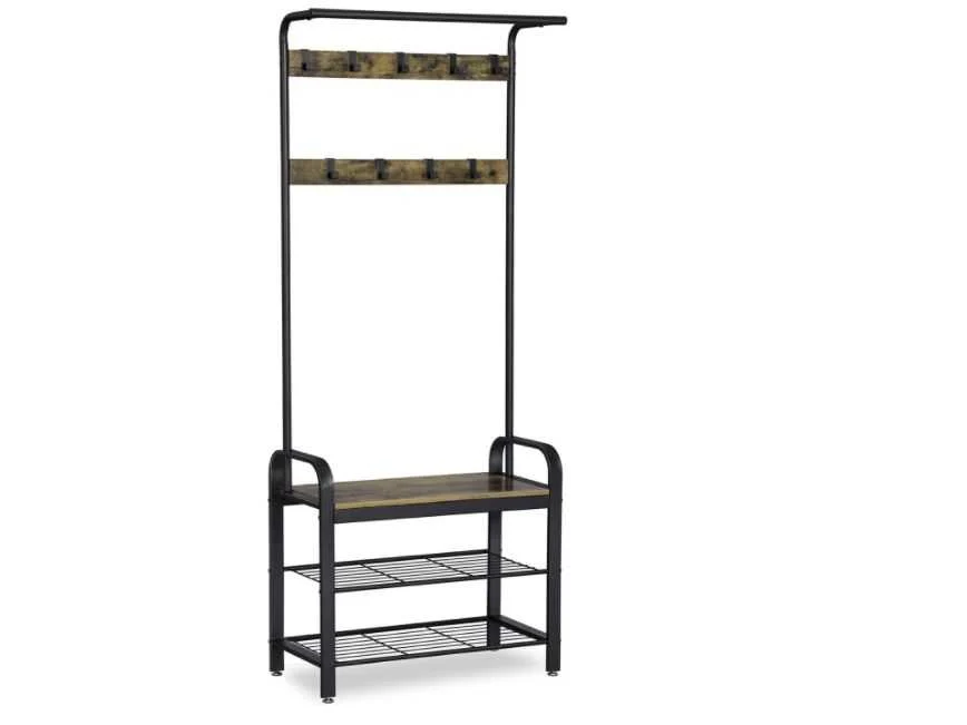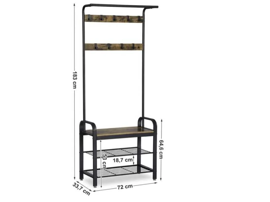 Deze opvallende kapstok combineert een stevig ijzeren frame met een robuust rek in grijs, waardoor hij een uniek karakter en duurzaamheid heeft. Met negen stevige haken en een kledingstang biedt het voldoende ophangruimte, terwijl de twee schoenenplanken extra opslag bieden. De montage van de kapstok is eenvoudig dankzij de duidelijke instructies. Met afmetingen van 72x33.7x183 cm is het een praktische en stijlvolle toevoeging aan de gang. No