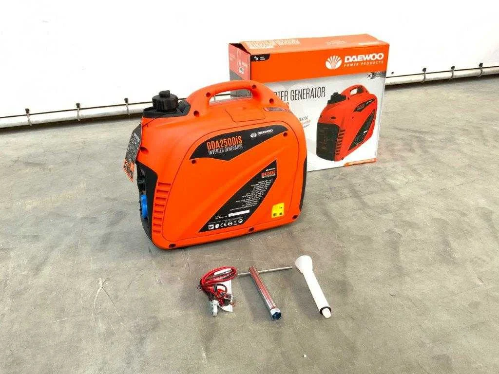 Uitgangen 1x 230V AC - 1x 12V DC 8A - USB 5V 1.0A/2.1A; Technische specificaties; Frequency 50Hz; Running watts 2000W; Max watts 2200W; AC current 8.7A; Max. Altitude 1000m; Performance Class G1; Quality class A; Max. Amb. Temp 40'c; Power factor 1.0; phase single; 5757 No Merk: Daewoo Type: GDA2500IS Bouwjaar: 2023 Benzine: true Mobiel: true Handboek aanwezig: true Machinegewicht: 22kg