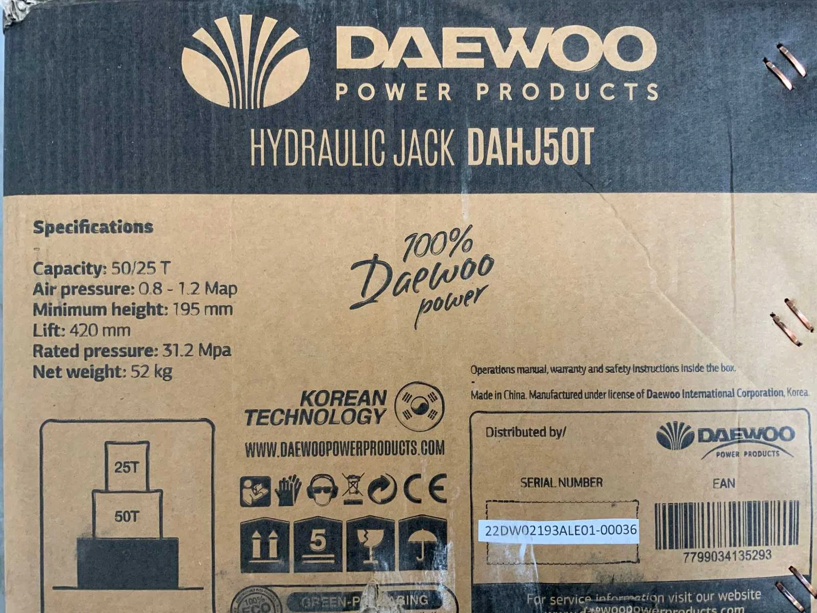 Max hoogte 420mm; min hoogte 195mm; 5635 Nee Merk: Daewoo Type: 50T. DAHJ Bouwjaar: 2023 Capaciteit.: 50.00t Eigen gewicht: 52kg