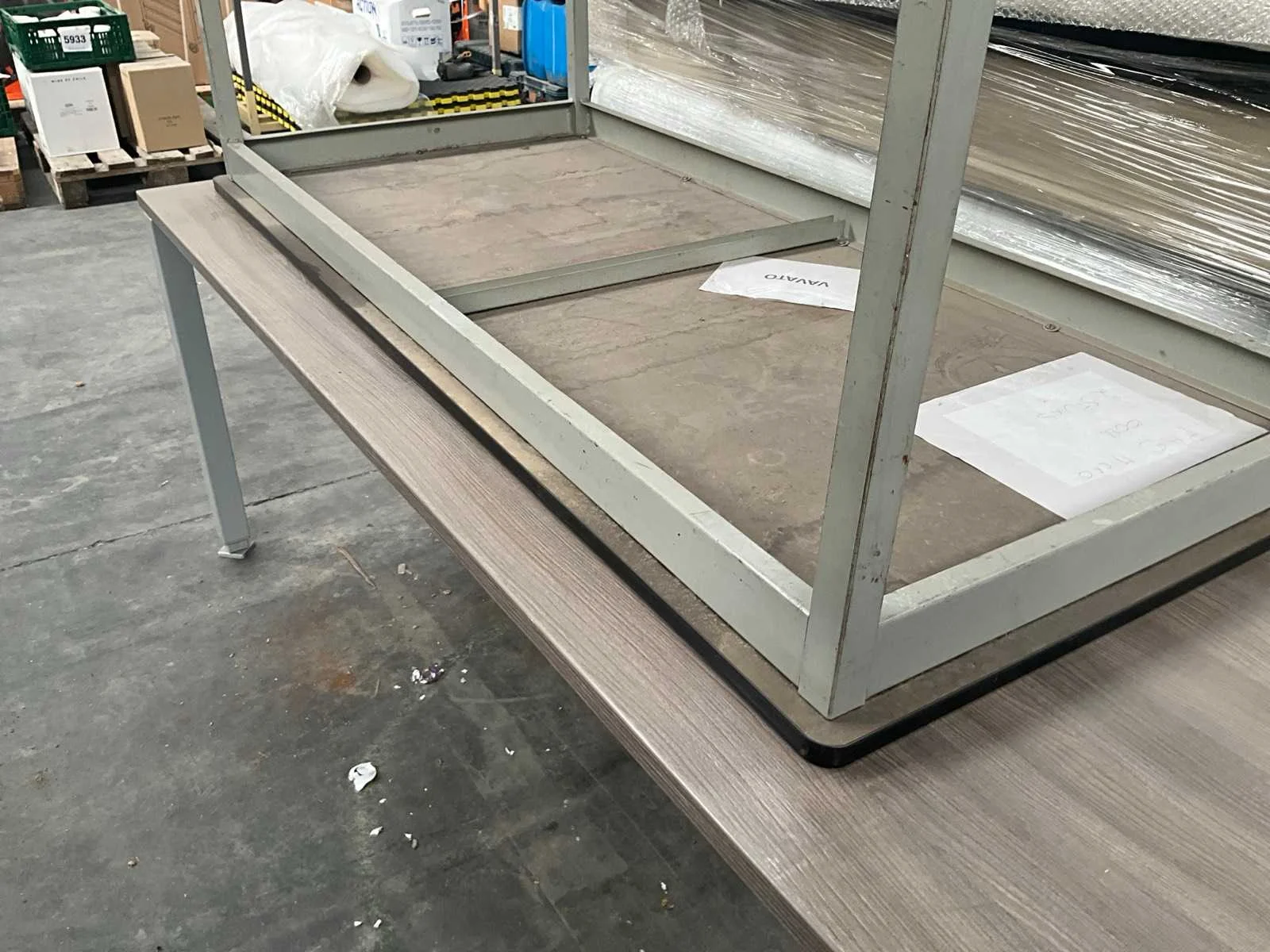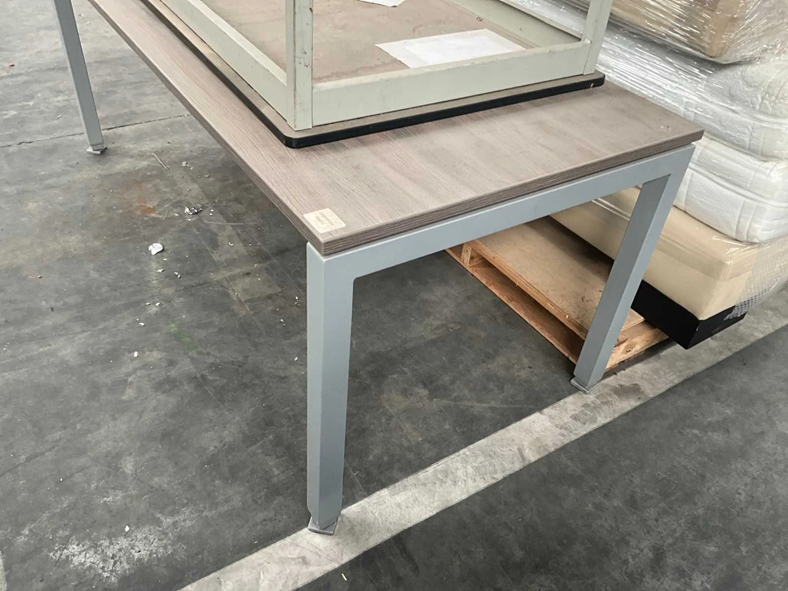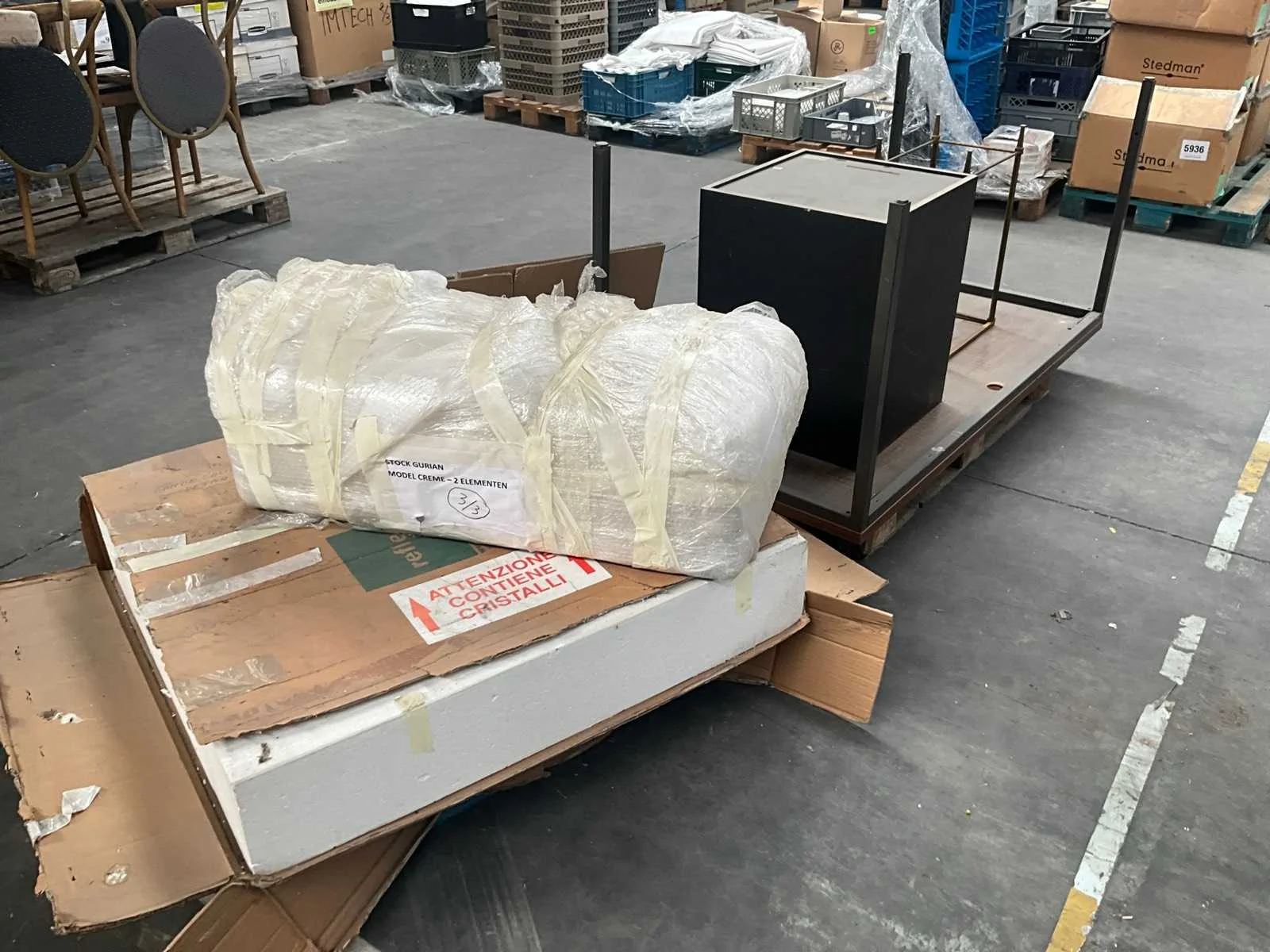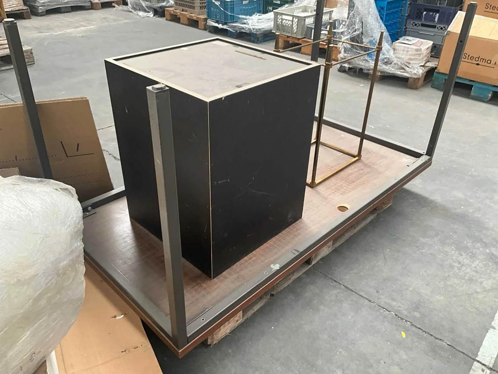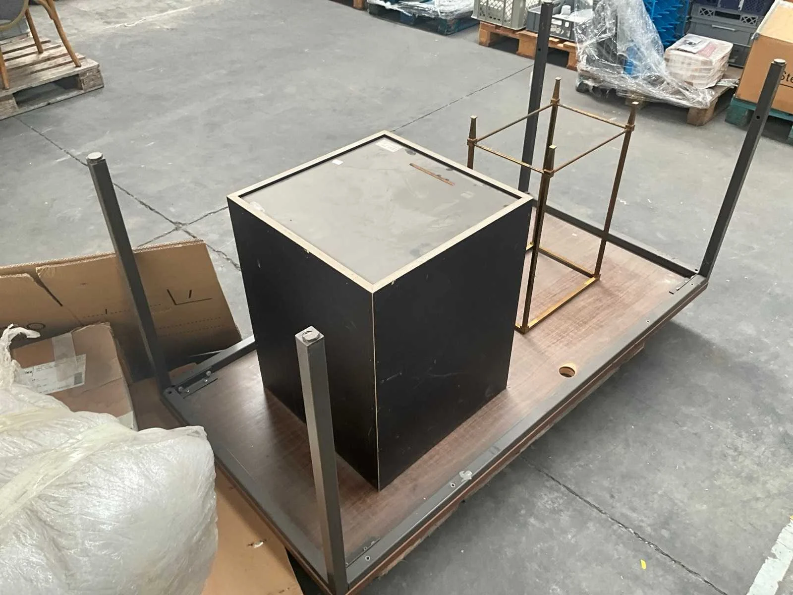 Waaronder 3 diverse tafels waarvan met afmeting 180x80 en 150x70 en 155x78 cm, allen op metalen onderstel voorzien van houten bovenblad, metalen onderstel voor tafeltje, houten bijzetkast voorzien van deurtje met slot (sleutel niet beschikbaar), zwaar glazen tafelbasis REFLEX base vetro Policleto in doos en Gurian element model creme. Nee