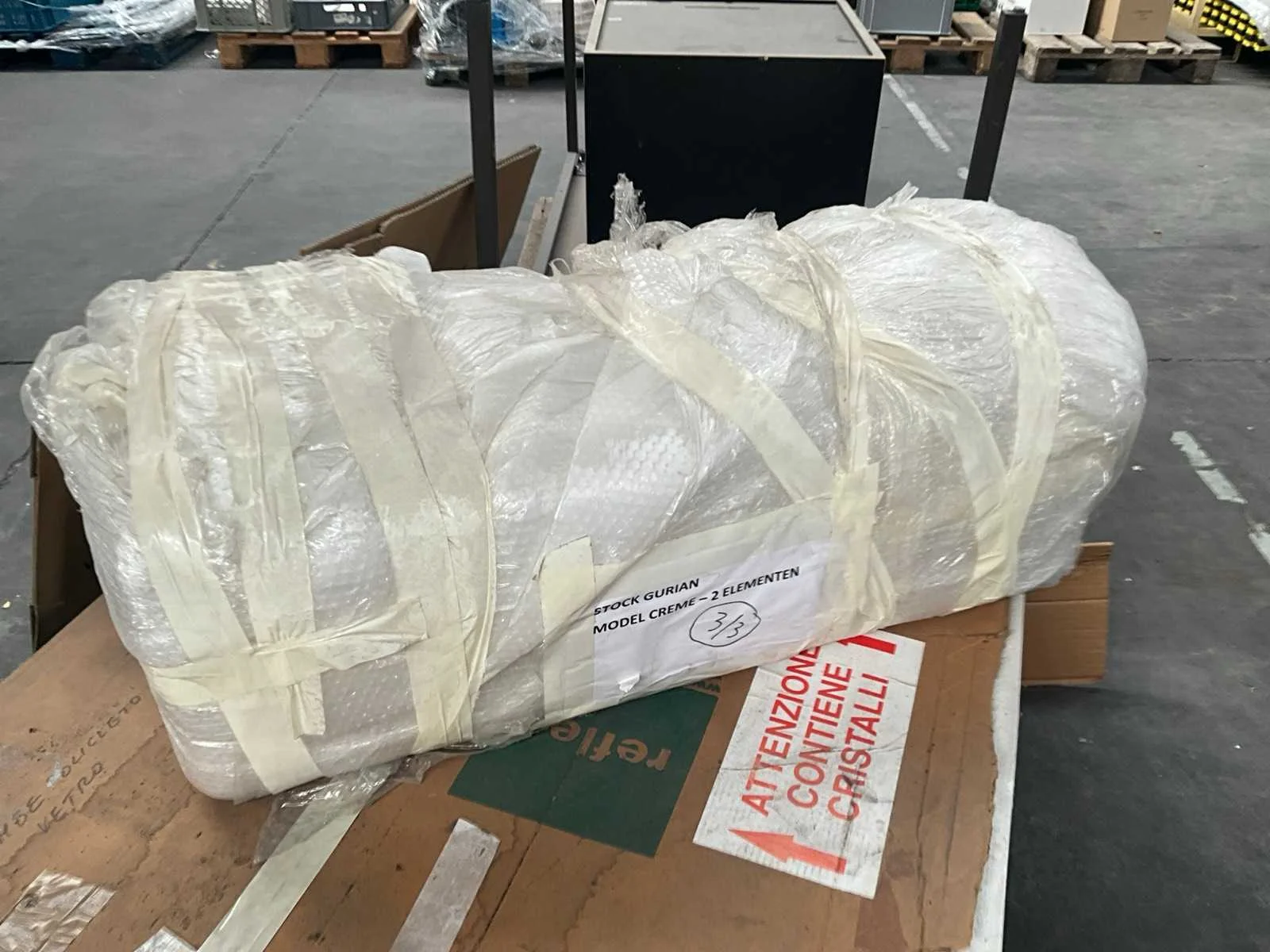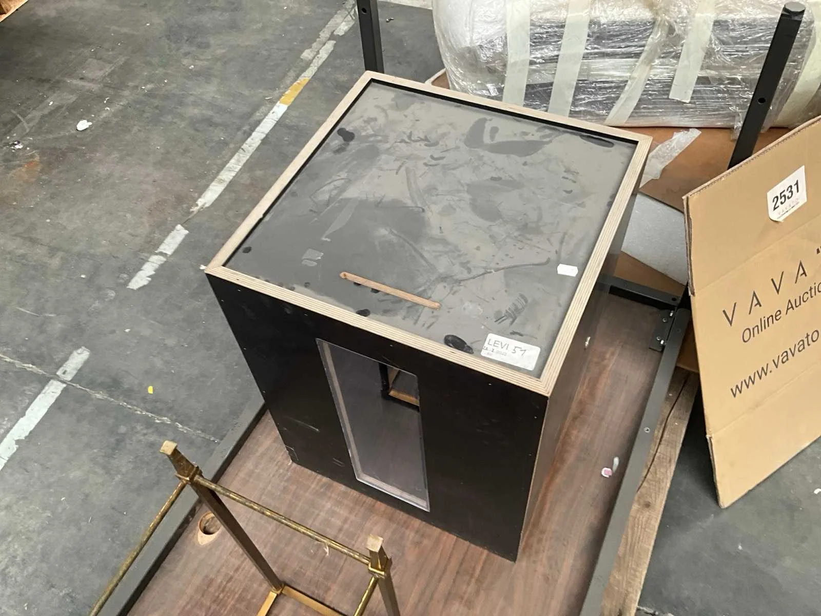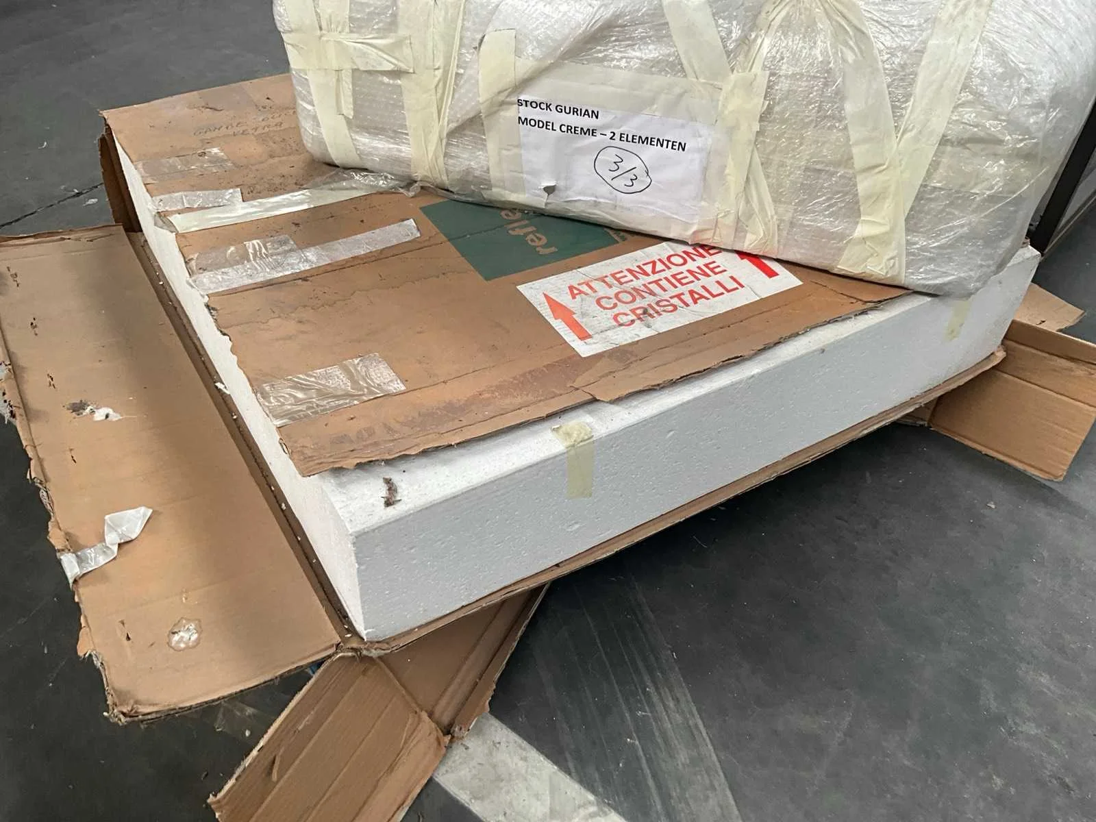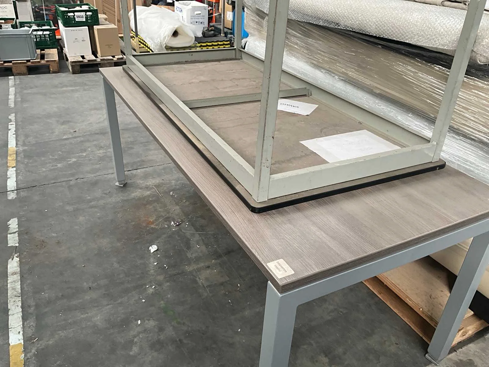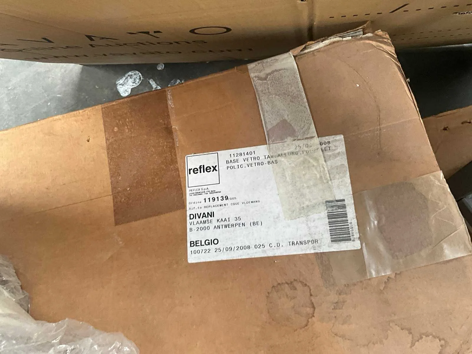 Waaronder 3 diverse tafels waarvan met afmeting 180x80 en 150x70 en 155x78 cm, allen op metalen onderstel voorzien van houten bovenblad, metalen onderstel voor tafeltje, houten bijzetkast voorzien van deurtje met slot (sleutel niet beschikbaar), zwaar glazen tafelbasis REFLEX base vetro Policleto in doos en Gurian element model creme. Nee