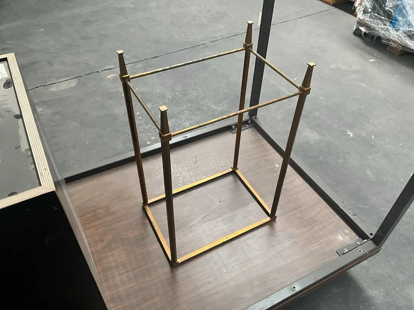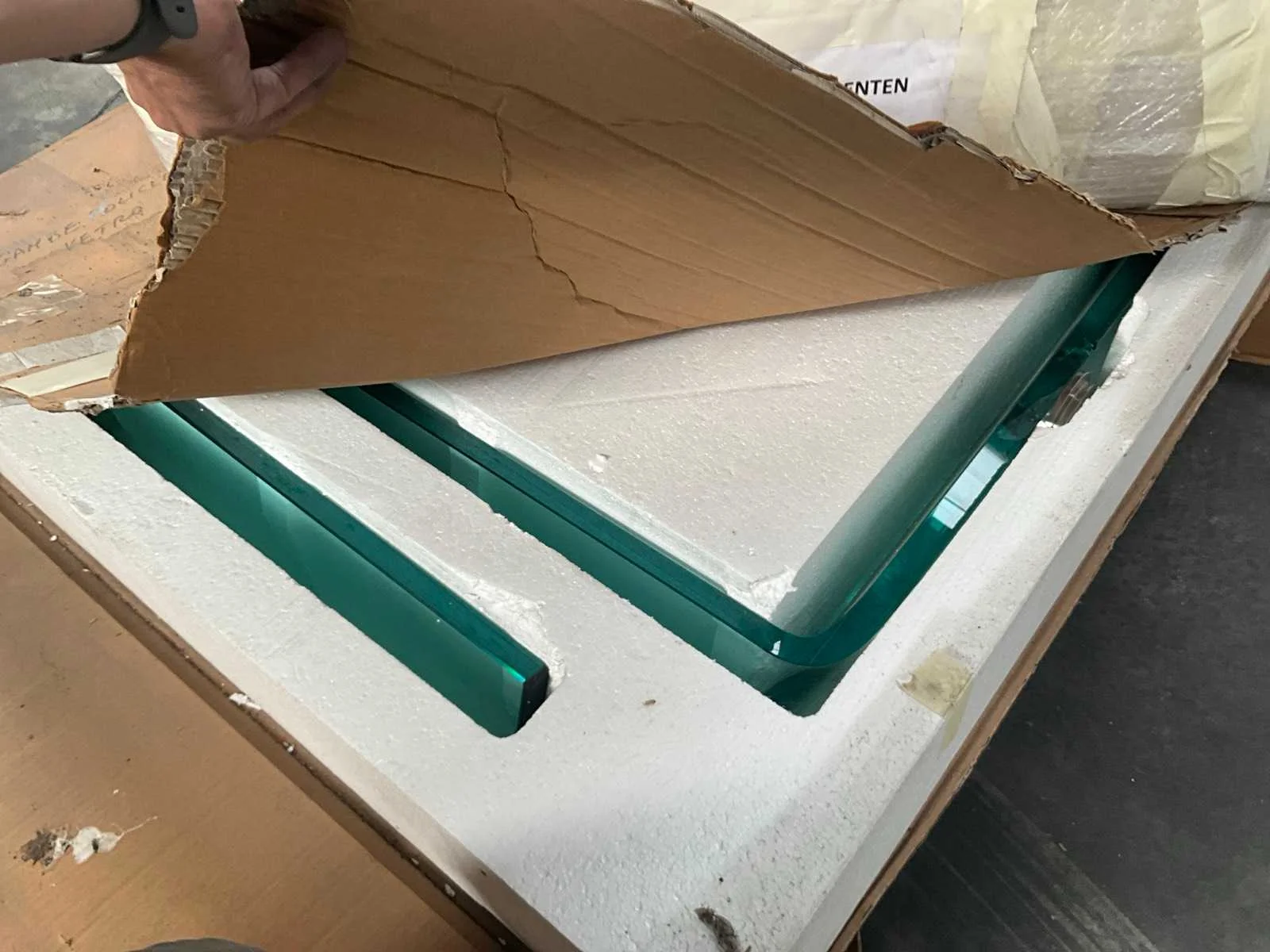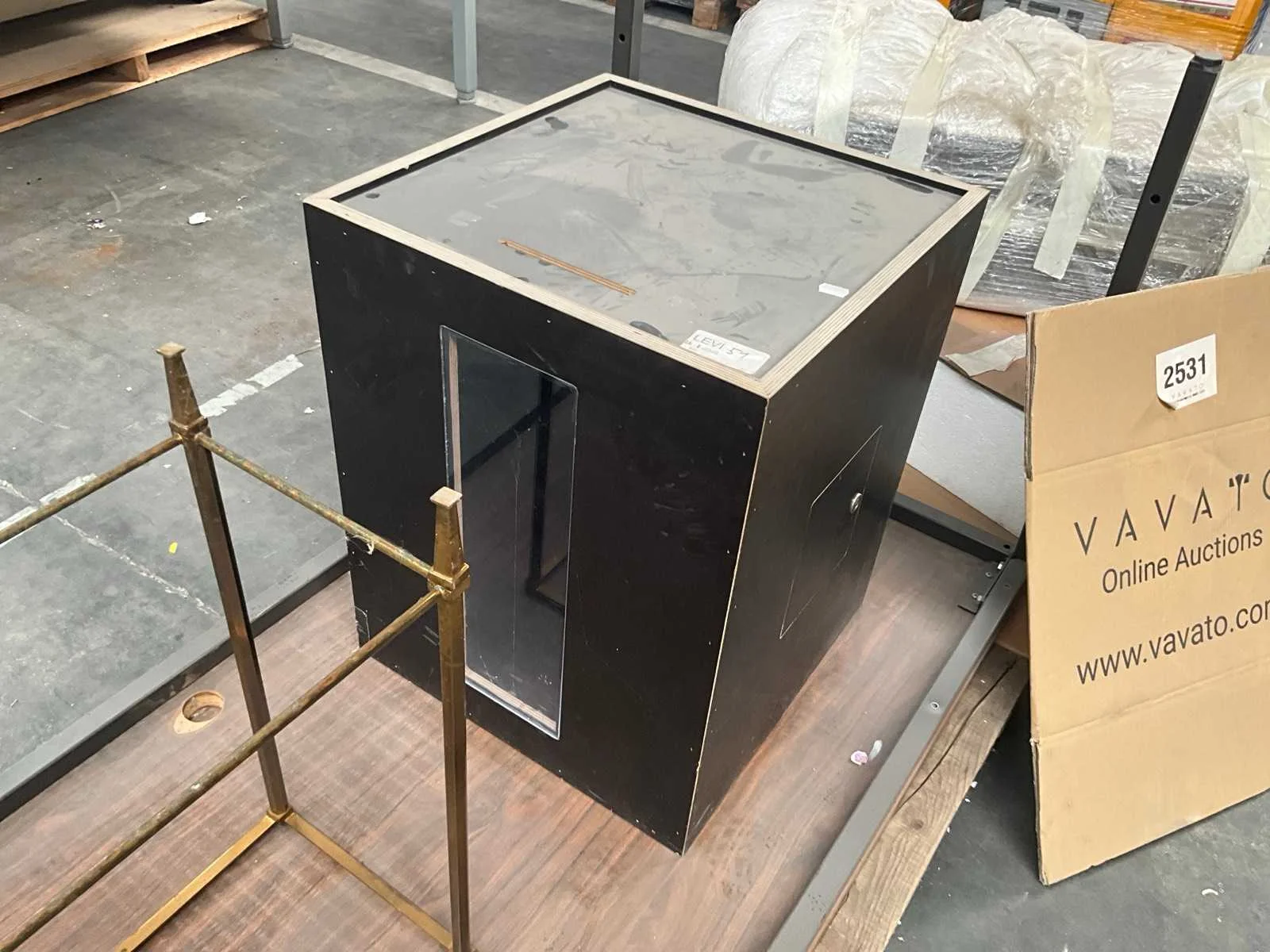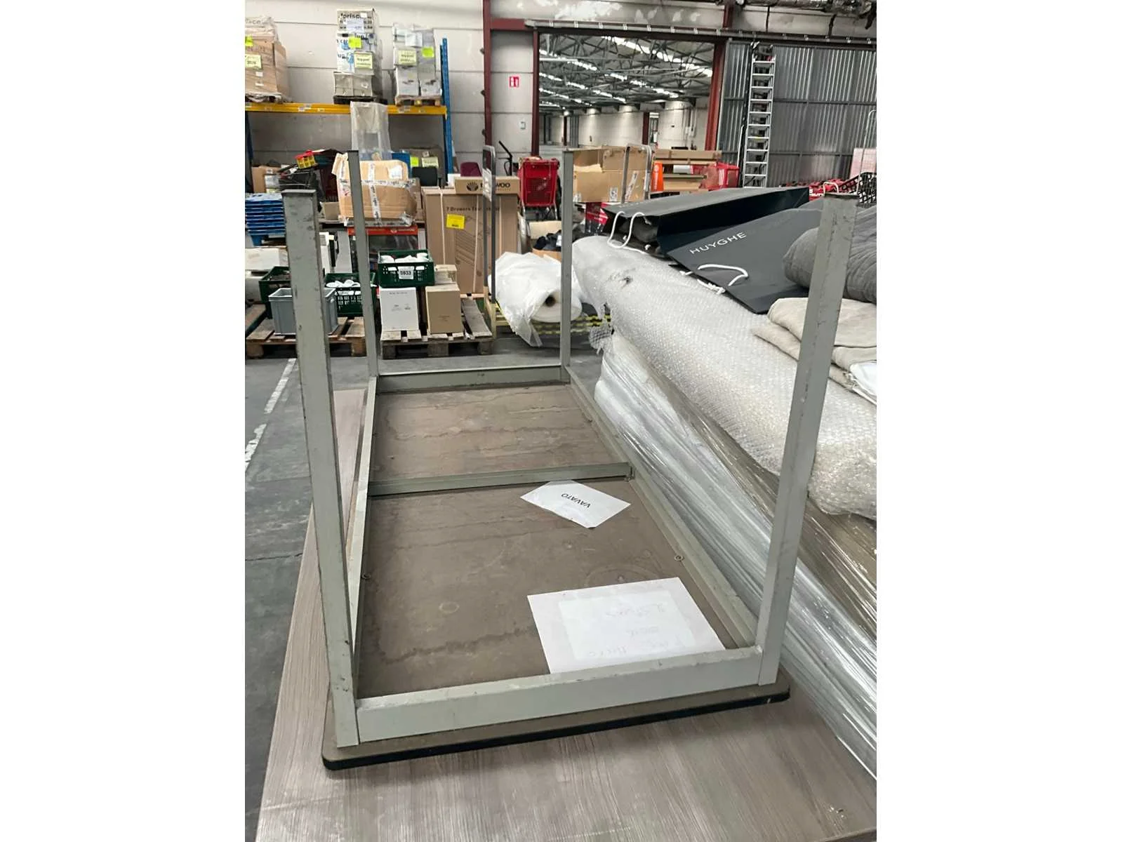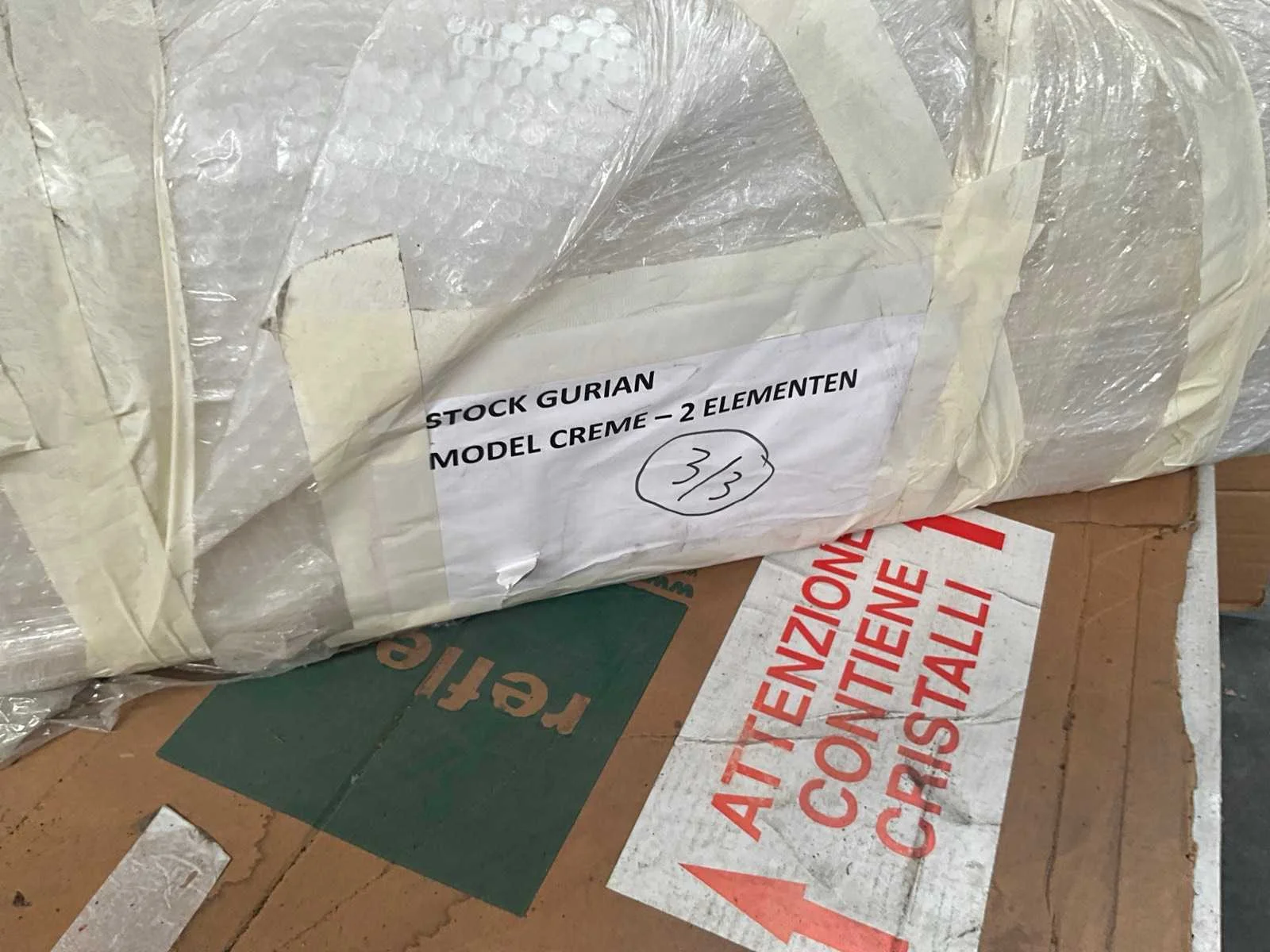 Waaronder 3 diverse tafels waarvan met afmeting 180x80 en 150x70 en 155x78 cm, allen op metalen onderstel voorzien van houten bovenblad, metalen onderstel voor tafeltje, houten bijzetkast voorzien van deurtje met slot (sleutel niet beschikbaar), zwaar glazen tafelbasis REFLEX base vetro Policleto in doos en Gurian element model creme. Nee