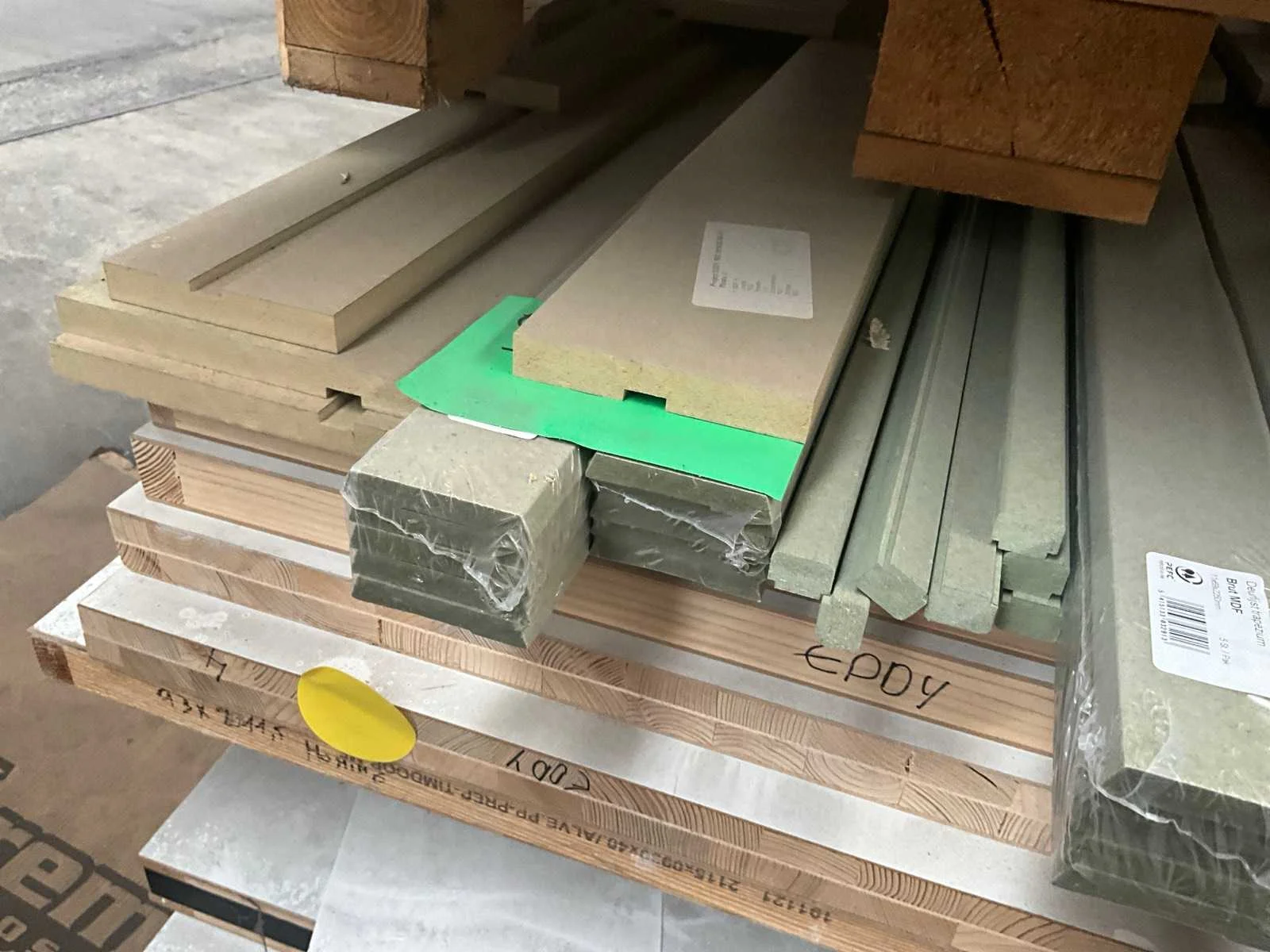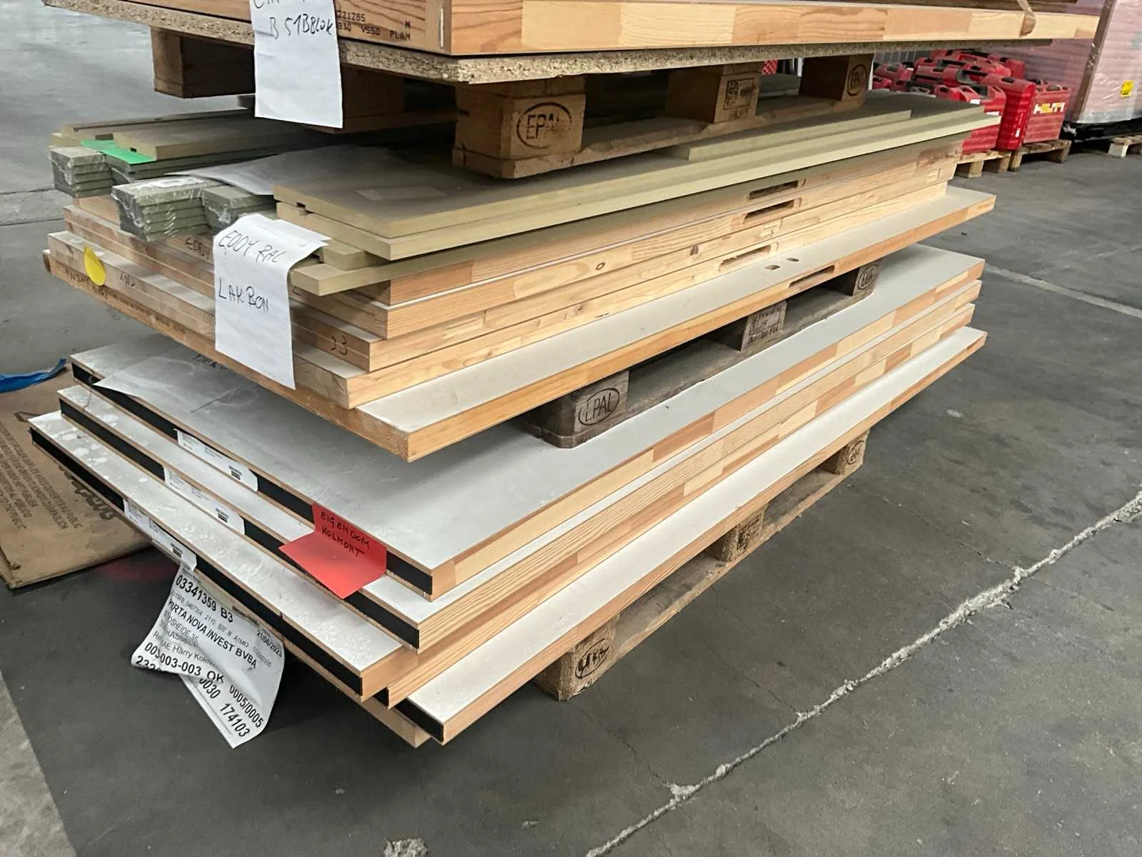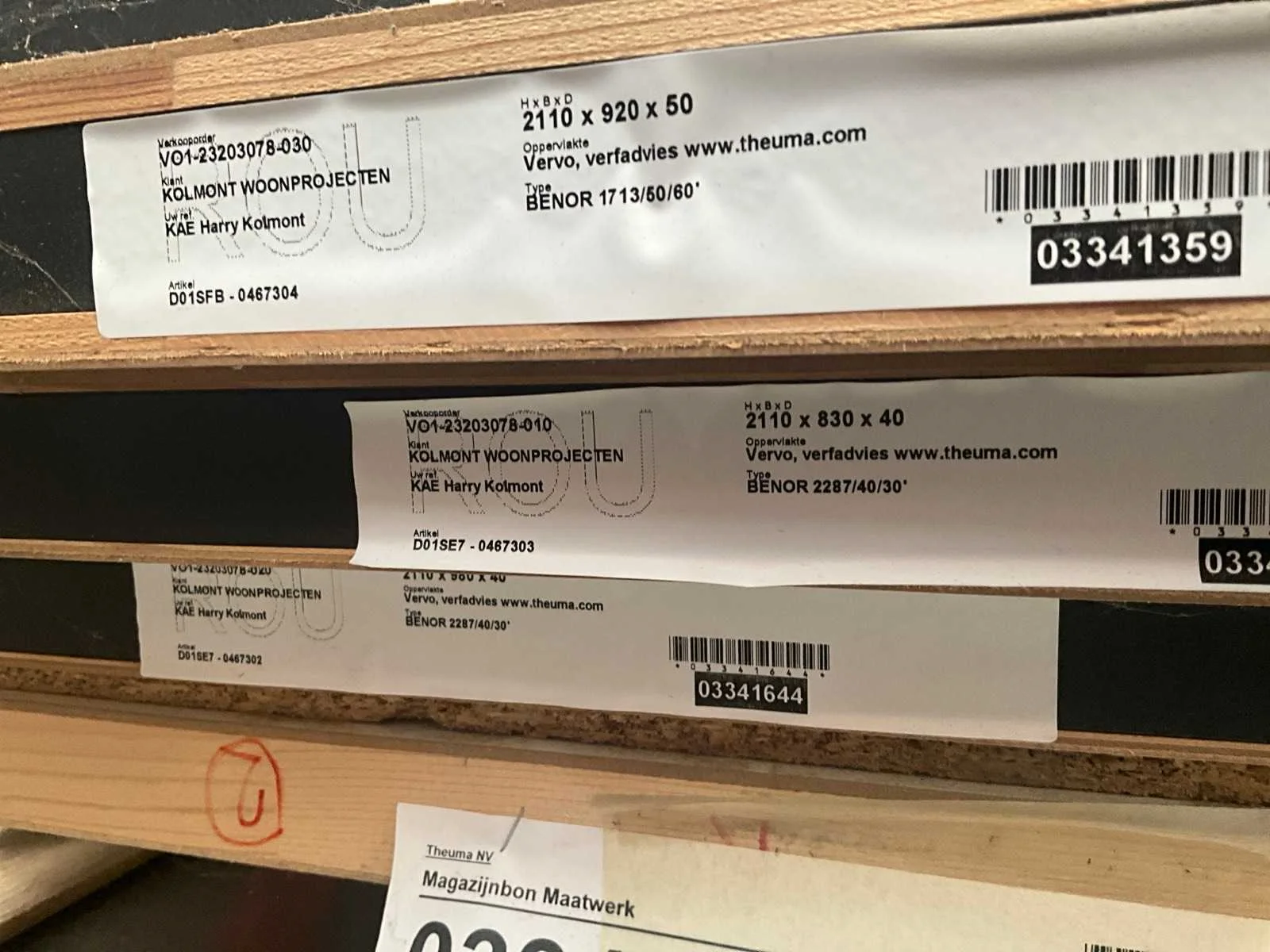 Waaronder verfdeuren PORTA NOVA waarvan 3x 2110x920x50, 1x 2110x830x40 en 1x 2110x980x40 mm, compleet met steldeur RF30 - 2115 x 930 mm, en 4x 2115x930x40 mm VE.PP-PREP. TIMDOOT-MF en deur 2115x930x50 VS50 PLAM, compleet met enige diverse deurlijsten MDF. No
