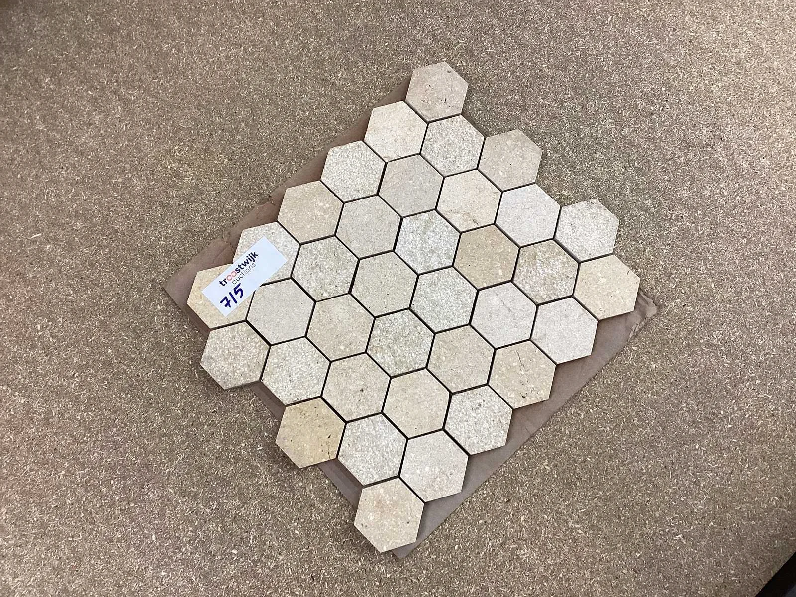 No Merk: Natuursteen Kleur: Beige Mix Afwerking: Mat Getrommeld Lengte: 30cm Breedte: 30cm Materiaal: Limestone Dikte: 10mm Type: Mozaïektegel Model: Hexagon 5x5 cm Aantal m² per verpakking: 0.09m² Aantal pakken: 19 Totaal oppervlakte: 1.71m² Totaal gewicht: 40g