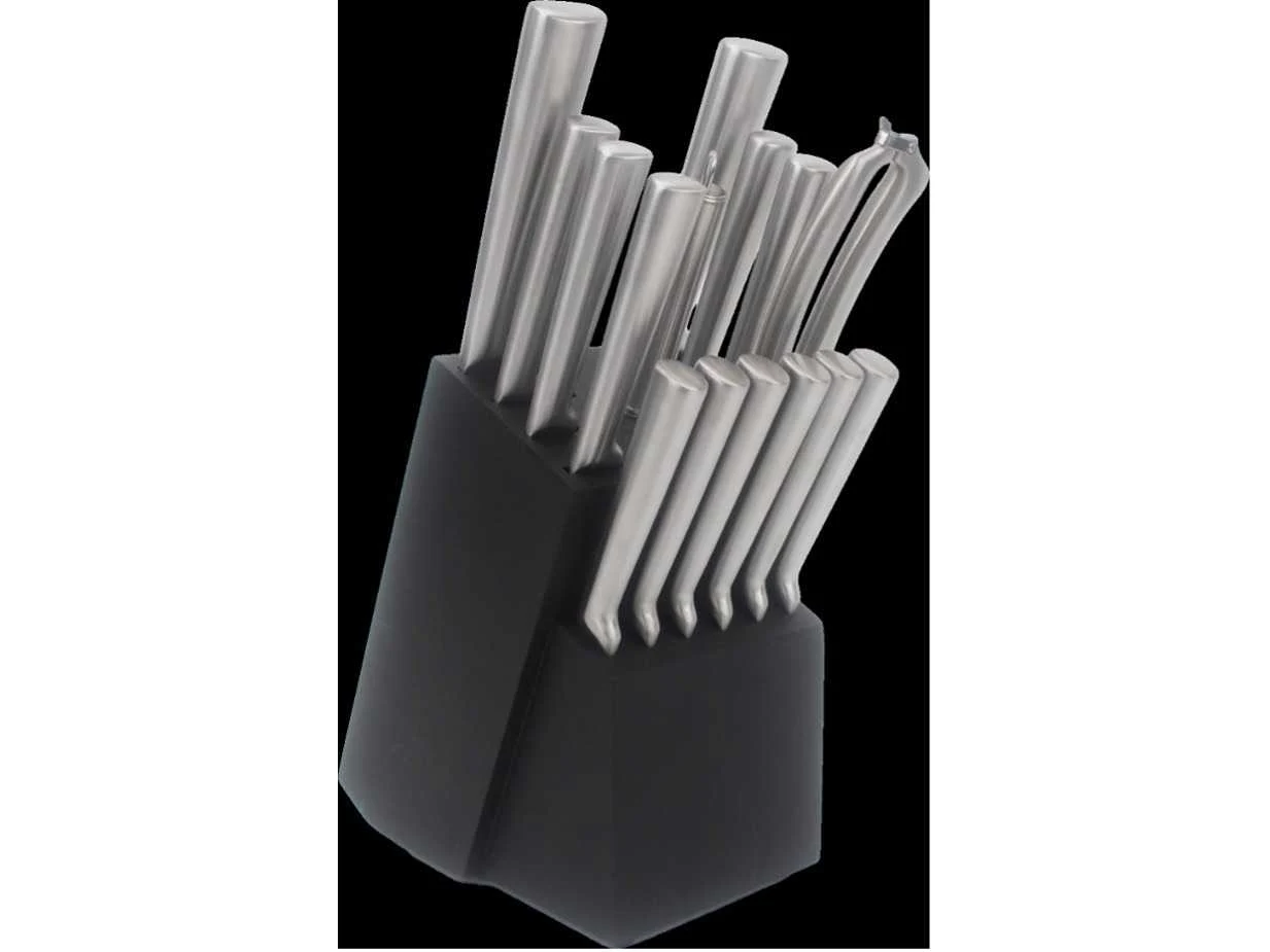 15-delige messenset: koksmes 8"(2,5mm) broodmes 7"(2.5mm) Snijmes 8"(2.5mm) Officemes 5"(2.0mm) schilmesje 3” (2.0mm) steakmes 5” (2.0mm) Puntenslijper 7.5” kippenbotschaar houtblok Nee