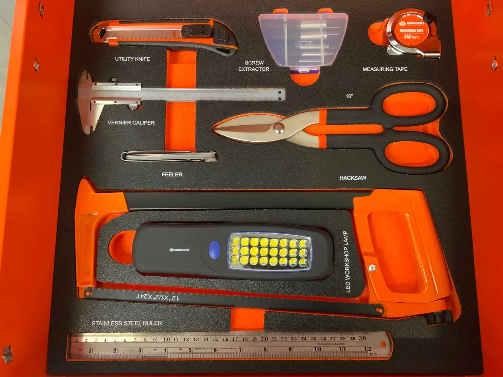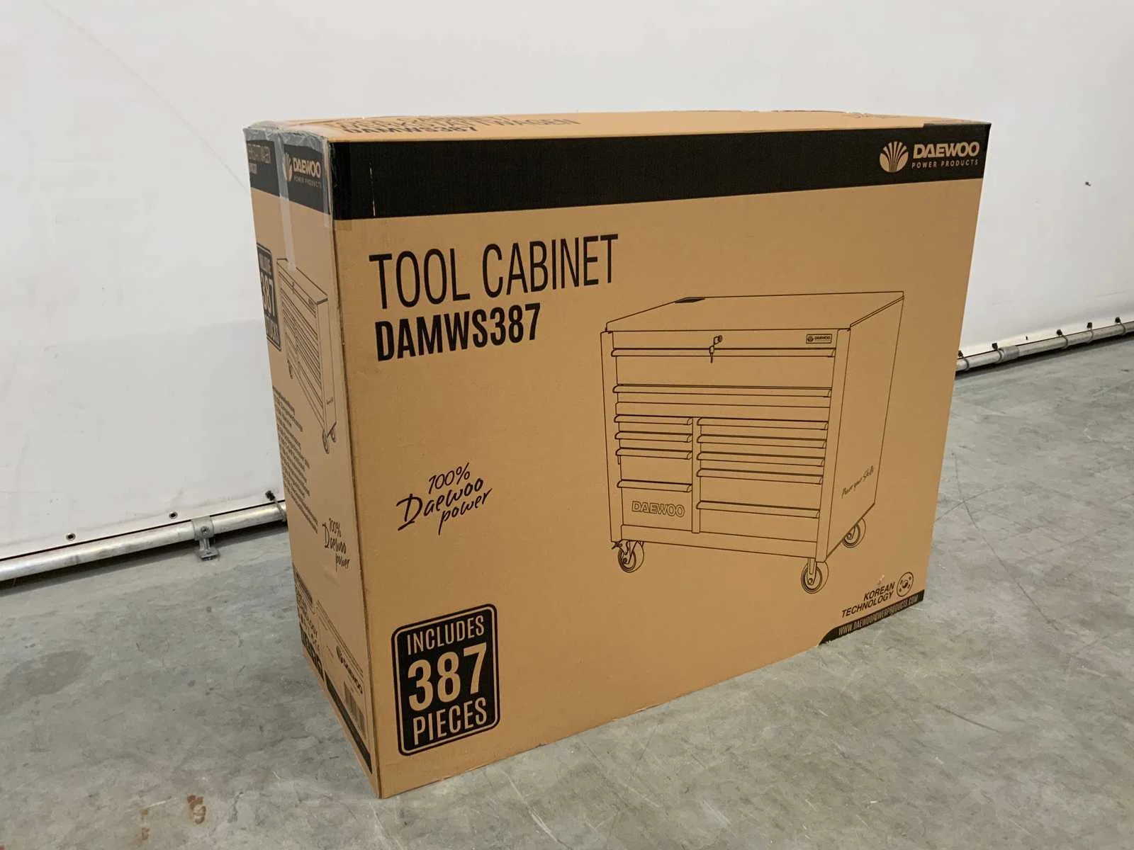 Ongebruikt; gereedschap in plastic verpakt; 12-delig tangenset; 13-delig hamerset; 14-delig meetset; 36-delig slagmoersleutel set; 21-delig sleutels met T-greep; 41-delig schroevendraaierset; 29-delig combinatiesleutels; 12-delig ringsleutels; 125-delig deppenset; 84-delig bitjes set; 6443 Nee Merk: Daewoo Type: DAMW387