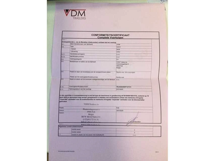 COC aanwezig Voorzien van LED lichten Nee Merk: VDM Type: DA01 Bouwjaar: 2025 Chassisnummer: YBJ402035SP127314 Aantal assen: 2 Gesloten opbouw: true Hoogte: 150cm Lengte: 255cm Breedte: 150cm