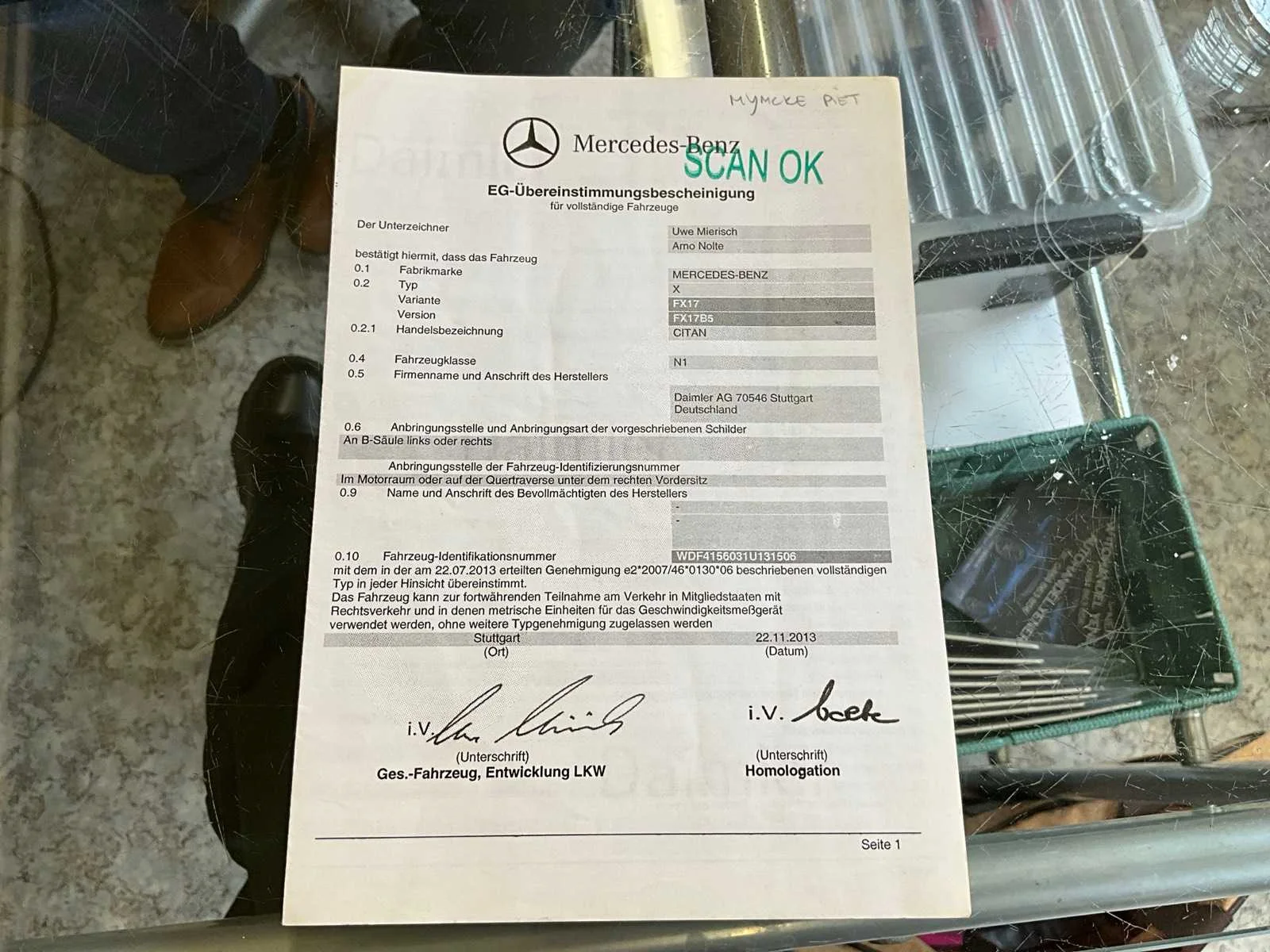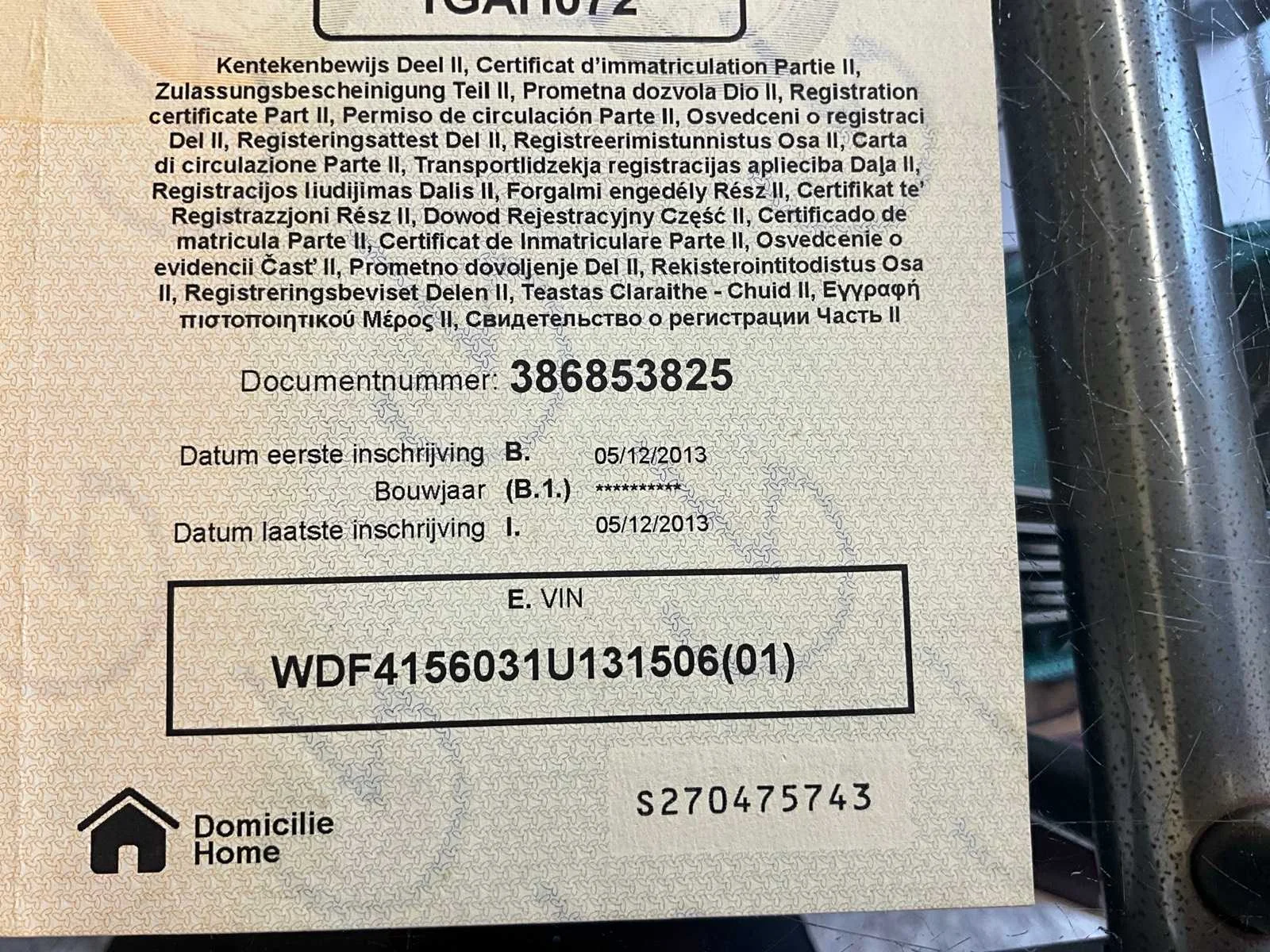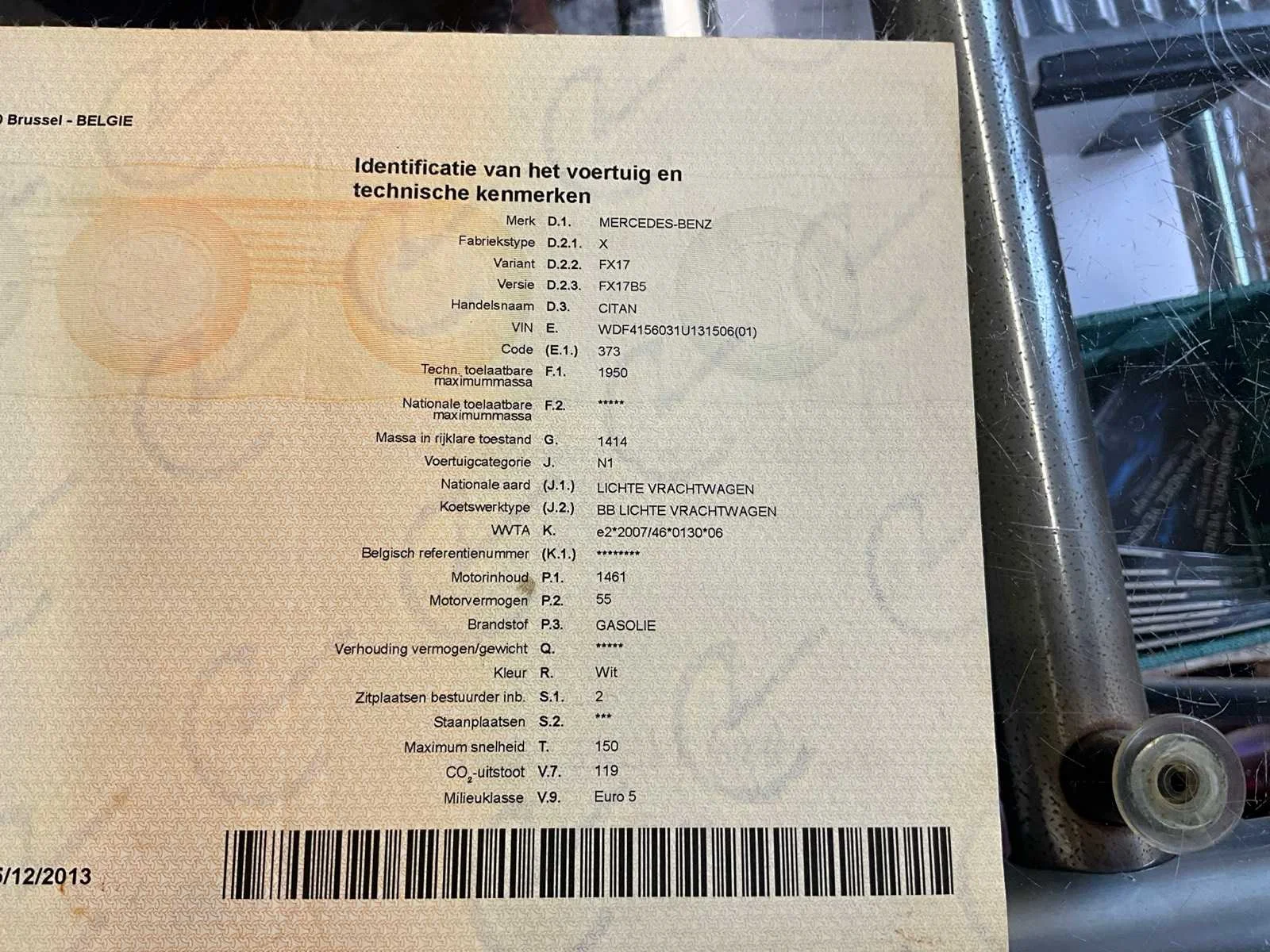 Heeft een barst in de ruit en een deuk in de achterklep, de wagen doet het goed naar behoren. De remmen en distributieset zijn vernieuwd. Nee Merk: Mercedes-Benz Model: Citan Bouwjaar: 2013 Afgelezen kilometerstand: 95825km Cilinderinhoud: 1461cc Vermogen (kW): 55kW Brandstof: diesel Chassisnummer: WDF4156031U131506 Datum eerste toelating: 05/12/2013 Aantal zitplaatsen: 2 Transmissie: Handgeschakeld Emissieklasse: Euro 5 Aantal deuren: 3 Aantal sleutels: 2 Aantal cilinders: 4 Nationaliteit documenten: Belgisch Start en rijdt: Ja startinformatie : Start & rijdt Vavato voert geen technische keuring uit.: true Inschrijvingsbewijs - deel 1 : Aanwezig Inschrijvingsbewijs - deel 2: Aanwezig