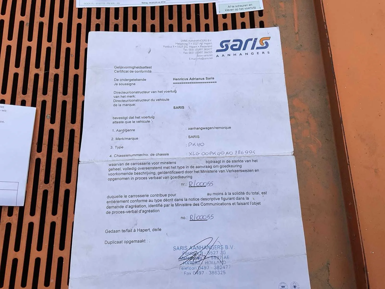 Oprijplaten inclusief, 2 sets zijschotten inclusief. Nee Merk: Saris Type: PK40 Bouwjaar: 2003 Chassisnummer: XLG00PK40A0286995 Aantal assen: 2 Laadbak afmeting l: 310cm Laadbak afmeting b: 168cm Ledig gewicht: 900kg Laadvermogen: 3500kg Datum eerste toelating: 31/03/2003 Kentekenpapieren compleet?: true Nationaliteit documenten: België