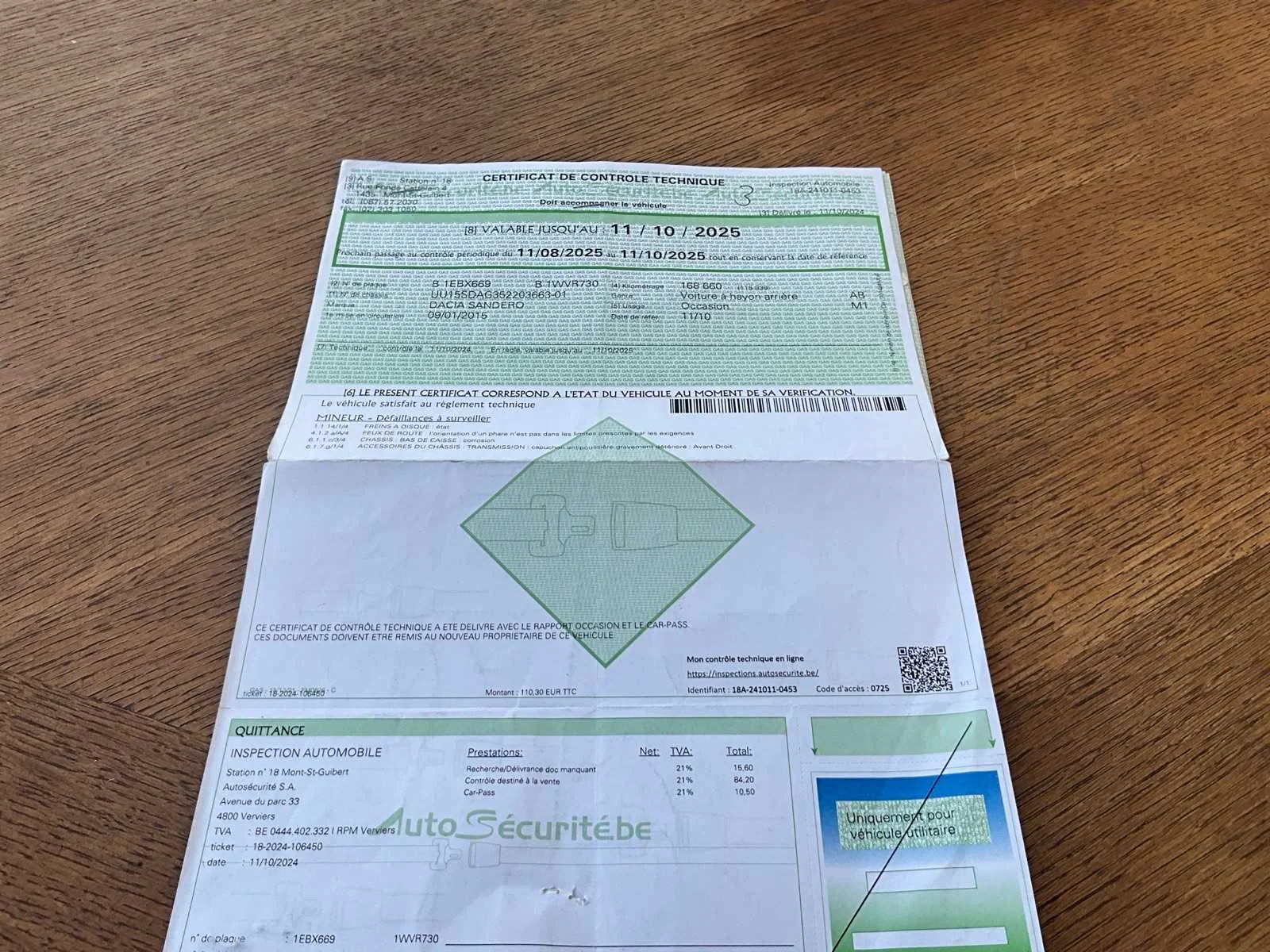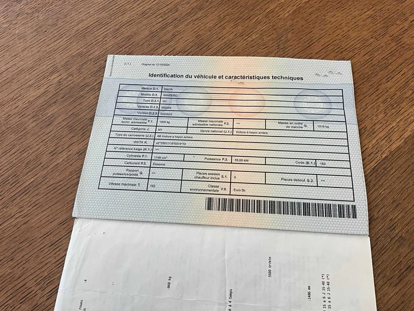 Merk: Dacia Model: Sandero Variant/Versie: SSDAG / SSDAG03 Type carrosserie: AB – Voiture à hayon arrière (Hatchback) Categorie voertuig: M1 (personenwagen) Euronorm: Euro 5b Brandstof: Benzine Kleur: Blauw Chassisnummer (VIN): UU15SDAG352203663(01) Plaats chassisnummer: op het voertuig zichtbaar (gezien in technische fiche) Technische kenmerken Cilinderinhoud: 1.598 cm³ Motorvermogen: 55 kW (75 pk) Aantal cilinders: 4 in lijn Max. vermogen bij toerental: 55 kW bij 5.500 t/min Koppel: 128 Nm bij 3.000 t/min Maximumsnelheid: 162 km/u Massa in rijklare toestand: 1.016 kg Maximaal toegelaten massa (F.2): 1.500 kg Aantal zitplaatsen: 5 Registratie Kentekenplaat: 2GBE563 Documentnummer: 448015146 Datum eerste inschrijving: 09/10/2015 Datum eerste ingebruikname: 09/10/2015 Datum laatste inschrijving: 12/10/2024 Keuring Laatste keuring: 11/10/2024 Geldig tot: 11/10/2025 Kilometerstand bij keuring: 168.860 km Nee Merk: Dacia Bouwjaar: 2015 Afgelezen kilometerstand: 178665km Cilinderinhoud: 1598cc Vermogen (kW): 55kW Brandstof: benzine Chassisnummer: UU15SDAG352203663(01) Datum eerste toelating: 09/10/2015 Vermogen (pk): 75hp Aantal zitplaatsen: 5 Transmissie: handgeschakkeld Stuurwiel: links Emissieklasse: 5B Aantal deuren: 5 Aantal sleutels: 1 Carrosserie: Hatchback Nationaliteit documenten: belg Gelijkvormigheidsattest aanwezig: true Vavato voert geen technische keuring uit.: true Inschrijvingsbewijs - deel 1 : ja Inschrijvingsbewijs - deel 2: ja