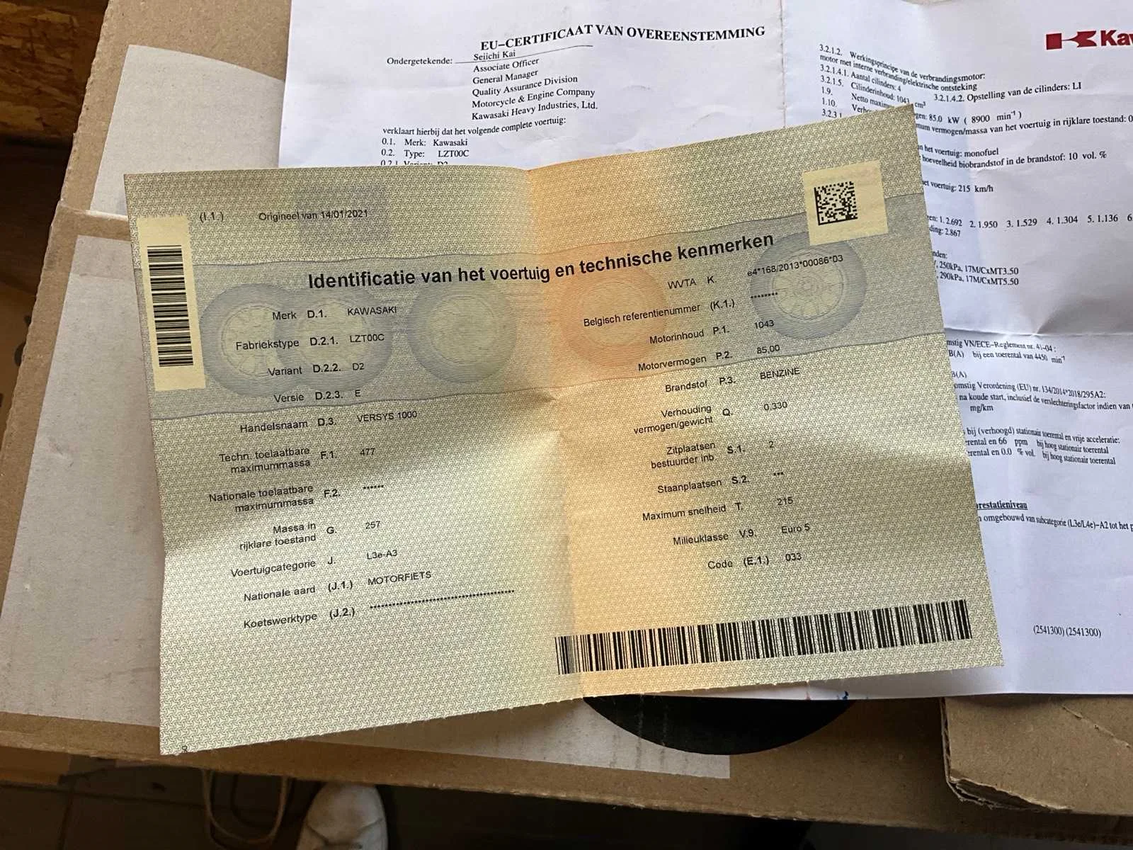 🏍️ Kawasaki Versys 1000 SE (LZT 1000 SE) Merk: Kawasaki Model: LZT 1000 SE Type: Versys 1000 SE Kenteken: MBAP344 Brandstof: Benzine Chassisnummer (VIN): JKALZT00CDA018605(01) Cilinderinhoud: 1043 cc Vermogen: 85,00 kW (≈ 116 pk) Kleur: Groen / Zwart metallic Afgelezen tellerstand: 1.709 km Transmissie: Quikshift (automatische op/afschakeling zonder koppeling) Aantal sleutels: 2 Datum eerste toelating: 14/01/2021 Bouwjaar: 2021 Gewicht (rijklaar): 257 kg Max. snelheid: 215 km/u Koetswerktype: Motorfiets Voertuigcategorie: L3e-A3 Brandstofverbruik: 5,5 l/100 km Milieuklasse: Euro 5 CO₂-uitstoot: 128 g/km Boekjes/documenten aanwezig: Ja Handelsbenaming: Versys 1000 SE Nationale aard documenten: BE 📦 Uitvoering & opties Kleur “Emerald Green / Metallic Black” Quikshift up/down 2 sleutels Topkoffer ABS, KQS (Kawasaki Quick Shifter) TFT-display met Sport/Touring modes LED-verlichting Handvatverwarming Cruise control Verstelbaar windscherm Nee Merk: Kawasaki Model: LZT 1000SE Type: Versys 1000 SE Brandstof: Benzine Chassisnummer: JKALZT00CDA018605(01) Cilinderinhoud: 1043cc Datum eerste toelating: 14012021 Gewicht: 257kg Vermogen (kW): 85kW Kleur: Groen / Zwart metallic Afgelezen kilometerstand: 1709km Transmissie: Quikshift (automatische op/afschakeling zonder koppeling) Handelsbenaming: Versys 1000 SE Nationaliteit documenten: Belg Boorddocumenten aanwezig?: true Aantal sleutels: 2 Bouwjaar: 2021