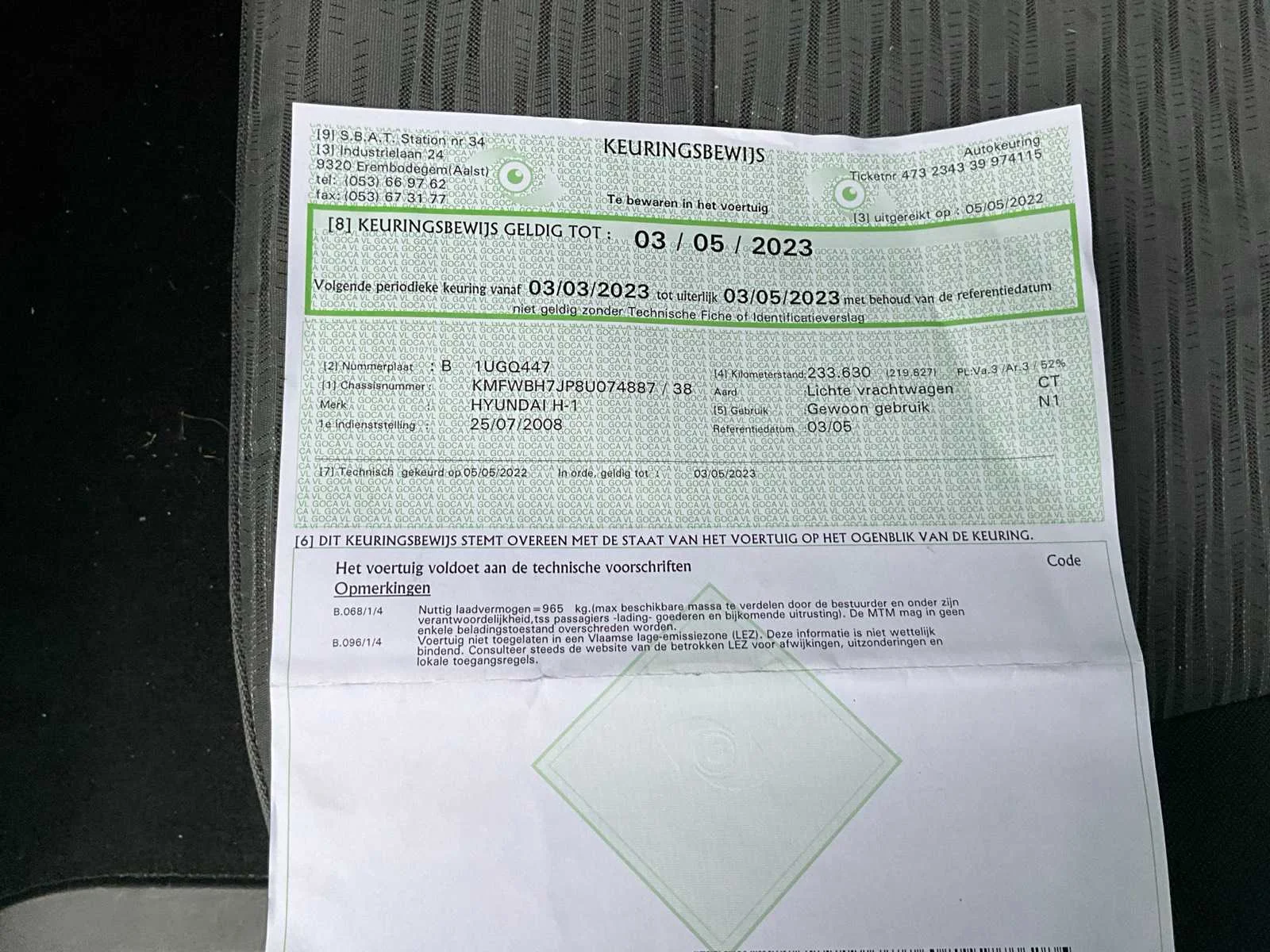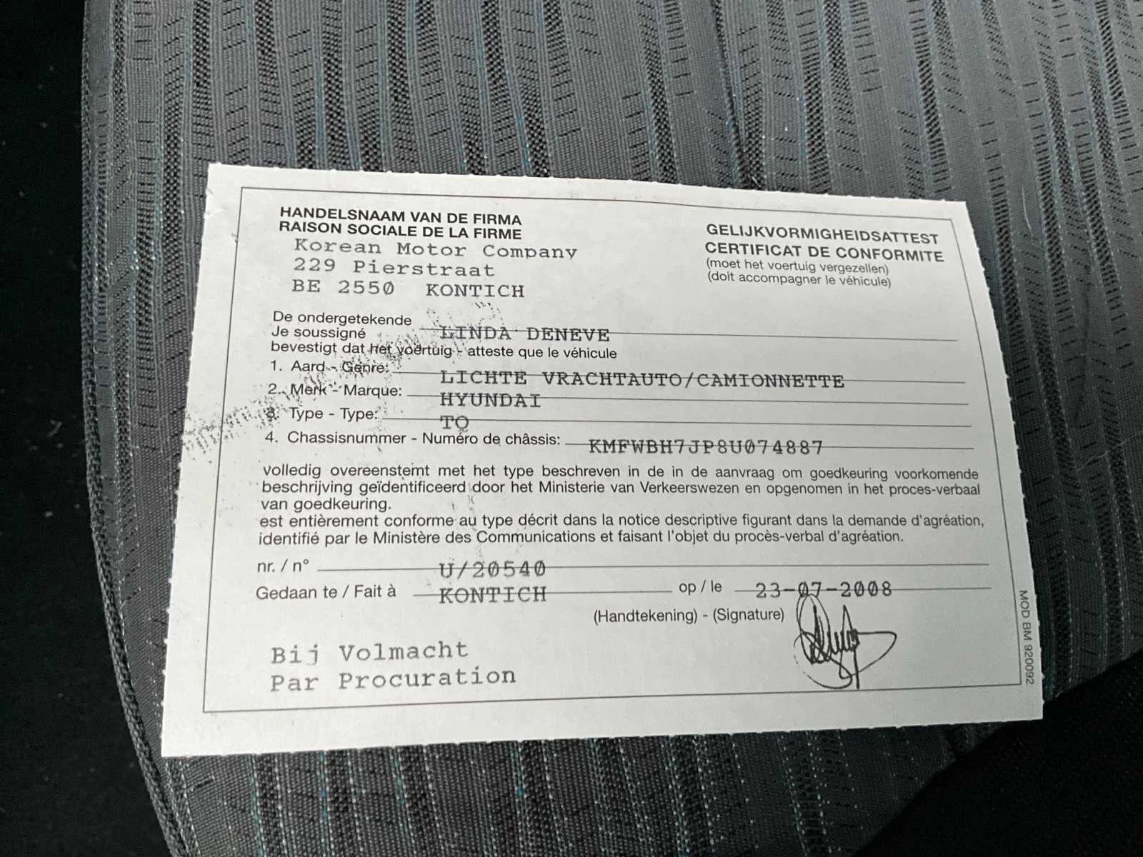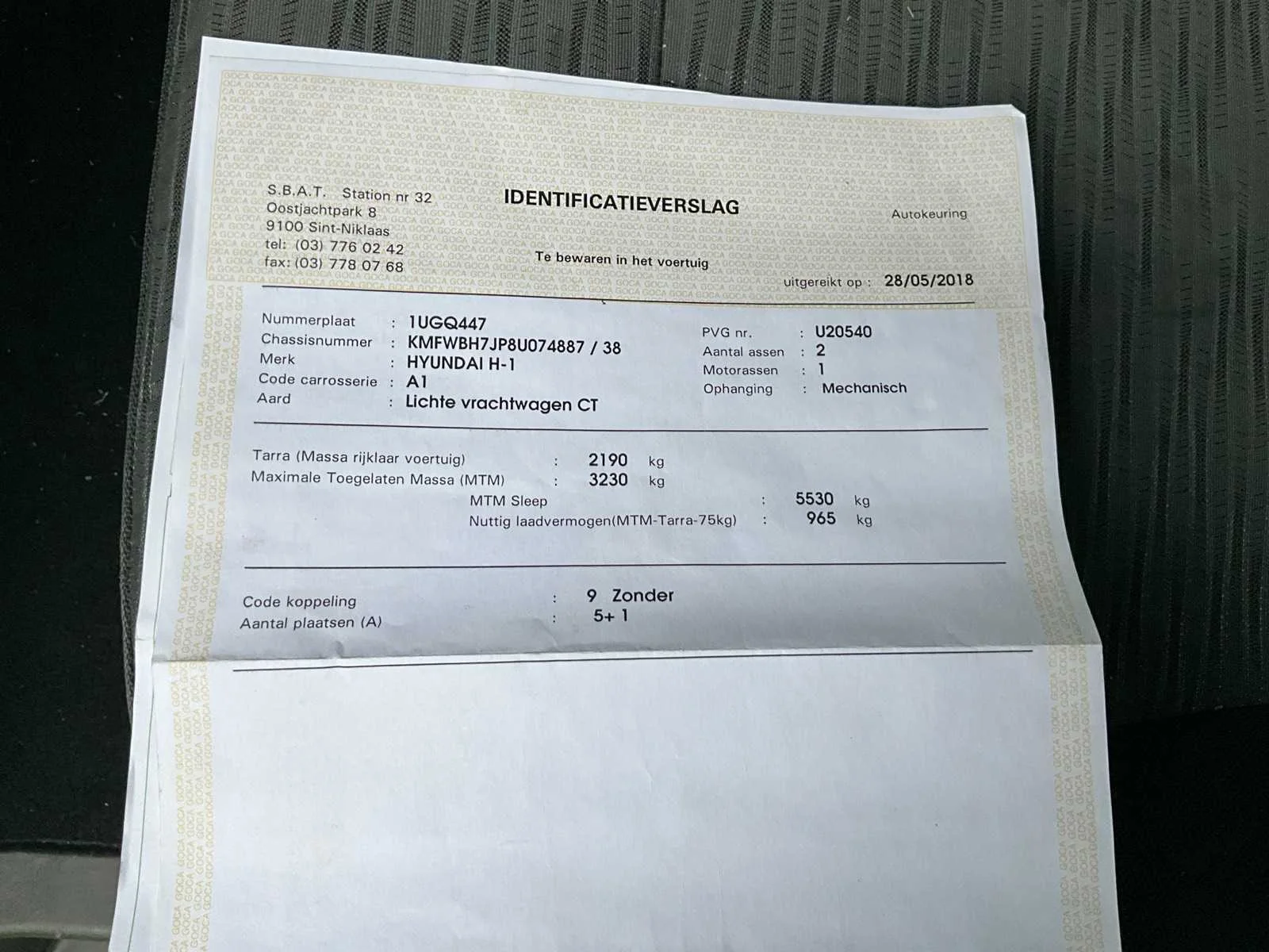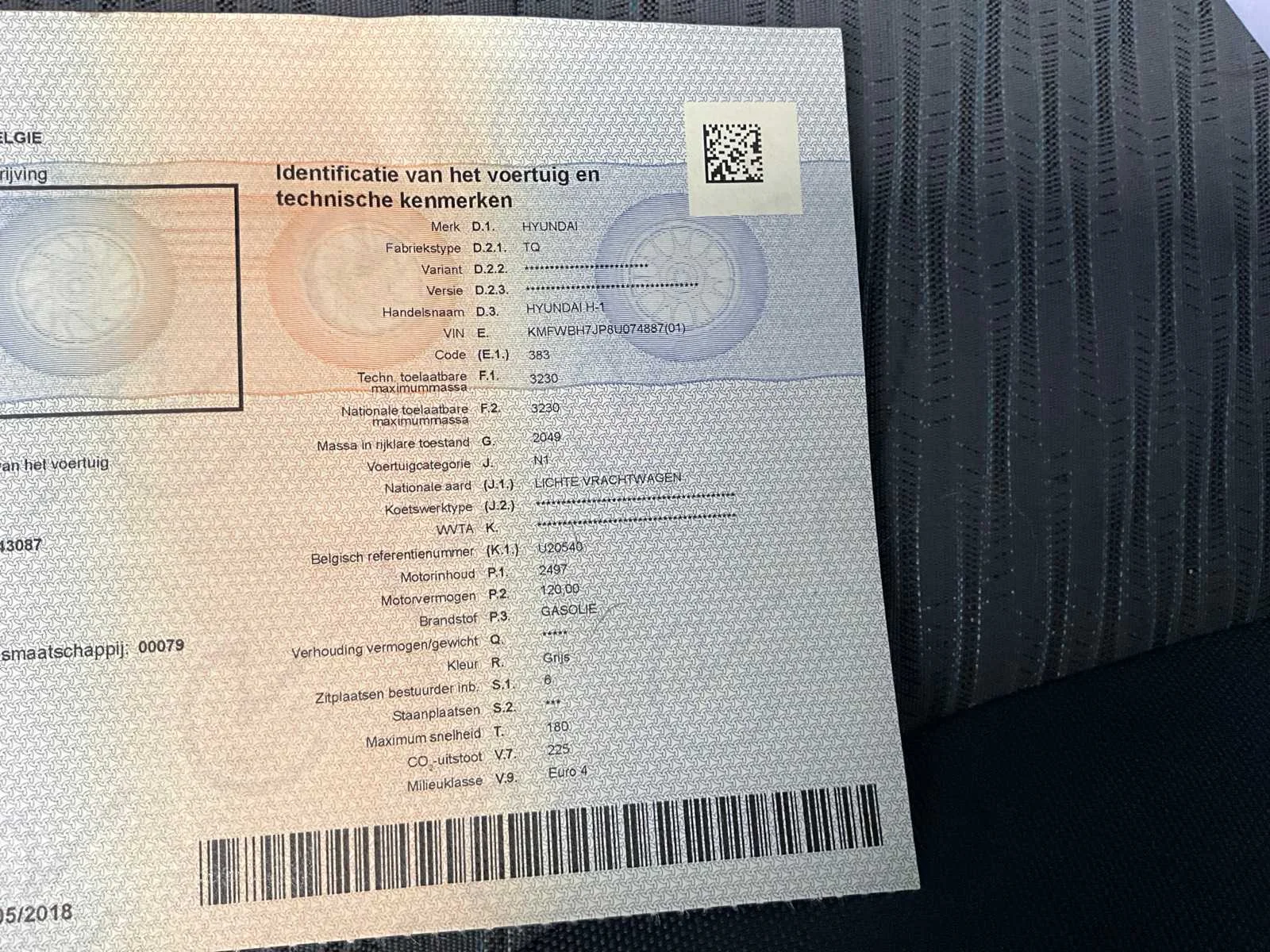 Basisgegevens: Merk: Hyundai Model: H-1 Fabrikantcode: TQ Chassisnummer (VIN): KMFWBH7JP8U074887 Datum eerste inschrijving: 25/07/2008 Voertuigcategorie: N1 (lichte vrachtwagen) Brandstof: Benzine Kleur: Grijs ⚙️ Technische gegevens: Cilinderinhoud: 2497 cc Vermogen: 120 kW (≈163 pk) Transmissie: Manueel Max. toegelaten massa (MTM): 3230 kg Tarra (eigen gewicht): 2190 kg Laadvermogen: ca. 965 kg Aantal assen: 2 Zitplaatsen: 5 + 1 CO₂-uitstoot: 225 g/km Milieuklasse: Euro 4 Maximum snelheid: 180 km/u Aard: Lichte vrachtwagen CT Nee Merk: Hyundai Model: H-1 Bouwjaar: 2008 Cilinderinhoud: 2497cc Vermogen (kW): 120kW Brandstof: benzine Chassisnummer: KMFWBH7JP8U074887 Laadvermogen: 965kg Datum eerste toelating: 25072008 Vermogen (pk): 163hp Aantal zitplaatsen: 6 Kleur: grijs Transmissie: manueel Stuurwiel: links Emissieklasse: 4 Aantal sleutels: 1 Nationaliteit documenten: BE CO2-uitstoot NEDC: 225 Vavato voert geen technische keuring uit.: true Inschrijvingsbewijs - deel 1 : aanwezig Inschrijvingsbewijs - deel 2: aanwezig