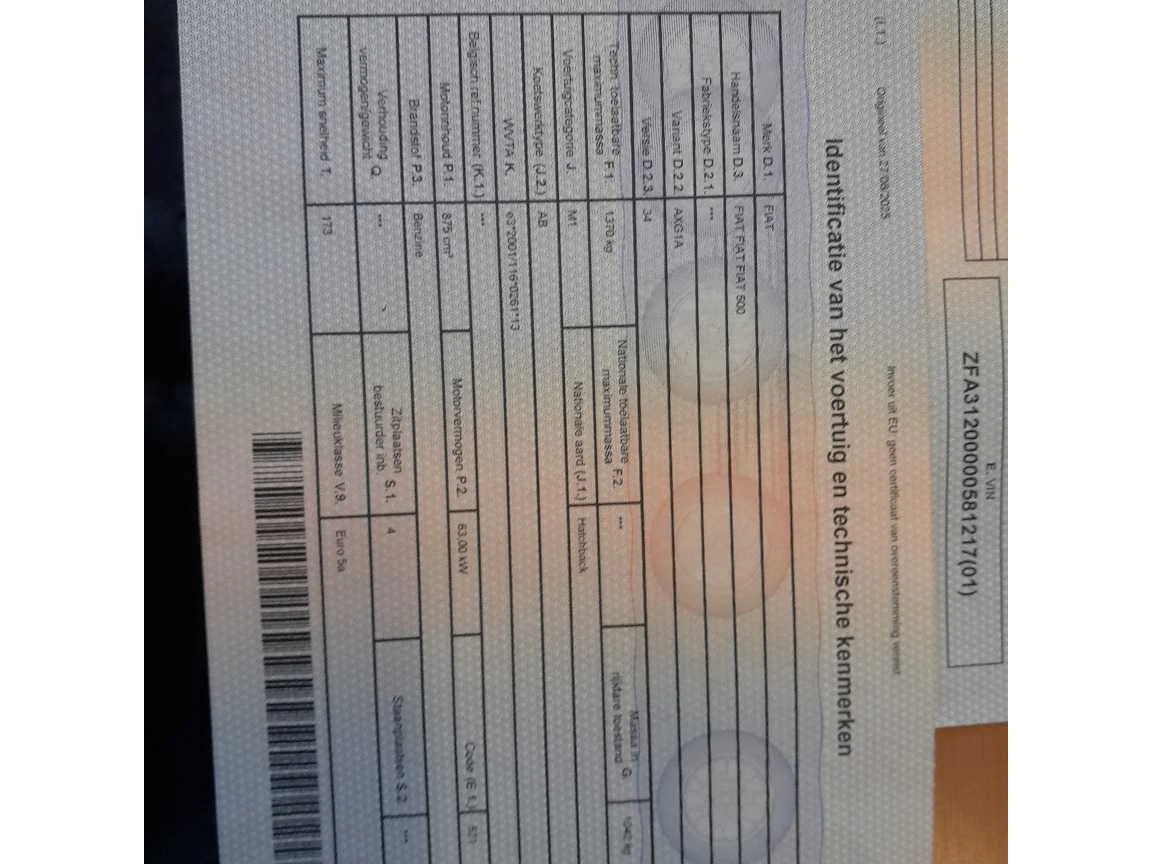 Fiat 500 1.2 Benzine - 30/09/2010 - 63 kW - Start en rijdt Algemene informatie • Merk en model: Fiat 500 • Eerste inschrijving: 30/09/2010 • Brandstof: Benzine • Motor: – 63 kW (85 pk) • Transmissie: Manueel • Kilometerstand: 176000 km • Carrosserietype: Hatchback • Chassisnummer: ZFA31200000581217 • Keuringsbewijs geldig tot 04/06/2026 • Geen BTW wagen Uitrusting en opties • Glasdak • Airco • Elektrische ruiten • Aluminium velgen • Centrale vergrendeling • Radio CD • 4 zitplaatsen Staat • Wagen start en rijdt goed • Rondom gebruikssporen en schade (zie foto’s) • Technisch in orde volgens keuringsbewijs • Asymmetrische slijtage van band en kleine olievlek opgemerkt bij keuring (geen reden tot afkeuring) Samenvatting Fiat 500 benzine met 176000 km, rijdt goed maar heeft rondom gebruikssporen en schade. Ideale wagen voor dagelijks gebruik of als budgetvriendelijke stadsauto. Geldig keuringsbewijs tot 04/06/2026. Nee Merk: Fiat Model: 500 Bouwjaar: 2010 Afgelezen kilometerstand: 17600km Vermogen (kW): 63kW Brandstof: benzine Chassisnummer: ZFA31200000581217 Vermogen (pk): 85hp Aantal zitplaatsen: 4 Transmissie: manueel Aantal sleutels: 1 Carrosserie: hatchback Nationaliteit documenten: BE Vavato voert geen technische keuring uit.: true Inschrijvingsbewijs - deel 1 : aanwezig Inschrijvingsbewijs - deel 2: aanwezig