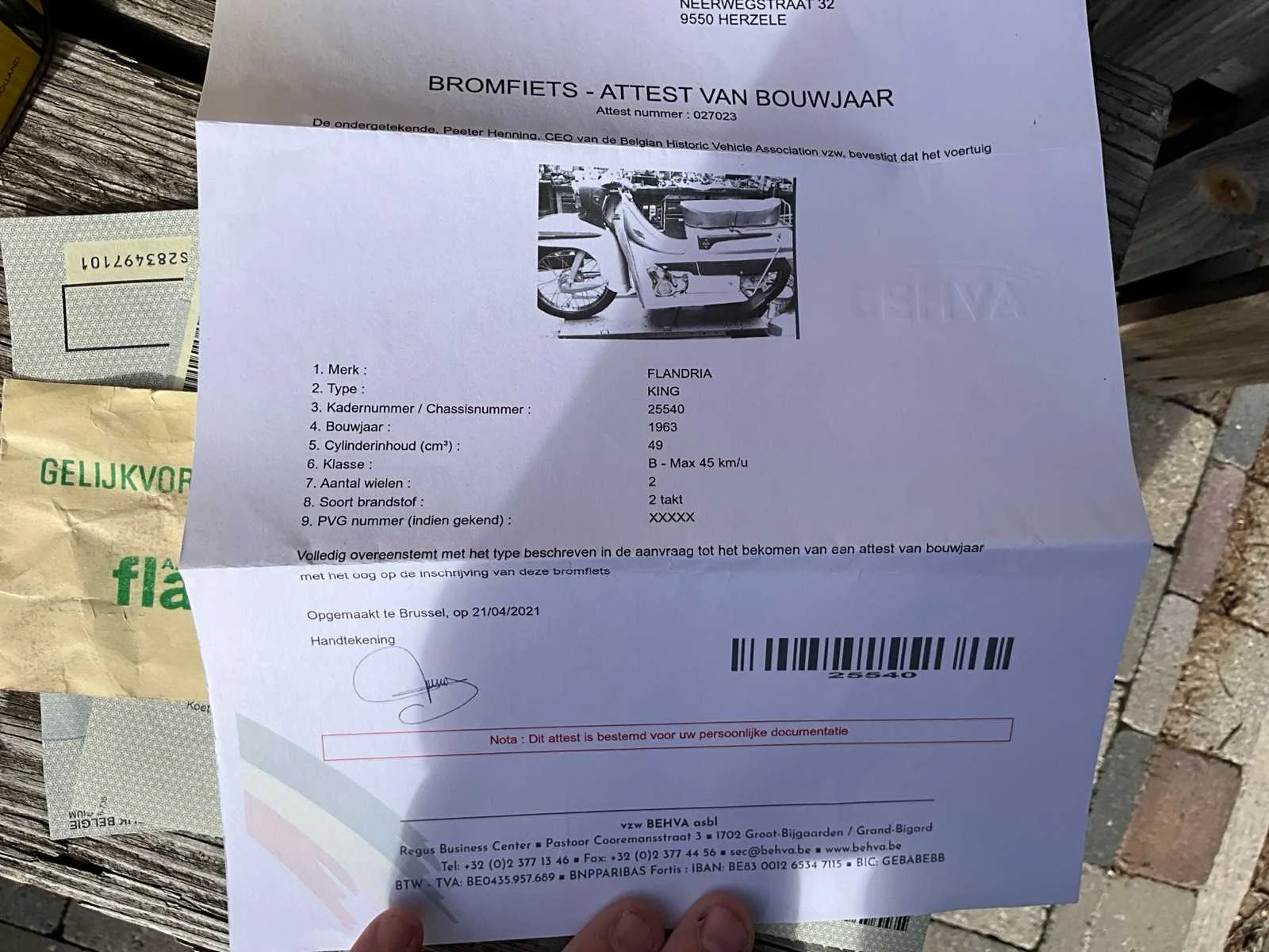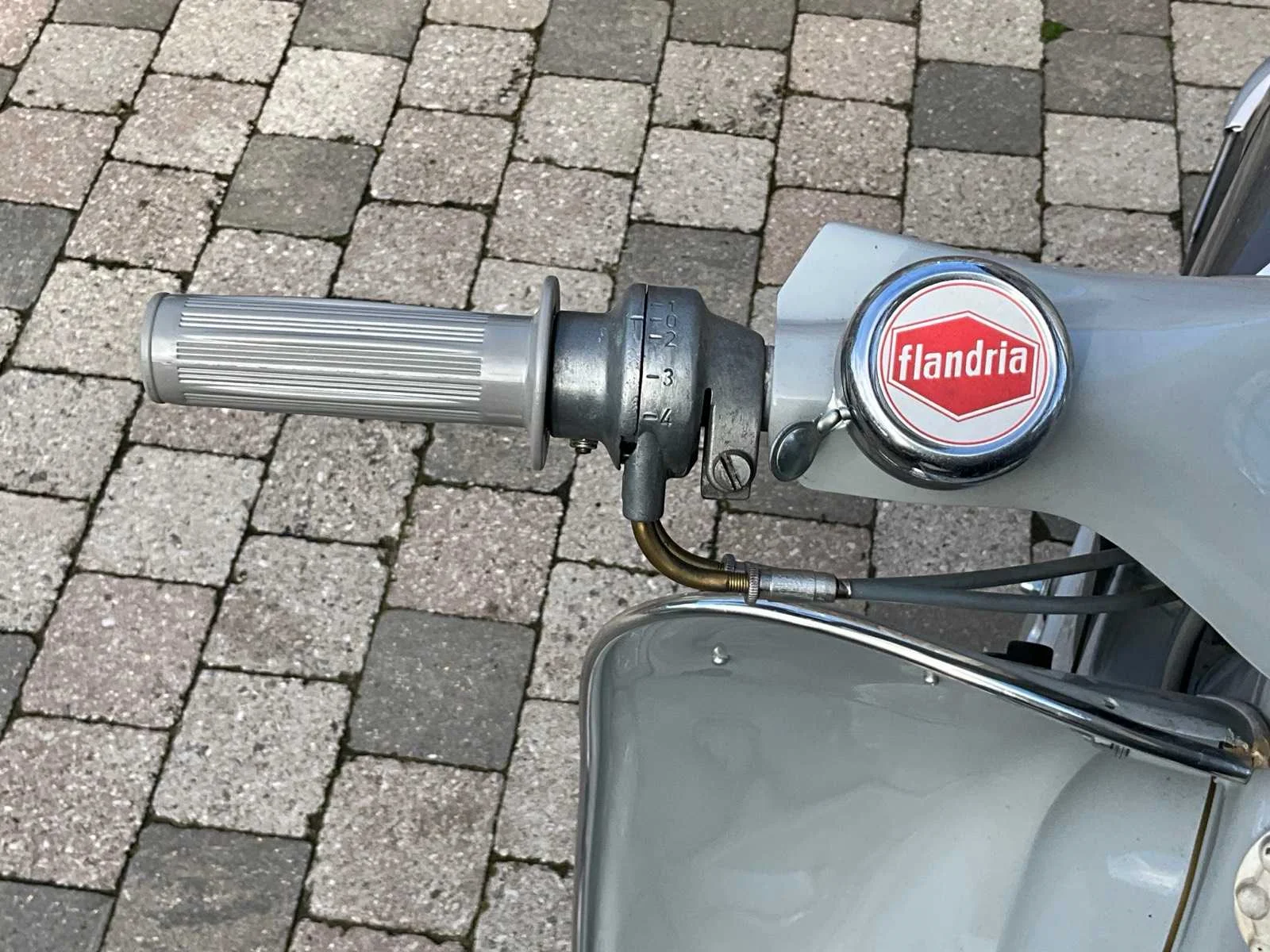 Blok gereviseerd Volledig gerestaureerd Nieuwe banden Nee Merk: Flandria Model: King Kenteken: OSBN757 Datum eerste toelating: 01/01/1963 Transmissie: Manueel, kettingaandrijving Brandstof: Benzine (2-takt, mengsmering) Kleur: wit/creme Bouwjaar: 1963 Chassisnummer: 25540 GS Code: 87115000
