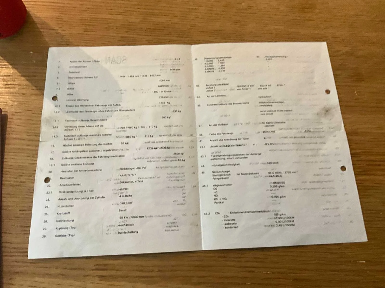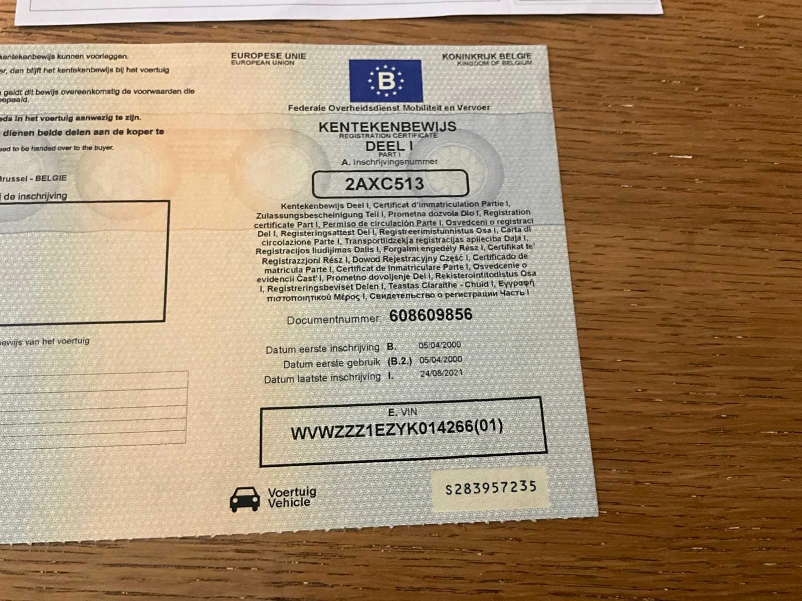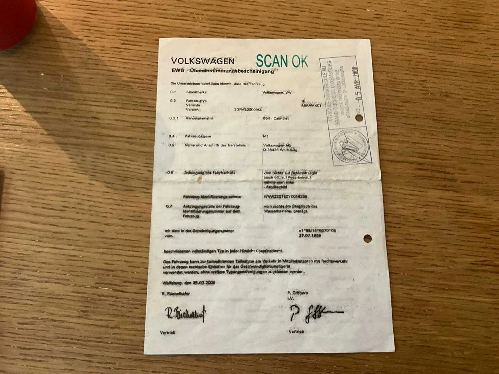 ⚙️ Technische gegevens: Merk: Volkswagen Model: Golf Koetswerktype: Cabriolet Brandstof: Benzine Motorinhoud: 1781 cc Vermogen: 55 kW (75 pk) Euronorm: Euro 4 Bouwjaar: 2000 Datum eerste inschrijving: 05/04/2000 Chassisnummer (VIN): WVWZZZ1EZYK014266 Inschrijvingsnummer: 2AXC513 Aantal zitplaatsen: 4 Kleur: Donkergroen (af fabriek Gölf Cabriolet) Documenten aanwezig: ✅ Inschrijvingsbewijs ✅ Identificatiebewijs ✅ Gelijkvormigheidsattest (origineel Volkswagen AG) Nee Merk: Volkswagen Model: Golf Type: Cabriolet Bouwjaar: 2000 Vermogen (kW): 55kW Brandstof: benzine Chassisnummer: WVWZZZ1EZYK014266 Vermogen (pk): 75hp Aantal zitplaatsen: 4 Transmissie: manueel Stuurwiel: links Emissieklasse: 4 Aantal deuren: 3 Aantal sleutels: 1 Start en rijdt: ja Vavato voert geen technische keuring uit.: true Inschrijvingsbewijs - deel 1 : Aanwezig Inschrijvingsbewijs - deel 2: Aanwezig