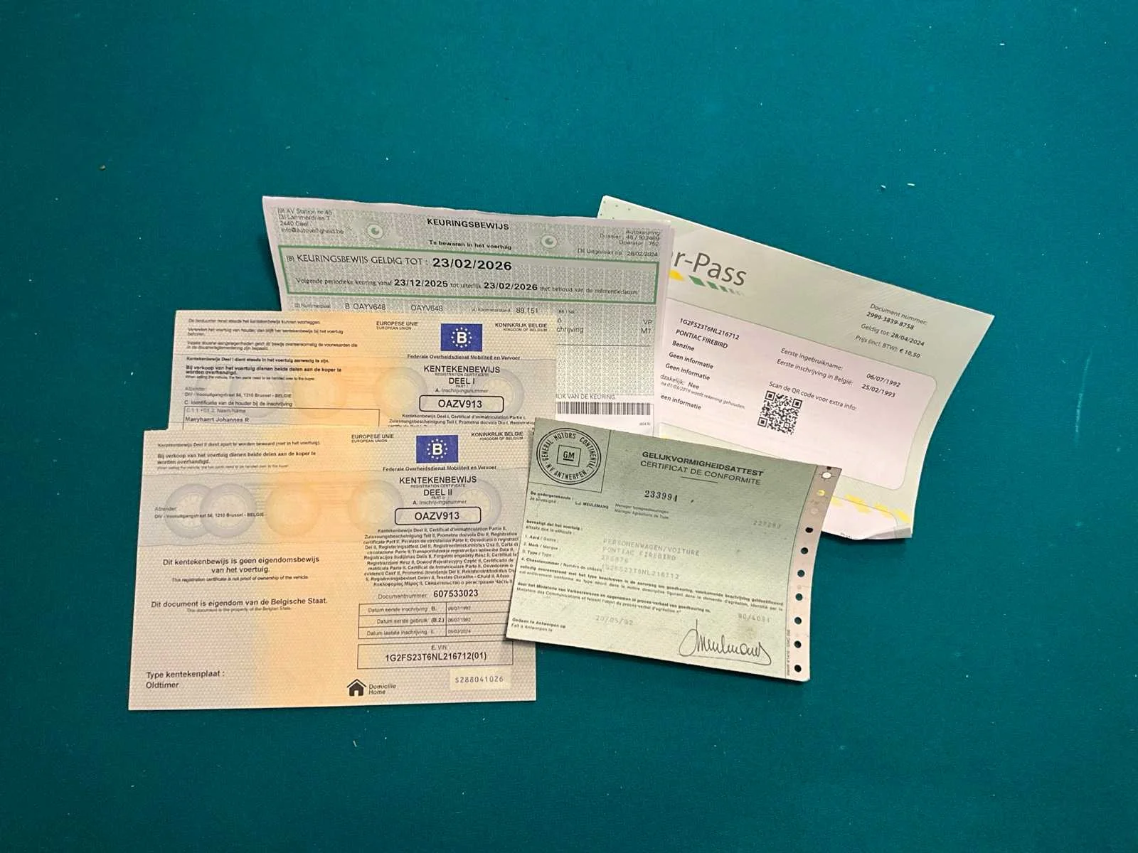 Airco losgekoppeld maar aanwezig, Koplampmotor na te kijken Nee Merk: Pontiac Model: Firebird Bouwjaar: 1992 Afgelezen kilometerstand: 91073km Vermogen (kW): 102kW Brandstof: benzine Chassisnummer: 1G2FS23T6NL216712/71 Datum eerste toelating: 25/02/1993 Aantal zitplaatsen: 4 Transmissie: Automaat Aantal deuren: 3 Aantal sleutels: 1 Aantal cilinders: 6 Carrosserie: T-roof Nationaliteit documenten: BE Onderhoudshistorie: Aanwezig Gelijkvormigheidsattest aanwezig: true Keuringsrapport geldig tot: 23/02/2026 Inschrijvingsbewijs - deel 1 : Aanwezig Inschrijvingsbewijs - deel 2: Aanwezig