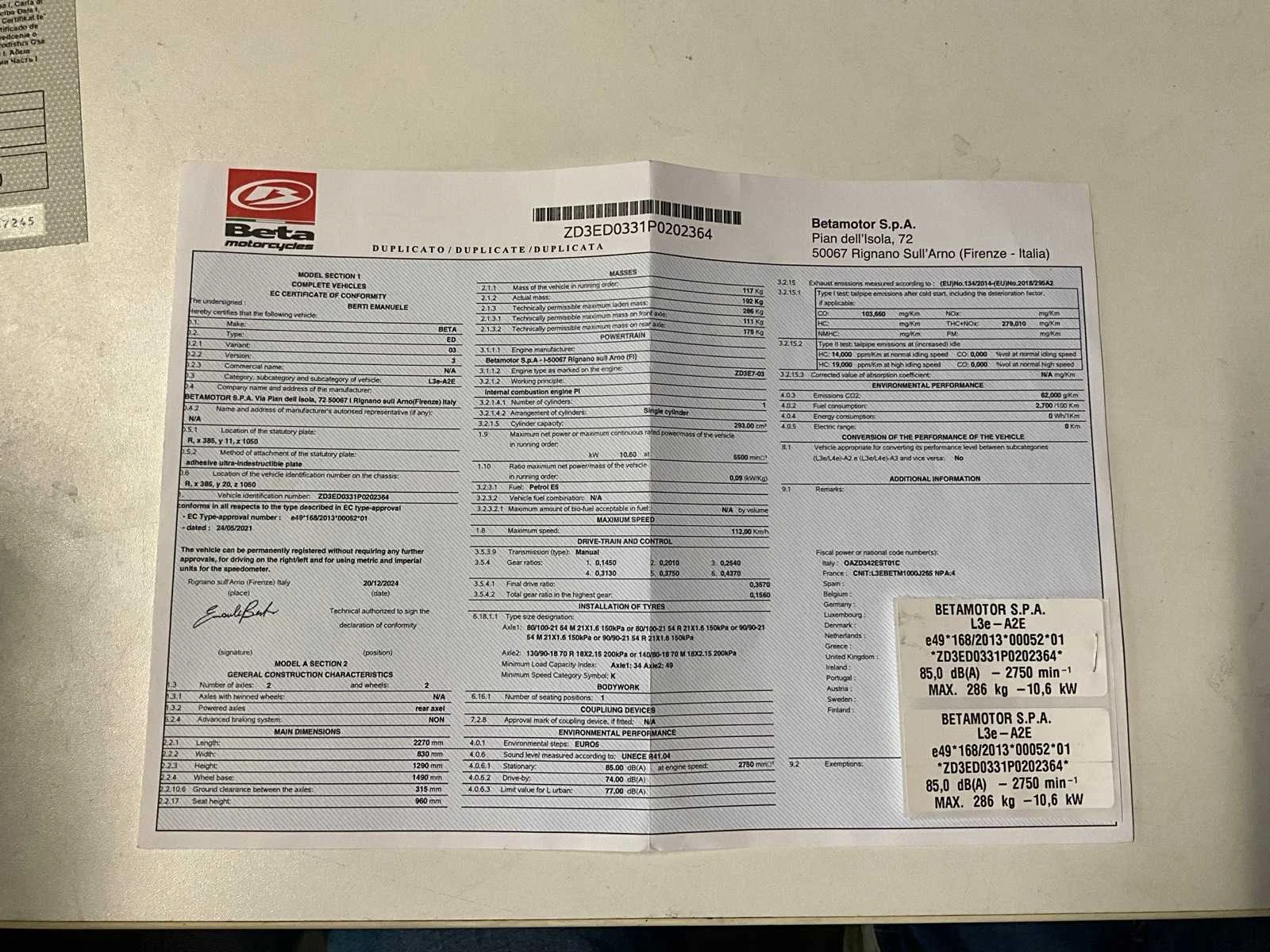 Nee Merk: Bèta Model: RR300 Brandstof: Benzine Chassisnummer: ZD3ED0331P0202364 Cilinderinhoud: 293cc Datum eerste toelating: 17/08/2022 Gewicht: 117kg Vermogen (kW): 10kW Afgelezen kilometerstand: 3443km Nationaliteit documenten: BE Boorddocumenten aanwezig?: true Startinformatie: Start en rijdt