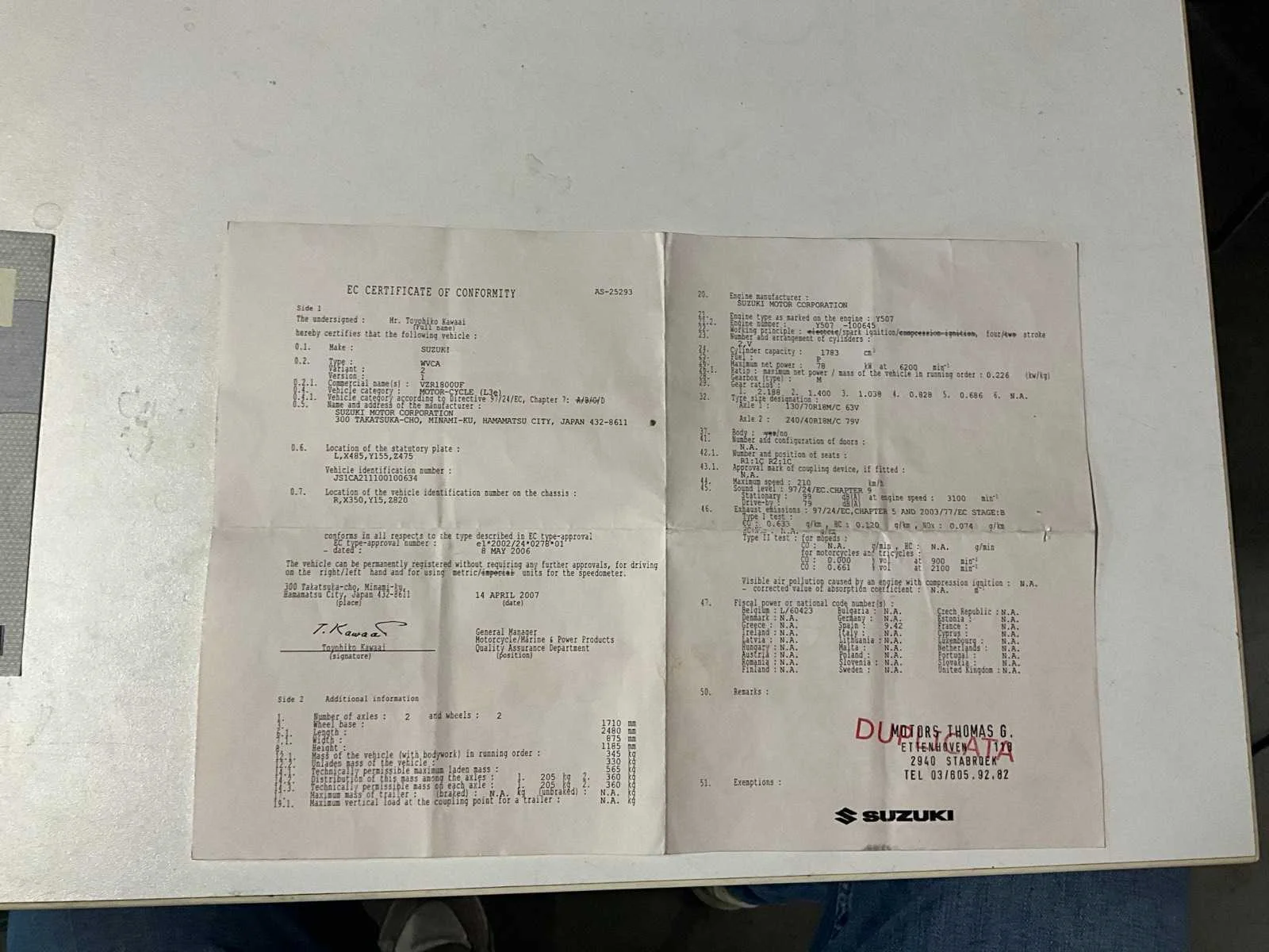 Olie lekt mogelijks bij lange stilstand Nee Merk: Suzuki Model: VZR1800 Brandstof: Benzine Chassisnummer: JS1CA211100100634 Cilinderinhoud: 1783cc Datum eerste toelating: 14/11/2007 Gewicht: 420kg Vermogen (kW): 78kW Nationaliteit documenten: BE Bouwjaar: 2007