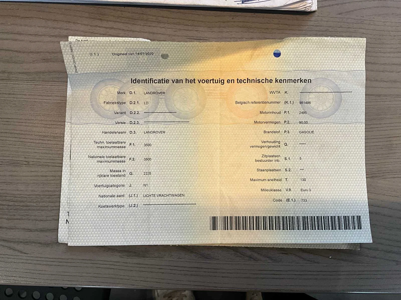 Gebruiksschade zichtbaar op foto’s Nee Merk: Defender Model: 130 Bouwjaar: 2007 Afgelezen kilometerstand: 123653km Cilinderinhoud: 2495cc Vermogen (kW): 90kW Brandstof: diesel Chassisnummer: SALLDKH586A729698 Datum eerste toelating: 17/01/2007 Aantal zitplaatsen: 5 Transmissie: Handgeschakeld Aantal deuren: 4 Ledig gewicht: 2225kg Carrosserie: SUV/Off-Road/Pick-Up Nationaliteit documenten: BE Gelijkvormigheidsattest aanwezig: true Inschrijvingsbewijs - deel 1 : Aanwezig Inschrijvingsbewijs - deel 2: Aanwezig