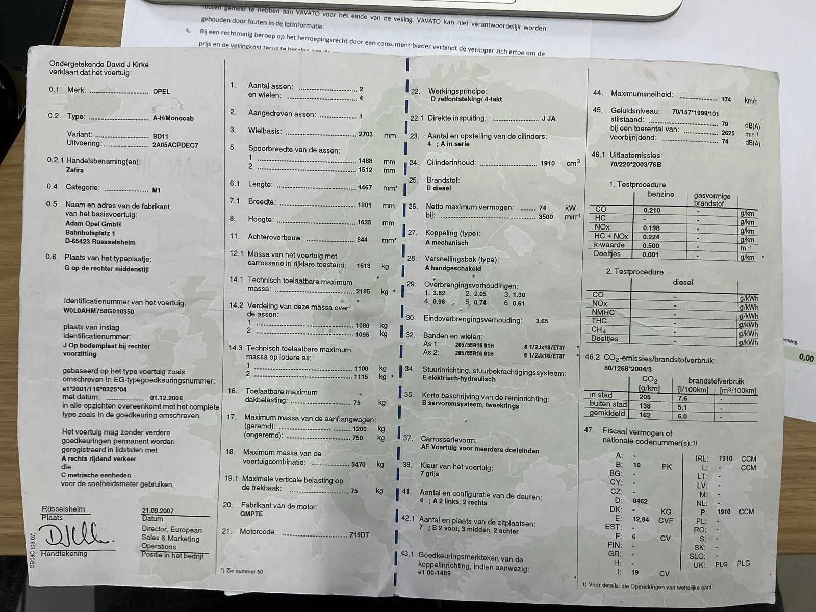 Te vervangen: Middenbuis van de uitlaat is afgebroken door roest. Einddemper WEL ok! Nee Merk: Opel Model: Zafira Bouwjaar: 2008 Afgelezen kilometerstand: 195000km Cilinderinhoud: 1910cc Vermogen (kW): 74kW Brandstof: diesel Chassisnummer: W0LOAHM758G01350 Datum eerste toelating: 17/01/2008 Aantal zitplaatsen: 7 Maximaal trekgewicht ongeremd: 750kg Maximaal trekgewicht geremd: 1200kg Transmissie: Handgeschakeld Emissieklasse: Euro 4 Aantal deuren: 5 Aantal sleutels: 2 Ledig gewicht: 1613kg Carrosserie: MPV Nationaliteit documenten: BE Gelijkvormigheidsattest aanwezig: true Start en rijdt: Ja Keuringsrapport geldig tot: 03/01/2026 startinformatie : Start, rijdt, remt Vavato voert geen technische keuring uit.: true Inschrijvingsbewijs - deel 1 : Aanwezig Inschrijvingsbewijs - deel 2: Aanwezig