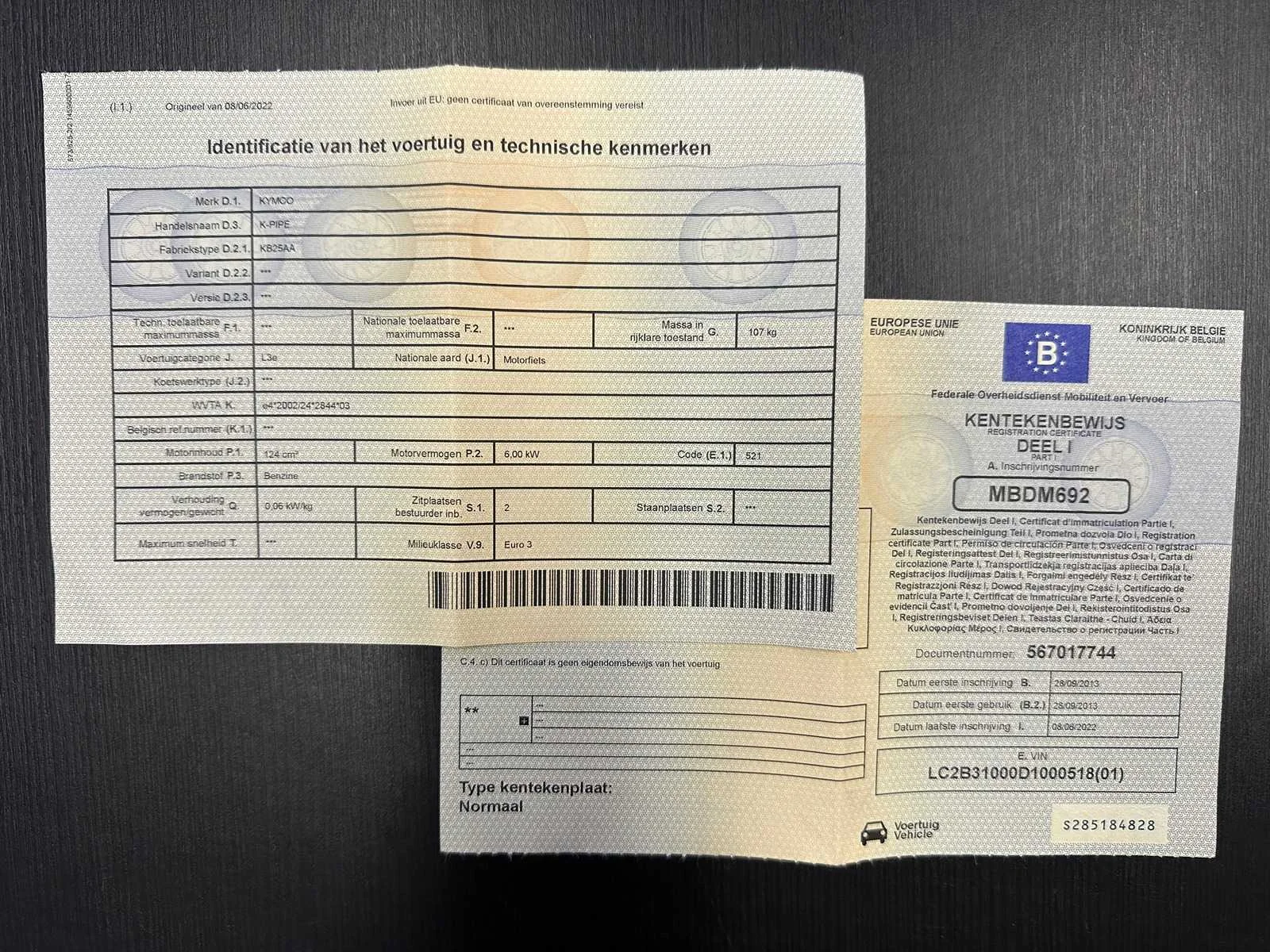 Kymco K-Pipe 125 van 2013 met slechts 7782km op de teller. Deze lichte 125cc motorfiets staat klaar om terug op de baan te gaan. De motorfiets kreeg een volledig onderhoud en kan zo terug ingeschreven worden. Door valschade moesten enkele kuipdelen en een pinker vervangen worden. Van de valschade is niets meer zichtbaar. Tevens werden de banden en de kettingspanners vervangen. Deze motorfiets beschikt over een semi-automatische versnelling. Er is geen koppeling, je hoeft enkel met je voet de versnelling te verzetten en verder doet de motorfiets het werk zelf. Nee Merk: Kymco Model: K-Pipe 125 Type: KB25AA Brandstof: Benzine Chassisnummer: LC2B31000D1000518 Cilinderinhoud: 124cc Datum eerste toelating: 28/09/2013 Gewicht: 107kg Vermogen (kW): 6kW Kleur: Wit Afgelezen kilometerstand: 7782km Transmissie: Semi-Automatisch Nationaliteit documenten: Belgisch Aantal sleutels: 1 Boorddocumenten aanwezig?: true Startinformatie: Start, rijdt en remt Bouwjaar: 2013