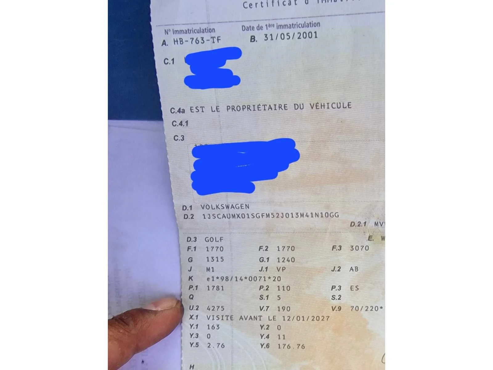 Nee Merk: Volkswagen Model: Golf 4 1.8T 20V Bouwjaar: 2001 Afgelezen kilometerstand: 257031km Cilinderinhoud: 1770cc Vermogen (kW): 110kW Brandstof: Benzine Chassisnummer: 1JSCAUMX01SGFM52J013M41N10GG Datum eerste toelating: 31/05/2001 Vermogen (pk): 150hp Ledig gewicht: 1240kg Nationaliteit documenten: FR Start en rijdt: Ja Andere boorddocumenten: Franse papieren startinformatie : Start, rijdt, remt Vavato voert geen technische keuring uit.: true Inschrijvingsbewijs - deel 1 : Frans doc