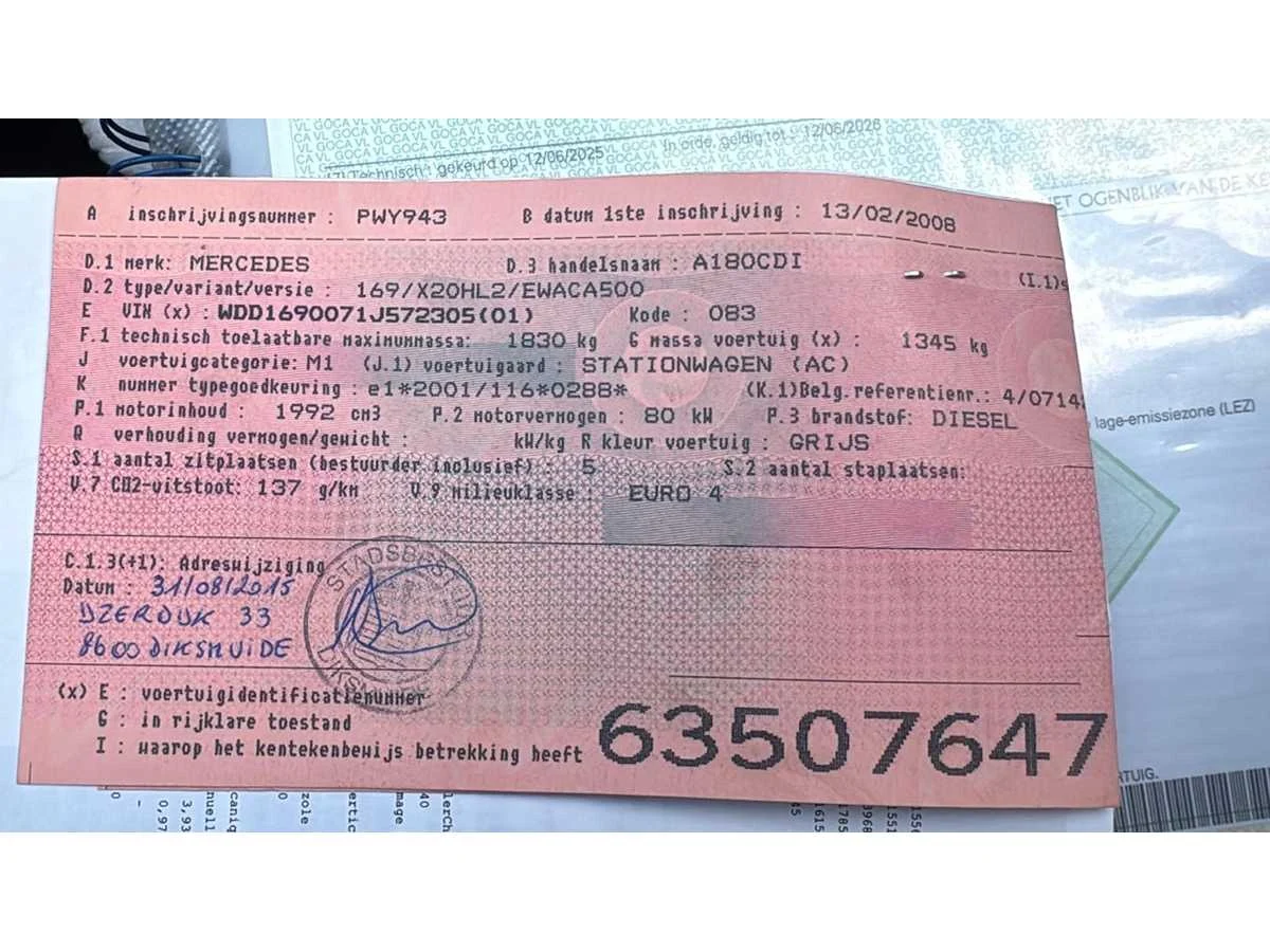 No Merk: Mercedes Model: A180 Type: CDI Bouwjaar: 2008 Afgelezen kilometerstand: 253320km Cilinderinhoud: 1992cc Vermogen (kW): 80kW Brandstof: Diesel Datum eerste toelating: 13/02/2008 Emissieklasse: Euro 4 Ledig gewicht: 1345kg Nationaliteit documenten: BE CO2-uitstoot NEDC: 137 Gelijkvormigheidsattest aanwezig: true Start en rijdt: Ja Keuringsrapport geldig tot: 21/02/2025 startinformatie : Start, rijdt, remt Vavato voert geen technische keuring uit.: true Inschrijvingsbewijs - deel 1 : OK Inschrijvingsbewijs - deel 2: OK