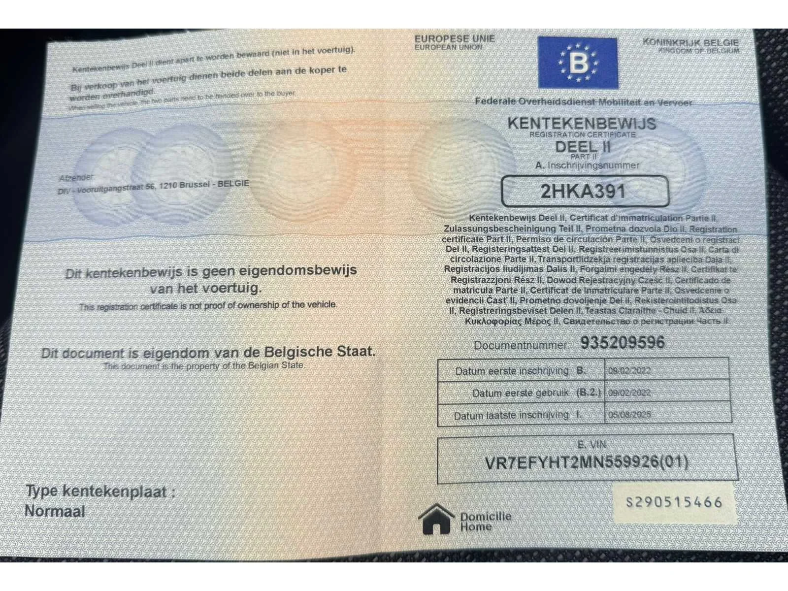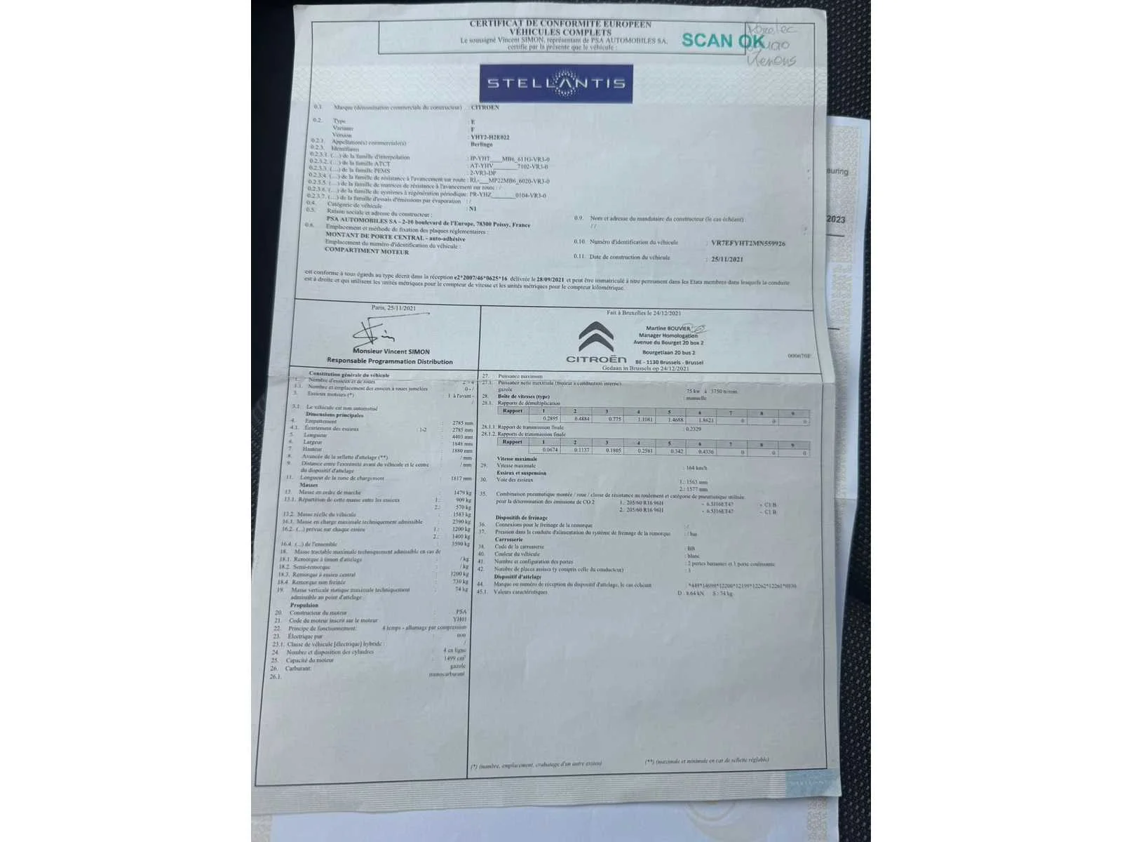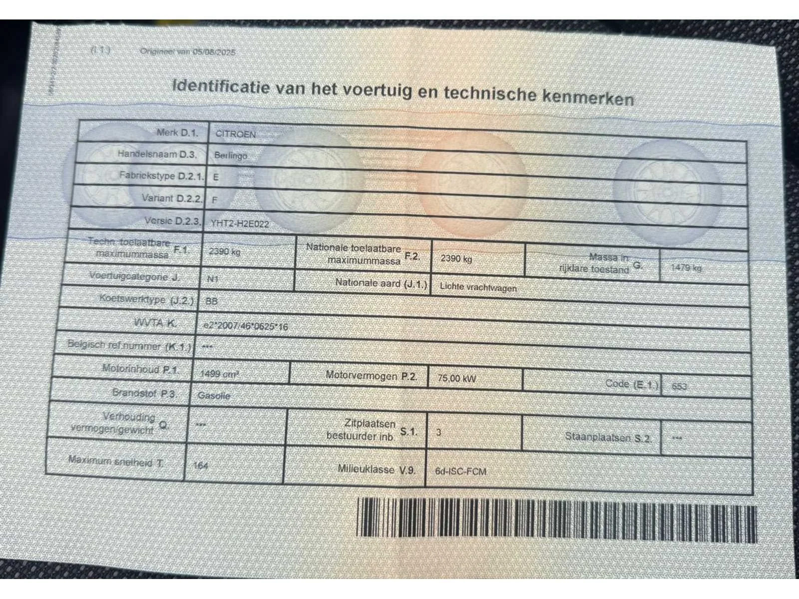 Nieuwe distributieriem en roetfilter! Nee Merk: Citroën Model: Berlingo Bouwjaar: 2022 Afgelezen kilometerstand: 129671km Cilinderinhoud: 1499cc Vermogen (kW): 75kW Brandstof: diesel Chassisnummer: VR7EFYHT2MN559926 Datum eerste toelating: 9/02/2022 Vermogen (pk): 100hp Aantal zitplaatsen: 3 Transmissie: Handgeschakeld Emissieklasse: 6d-ISC-FCM Nationaliteit documenten: Belgisch Gelijkvormigheidsattest aanwezig: true Start en rijdt: Ja Keuringsrapport geldig tot: 29/07/2026 Vavato voert geen technische keuring uit.: true Airconditioning: true Navigatie: true Inschrijvingsbewijs - deel 1 : Aanwezig Inschrijvingsbewijs - deel 2: Aanwezig