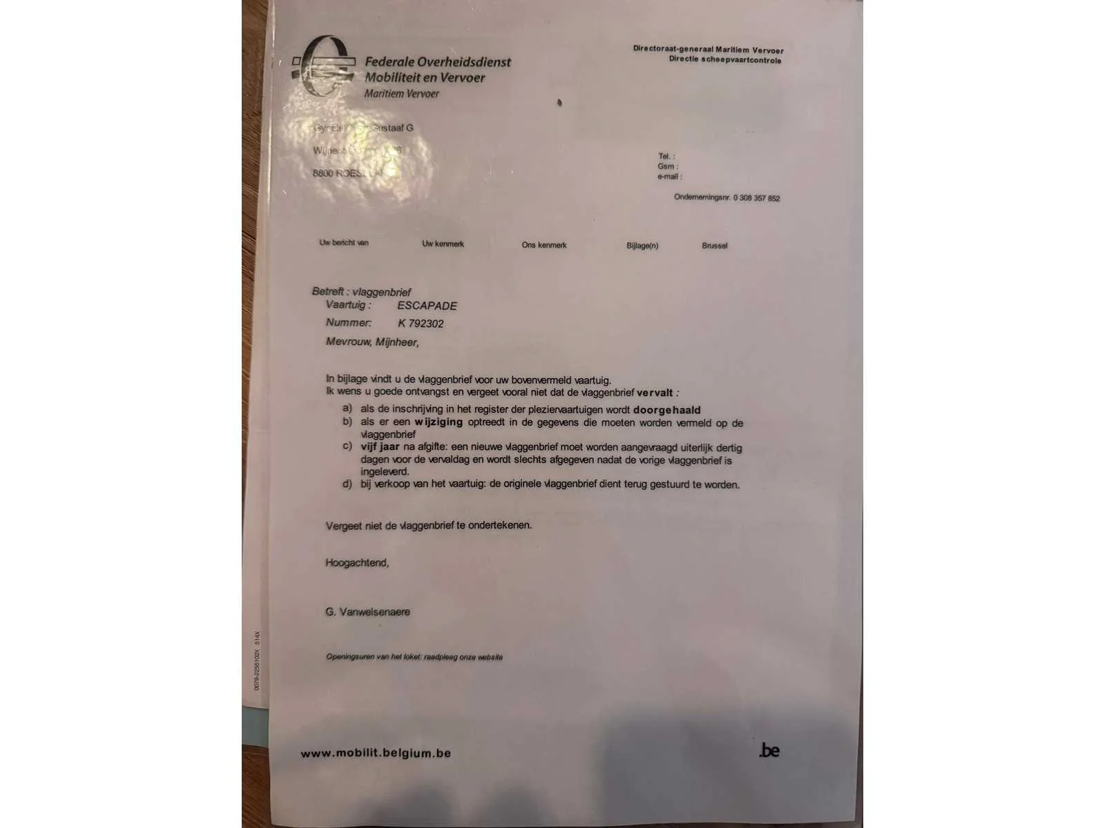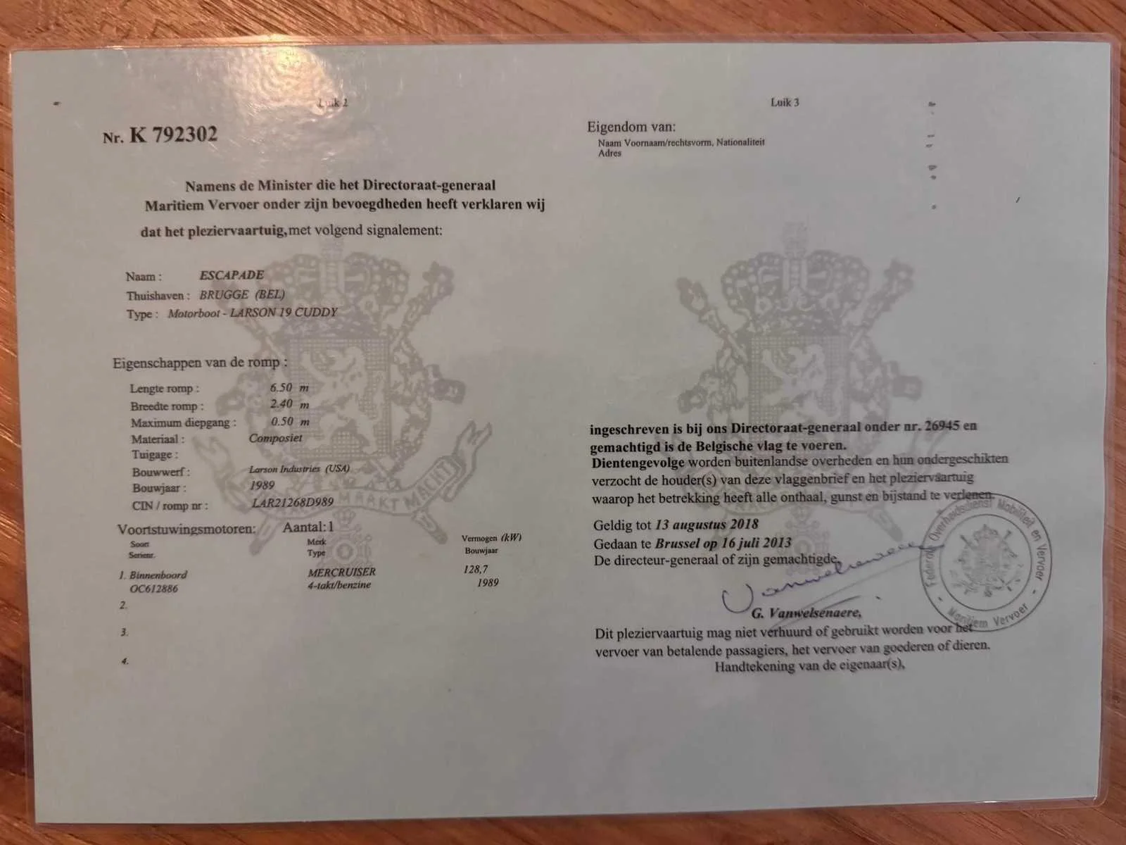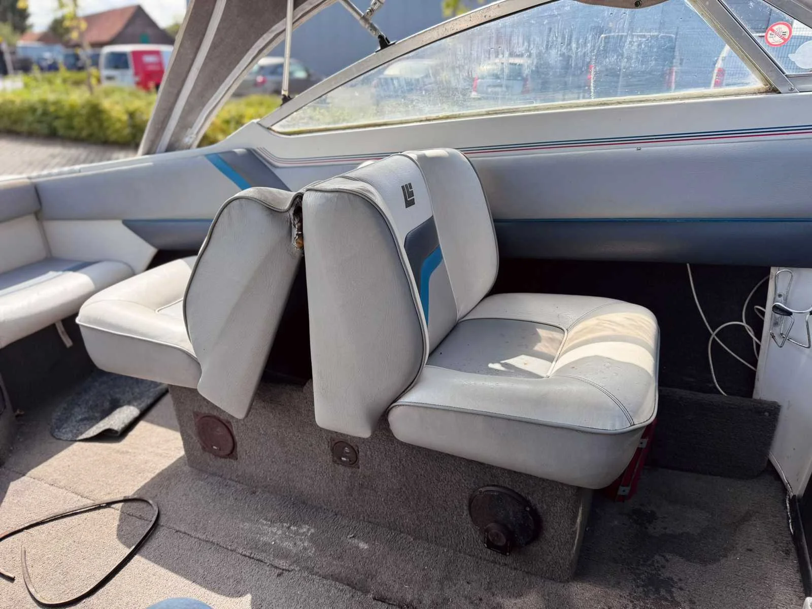 Nee Merk: Larson Type: 19 Cuddy “Escapade” Werf: Larson Boats (USA) Lengte: 6.5m Breedte: 2.5m Diepgang: 0.5m Bouwjaar: 1989 Rompmateriaal: Polyester (GRP) Aantal hutten: 1 Aantal slaapplaatsen: 2 Aantal motoren: 1 Merk motor: MerCruiser Vermogen (pk): 175hp Brandstof: Benzine